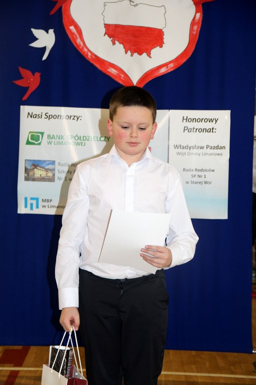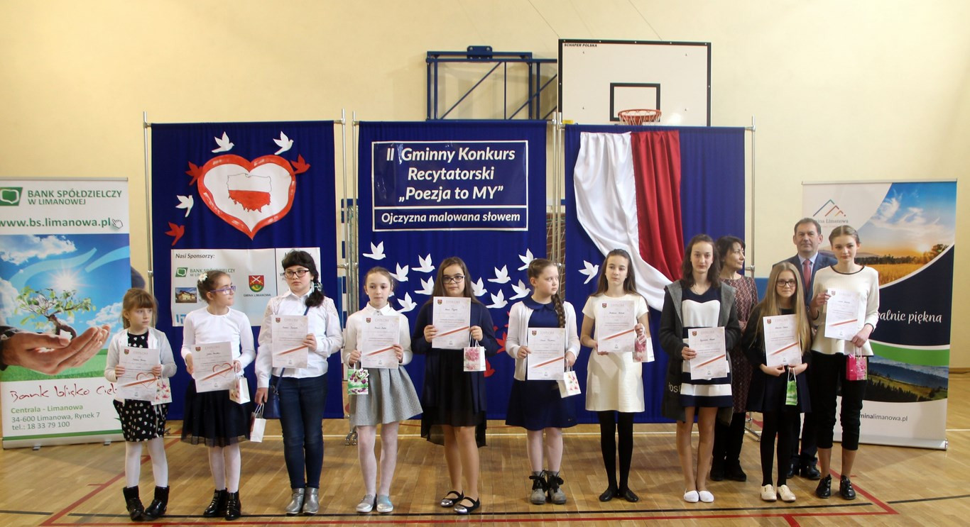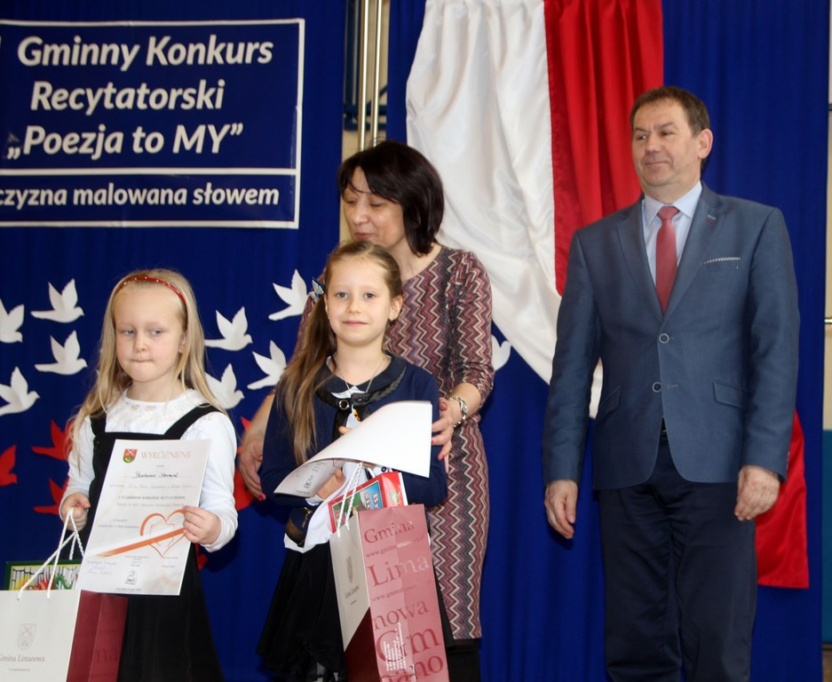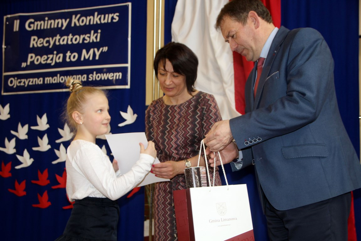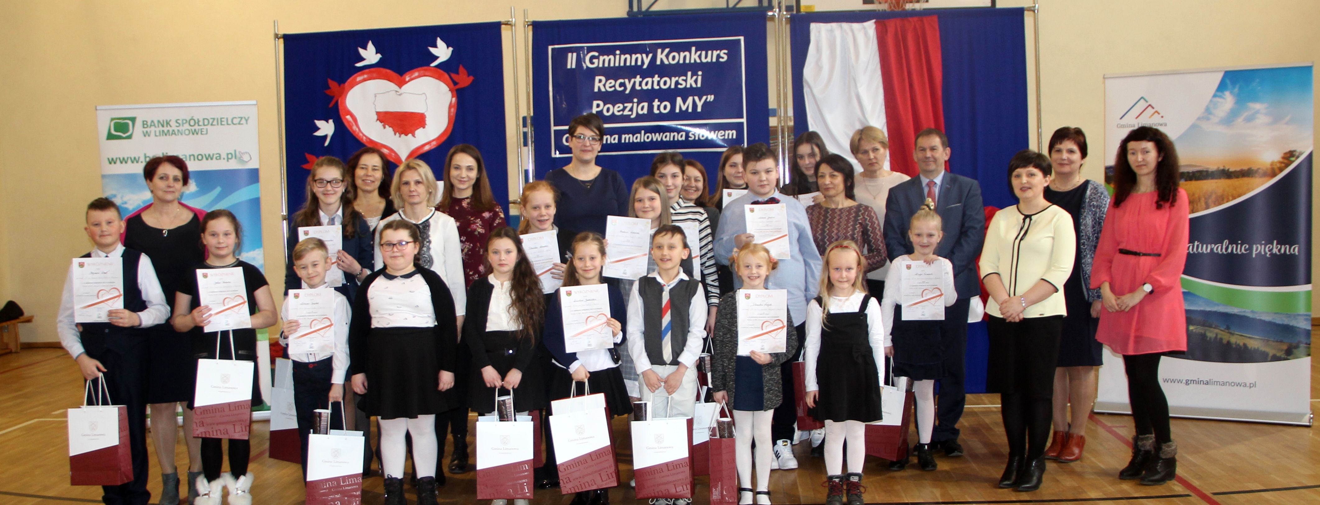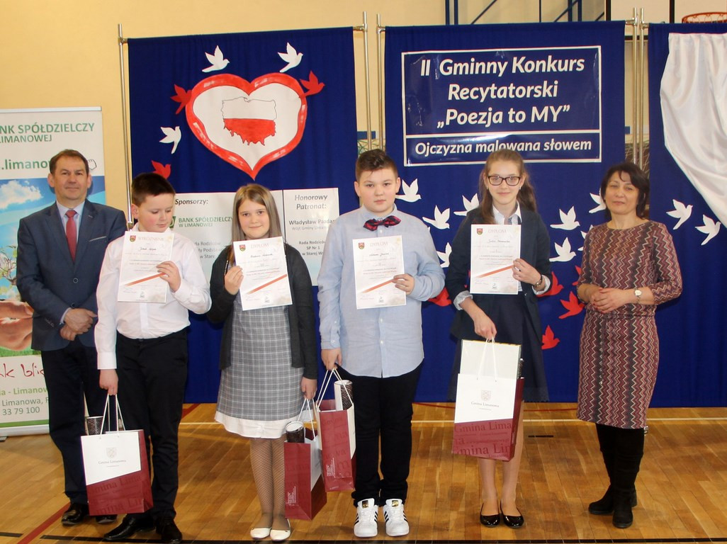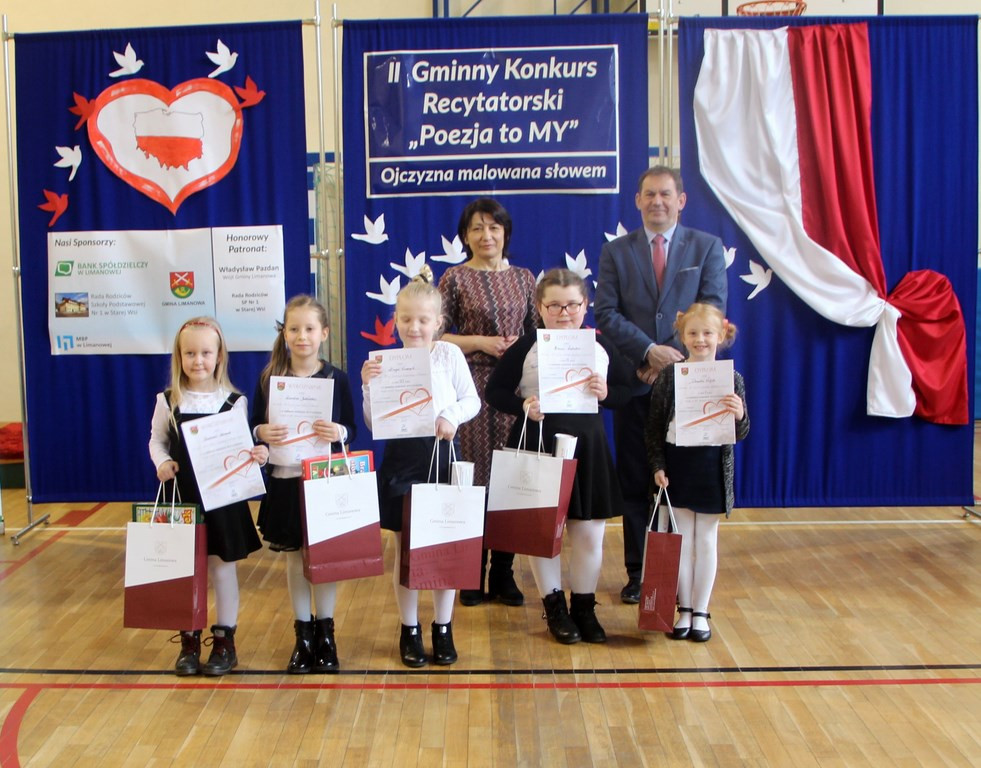 Laureaci II Gminnego Konkursu Recytatorskiego Poezja to MY. Ojczyzna malowana słowem, otrzymali z rąk Mariana Mąki - zastępcy Wójta Gminy Limanowa oraz Haliny Mąka - dyrektor SP nr 1 im Bohaterów Westerplatte w Starej Wsi nagrody rzeczowe i książkowe, a także pamiątkowe dyplomy. Nagrody dla laureatów zostały ufundowane przez Gminę Limanowa i Miejską Bibliotekę Publiczną w Limanowej. Pozostałym uczestnikom konkursu wręczone zostały nagrody pocieszenia oraz pamiątkowe dyplomy.