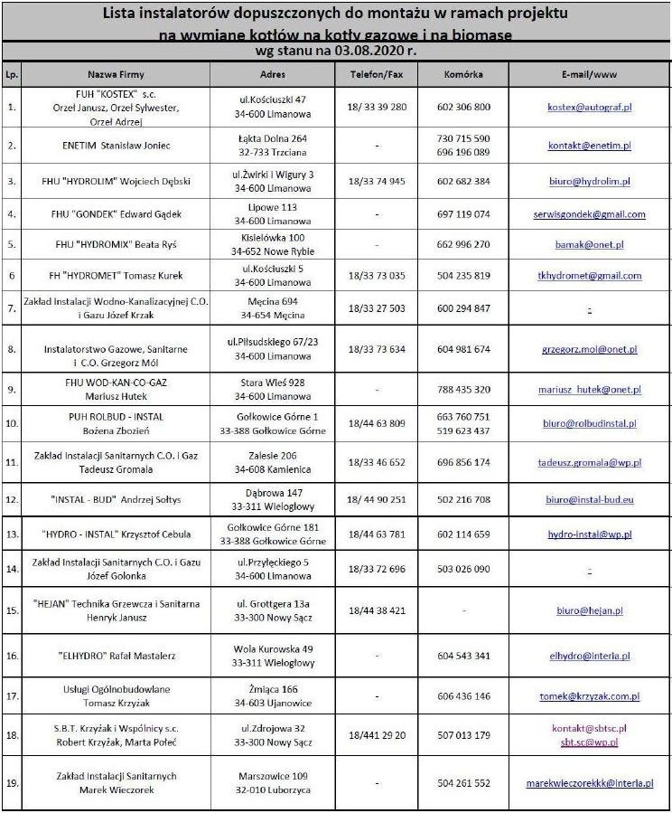Lista zakwalifikowanych wykonawców wg stanu na dzień 3 sierpnia 2020 r. ( wymiana kotłów na kotły gazowe i na biomasę):