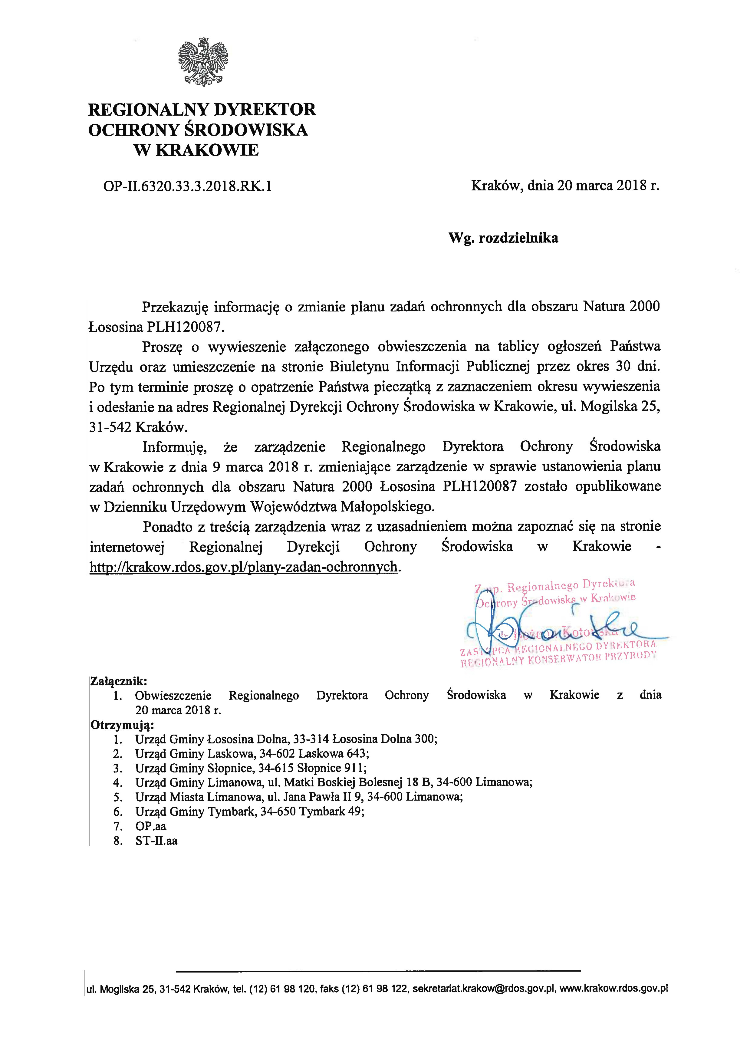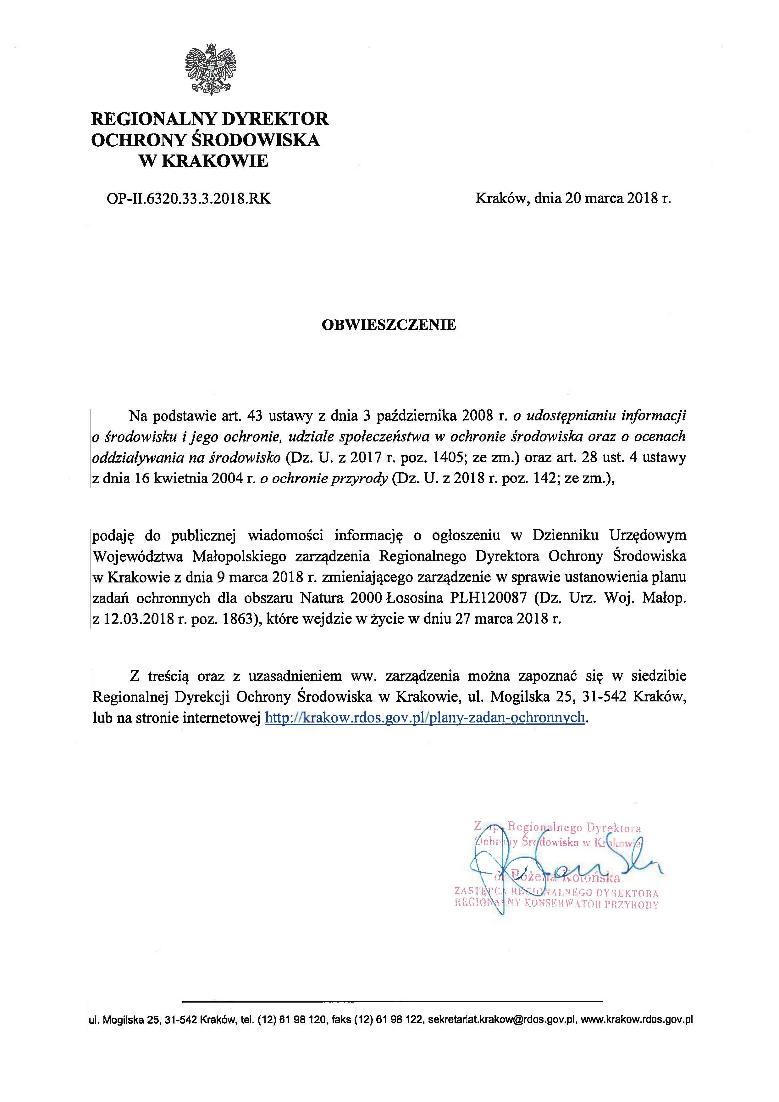 Regionalna Dyrekcja Ochrony Środowiska w Krakowie informuje  o ogłoszeniu w Dzienniku Urzędowym Województwa Małopolskiego zarządzenia Regionalnego Dyrektora Ochrony Środowiska w Krakowie z dnia 09.03.2018 r. zmieniającego zarządzenie w sprawie ustanowienia planu zadań ochronnych dla obszaru Natura 2000 Łososina PLH120087.