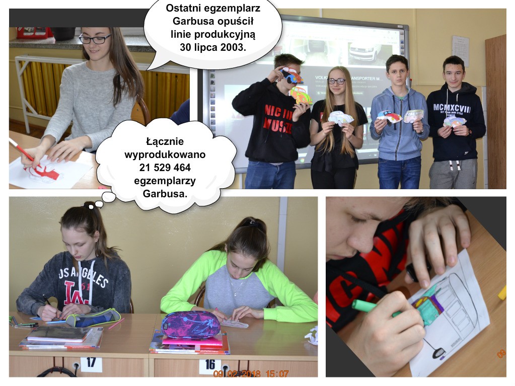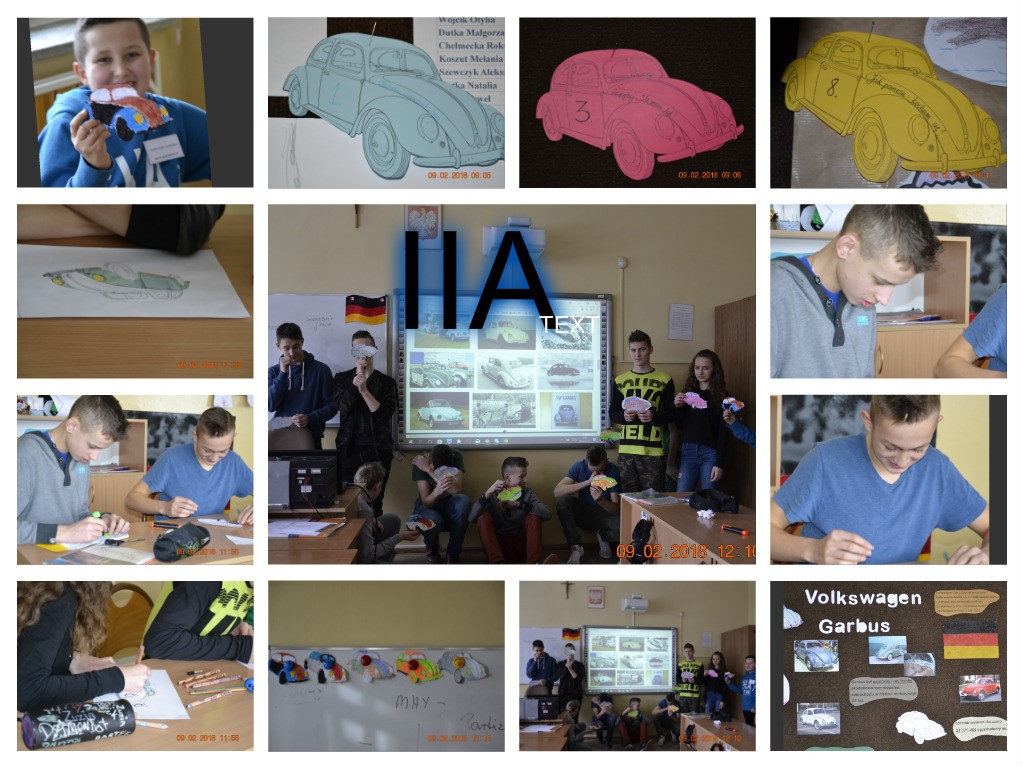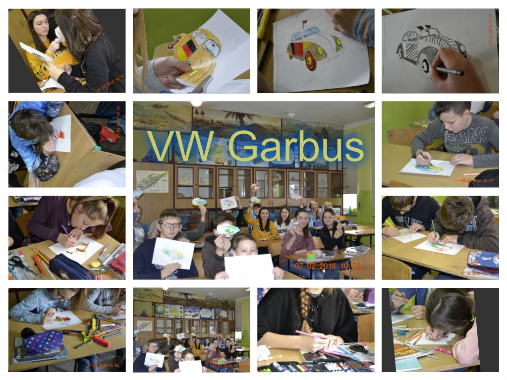 Nie zabrakło też atrakcji dla miłośników niemieckiej motoryzacji. Wykonane zostały plakaty, które przyozdobiły szkolny korytarz. Uczniowie mieli okazję poznać historię VW Garbusa oraz zaprojektować jego karoserię. W zabawie polegającej na poszukiwaniu garbusów zaangażowała się szczególnie klasa V. Uczniowie tej klasy pomimo tego, że przygodę z językiem niemieckim zaczną dopiero w VII klasie, całkiem nieźle poradzili sobie z udzieleniem odpowiedzi na pytania, które znajdowały się na ukrytych papierowych garbusach.