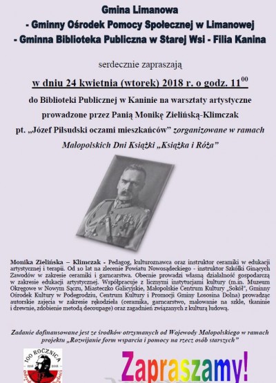 - 24 kwietnia - Biblioteka w Kaninie - warsztaty artystyczne prowadzone przez Monikę Zielińską - Klimczak pt.: "Józef Piłsudski oczami mieszkańców" .