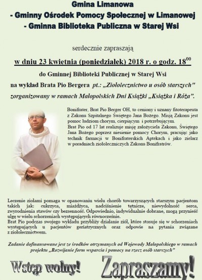 - 23 kwietnia - GBP w Starej Wsi: wykład Brata Pio Bergera pt.: „Ziołolecznictwo u osób starszych". Zadanie dofinansowane jest ze środków otrzymanych od Wojewody Małopolskiego w ramach projektu "Rozwijanie form wsparcia i pomocy na rzecz osób starszych"