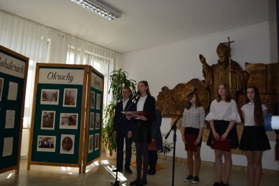 Nie zabrakło również odniesienia do naszych rodaków, Ferdynanda Piwowara i Władysława Pociechy, poległych w 1940 roku z rąk funkcjonariuszy NKWD. Podczas występu przedstawiono ich życiorysy, wzbogacając je prezentacją multimedialną. Fakty dotyczące zbrodni katyńskiej przeplatały się z poezją i utworami muzycznymi, których nastrojowość i liryczny wydźwięk dostarczyły oglądającym wielu wzruszeń. Dobitnie również wybrzmiały słowa Patrona szkoły – Jana Pawła II, który był zagorzałym orędownikiem pamięci narodowej. Apelując do rodaków podczas jednej z pielgrzymek do Polski, dał dowód swojego przywiązania do kraju tymi słowami: „