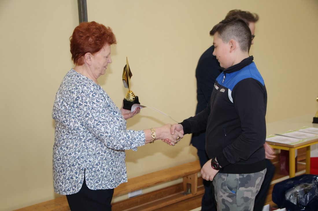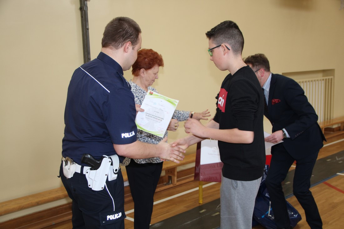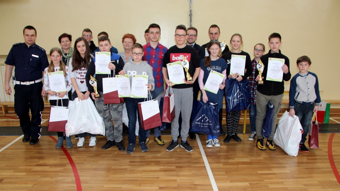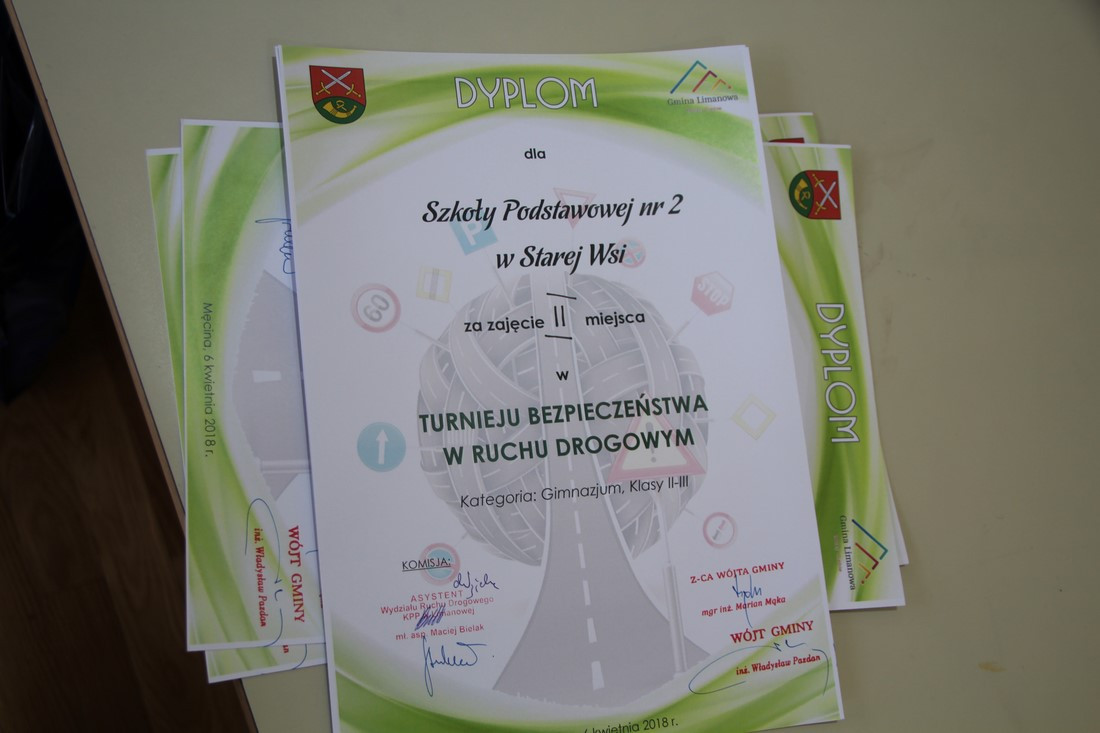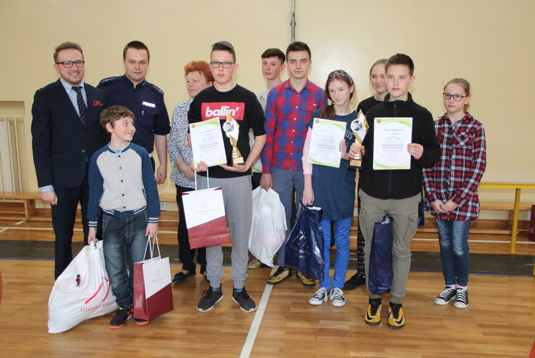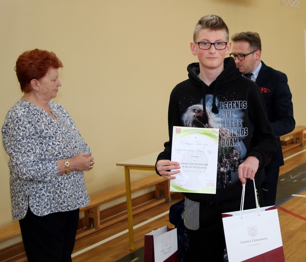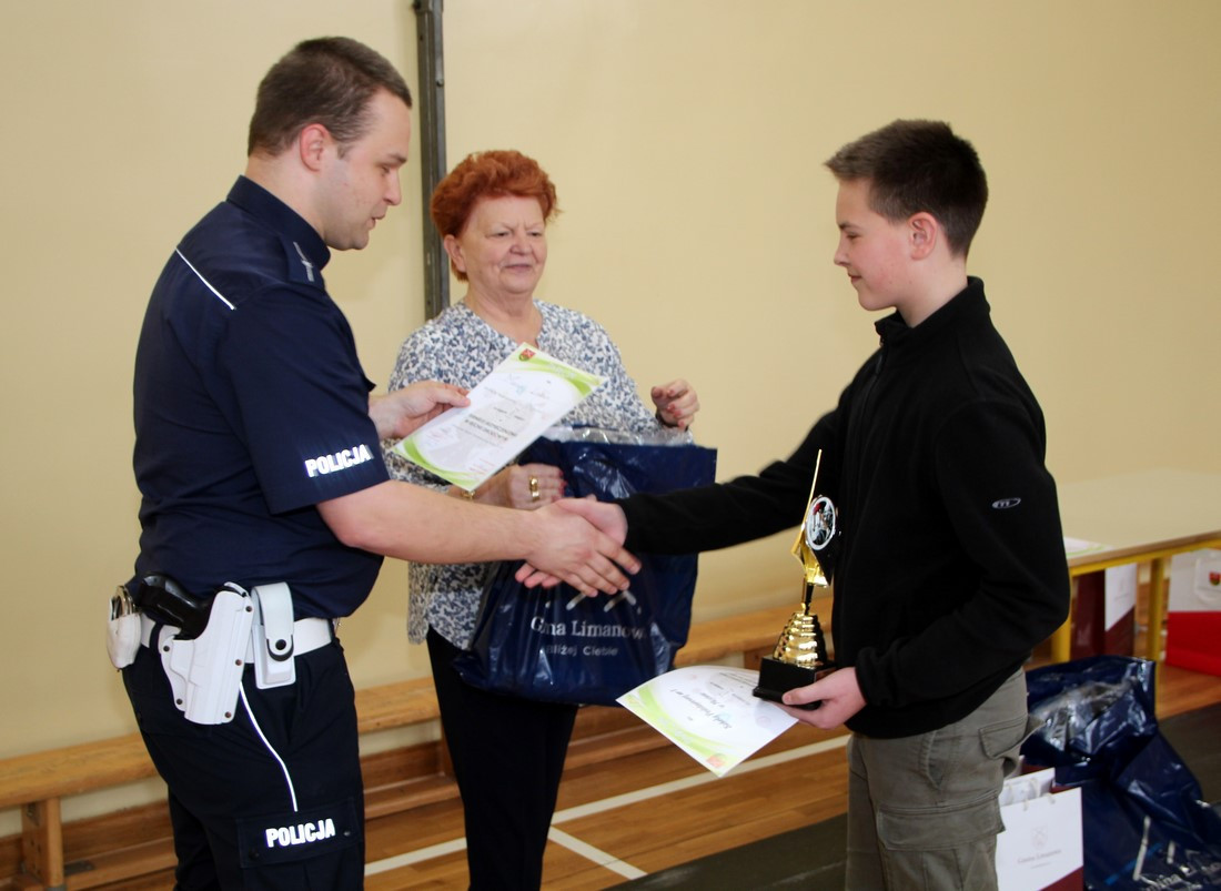 Wszyscy uczestnicy Turnieju zarówno drużynowo, jak i indywidualnie otrzymali dyplomy oraz nagrody rzeczowe ufundowane przez Urząd Gminy Limanowa. Nagrody wręczali: Kierownik Wydziału Kultury i Promocji UG Limanowa – Wojciech Korabik, Dyrektor Zespołu Szkół nr 1 w Męcinie - Maria Lupa oraz mł. asp. Maciej Bielak z KPP Limanowa.