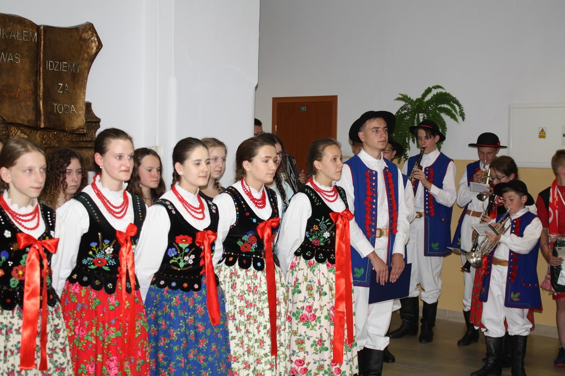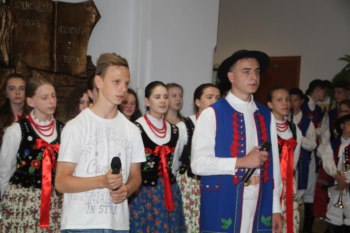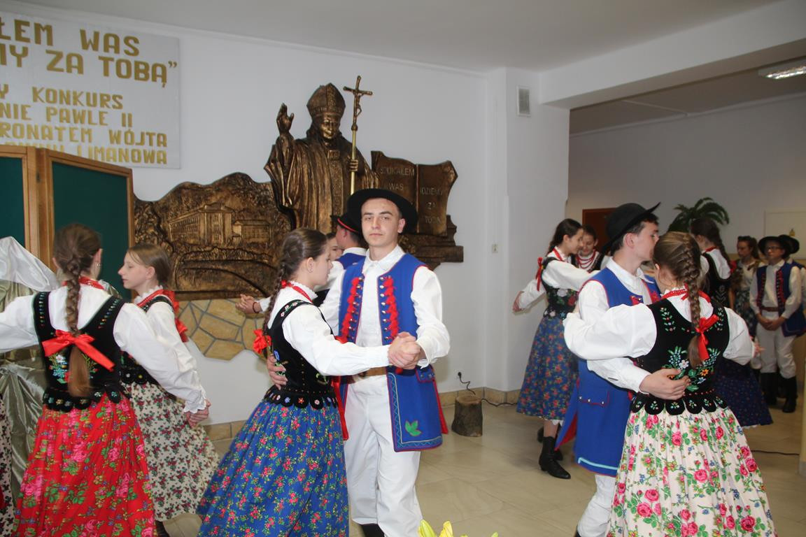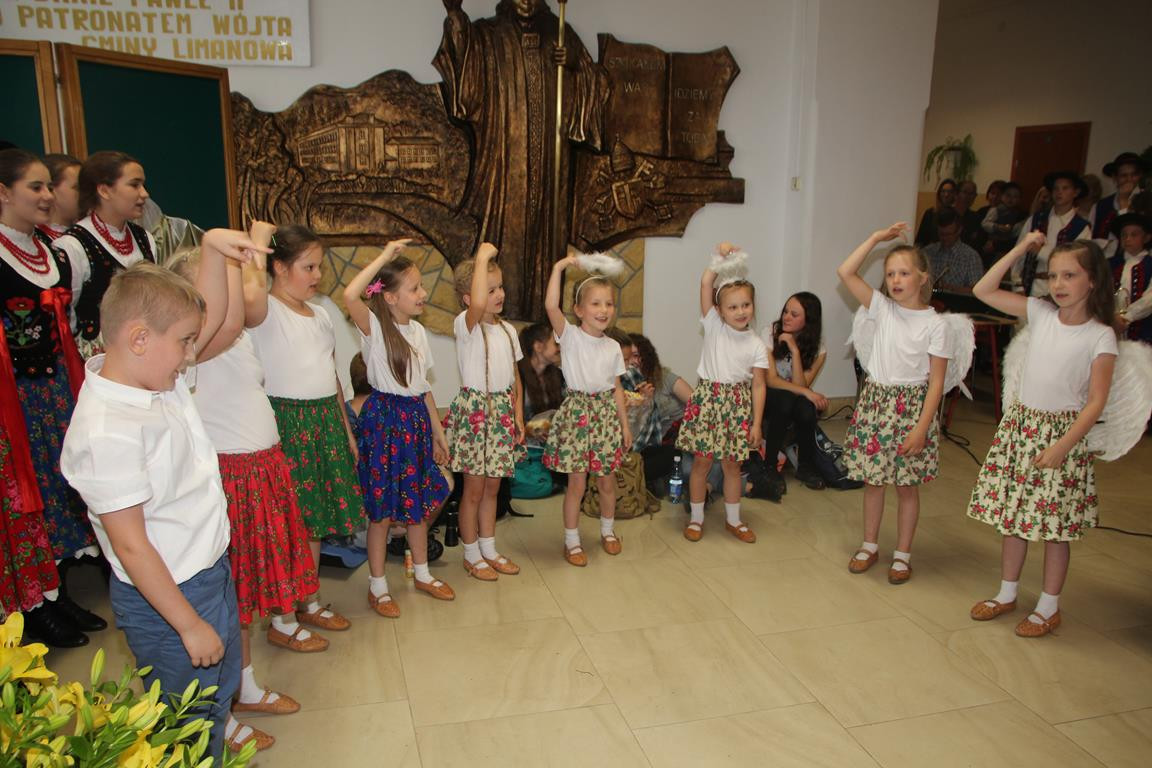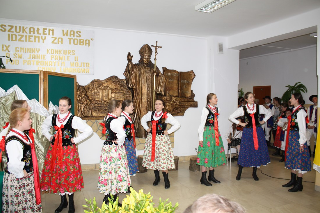Po emocjach związanych z rozdaniem nagród i wystąpieniach gości nadszedł czas na część artystyczną, w której zaprezentowali się najmłodsi i najstarsi członkowie zespołu regionalnego „Mali Męcinianie” oraz młodzież realizująca projekt edukacyjny „Sportowe pasje Jana Pawła II”. Pieśni poświęcone Ojcu Świętemu przeplatały się ze scenkami zawierającymi anegdoty związane z Patronem szkoły.