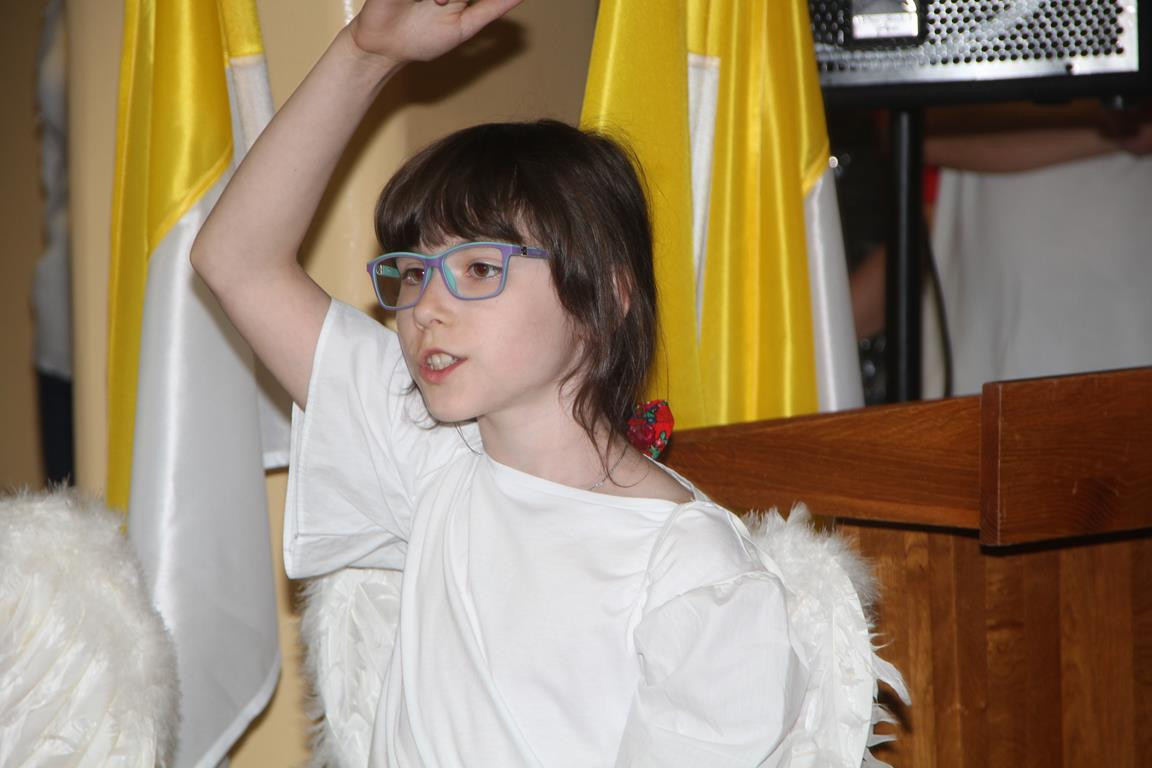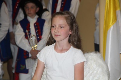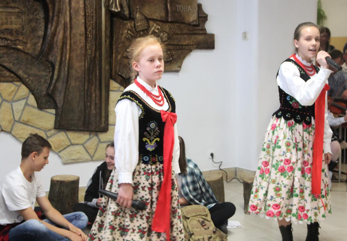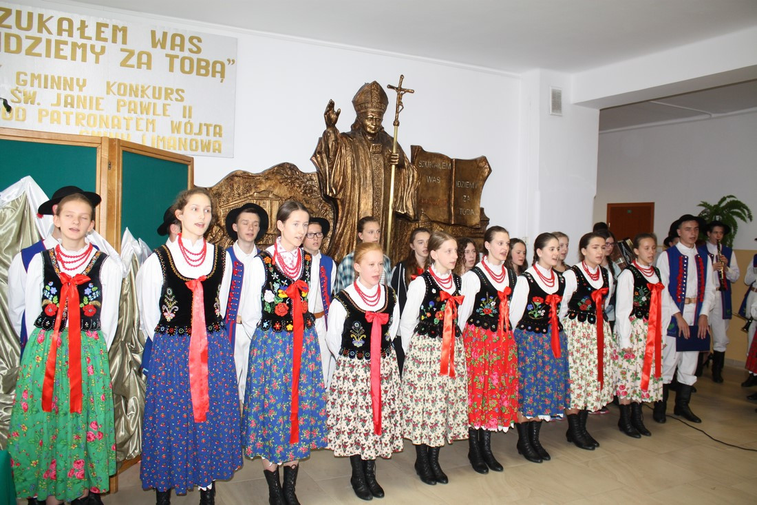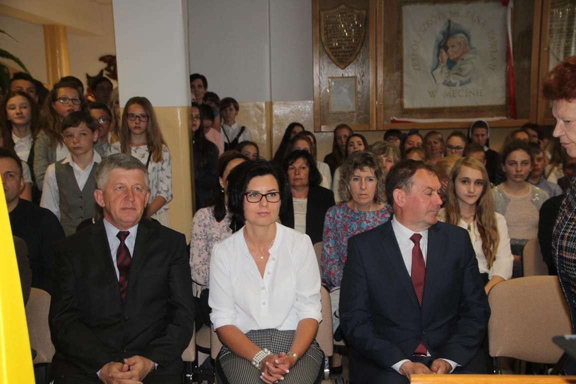 Po emocjach związanych z rozdaniem nagród i wystąpieniach gości nadszedł czas na część artystyczną, w której zaprezentowali się najmłodsi i najstarsi członkowie zespołu regionalnego „Mali Męcinianie” oraz młodzież realizująca projekt edukacyjny „Sportowe pasje Jana Pawła II”. Pieśni poświęcone Ojcu Świętemu przeplatały się ze scenkami zawierającymi anegdoty związane z Patronem szkoły.