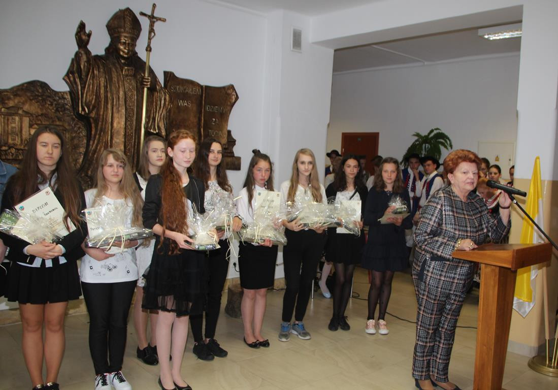 Na zakończenie Dyrektor Szkoły zachęciła uczniów do wzięcia udziału w kolejnej – jubileuszowej edycji konkursu, a następnie zaprosiła wszystkich uczestników i ich opiekunów na papieską kremówkę.