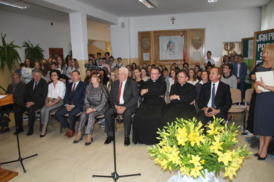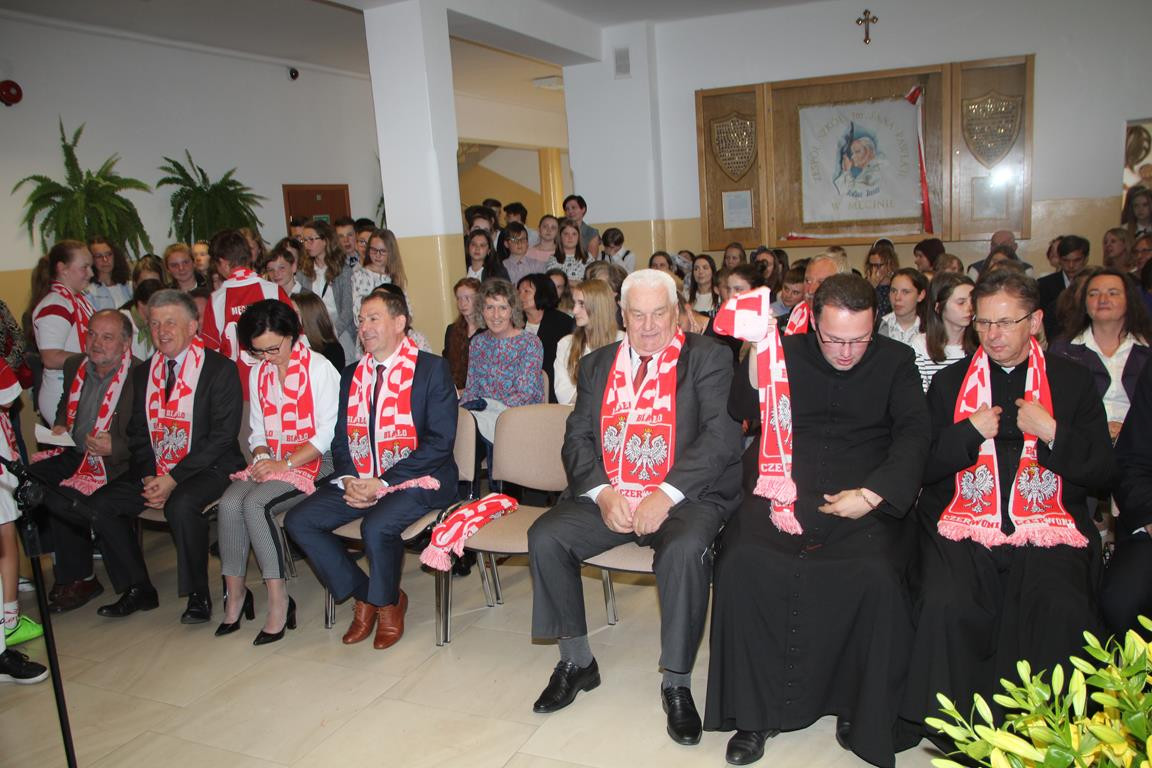 Obchody uroczystości rozpoczęła Msza Święta z udziałem pocztu sztandarowego celebrowana przez księdza proboszcza i katechetę. Podczas homilii zostały przywołane dowody na to, że Patron szkoły jest wciąż obecny w naszym życiu poprzez liczne świadectwa osób, które miały możliwość osobiście spotkać się z Ojcem Świętym. Ponadto bogaty dorobek literacki, będący kanwą różnorodnych konkursów poświęconych Janowi Pawłowi II, jak również wędrowanie Jego szlakami sprawiają, że dzieci i młodzież czują swoistą obecność Patrona. Eucharystia została ubogacona poprzez występ scholi złożonej zarówno z najmłodszych, jak i najstarszych uczniów naszej szkoły.