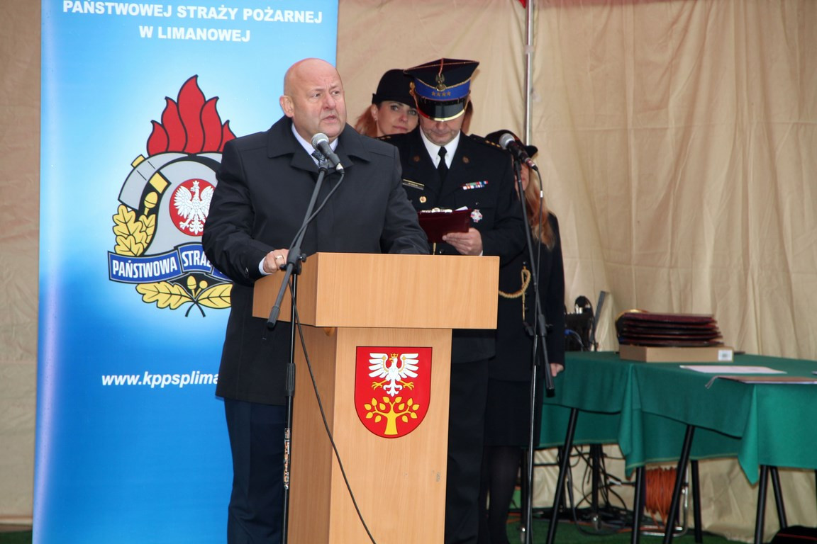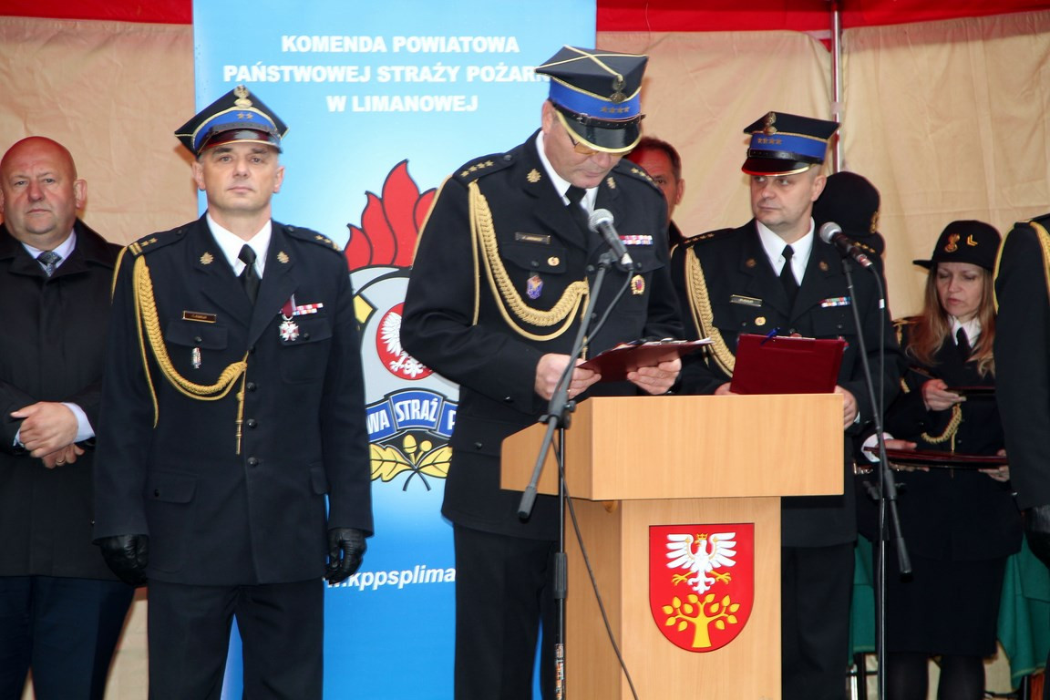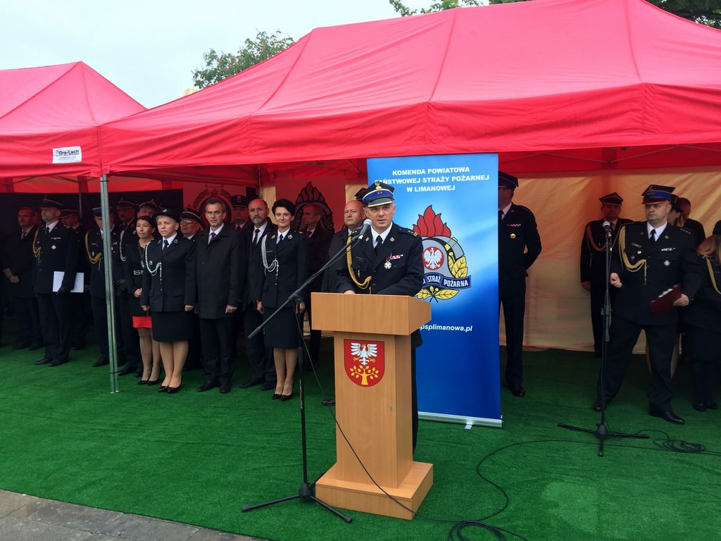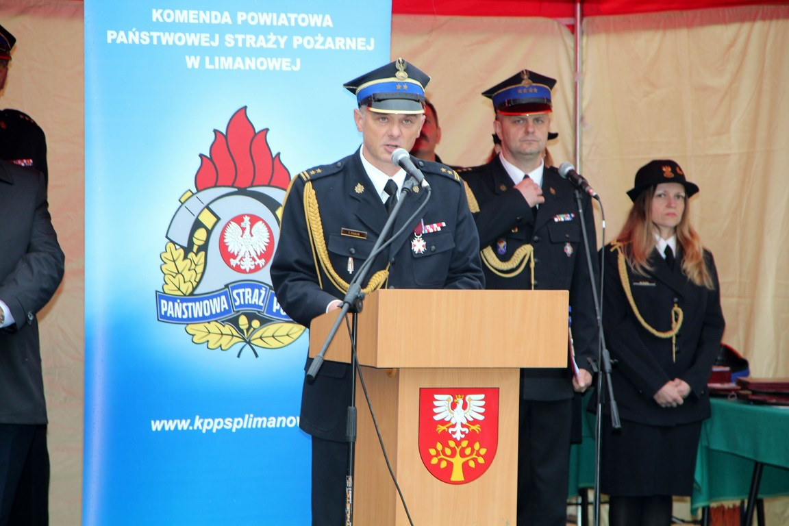 Po przeglądzie pododdziałów bryg. Tomasz Pawlik, pełniący obowiązki Komendanta Powiatowego Państwowej Straży Pożarnej w Limanowej przywitał przedstawicieli władz wojewódzkich, powiatowych oraz lokalnych samorządów.