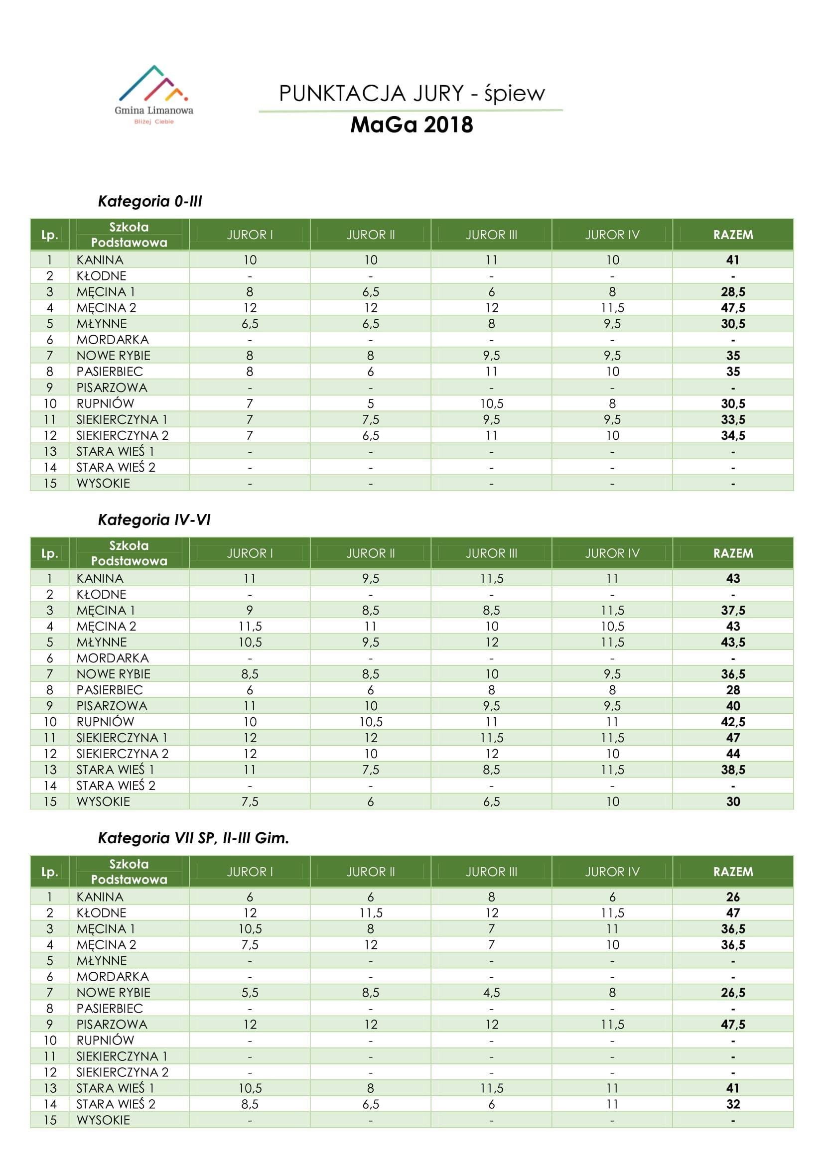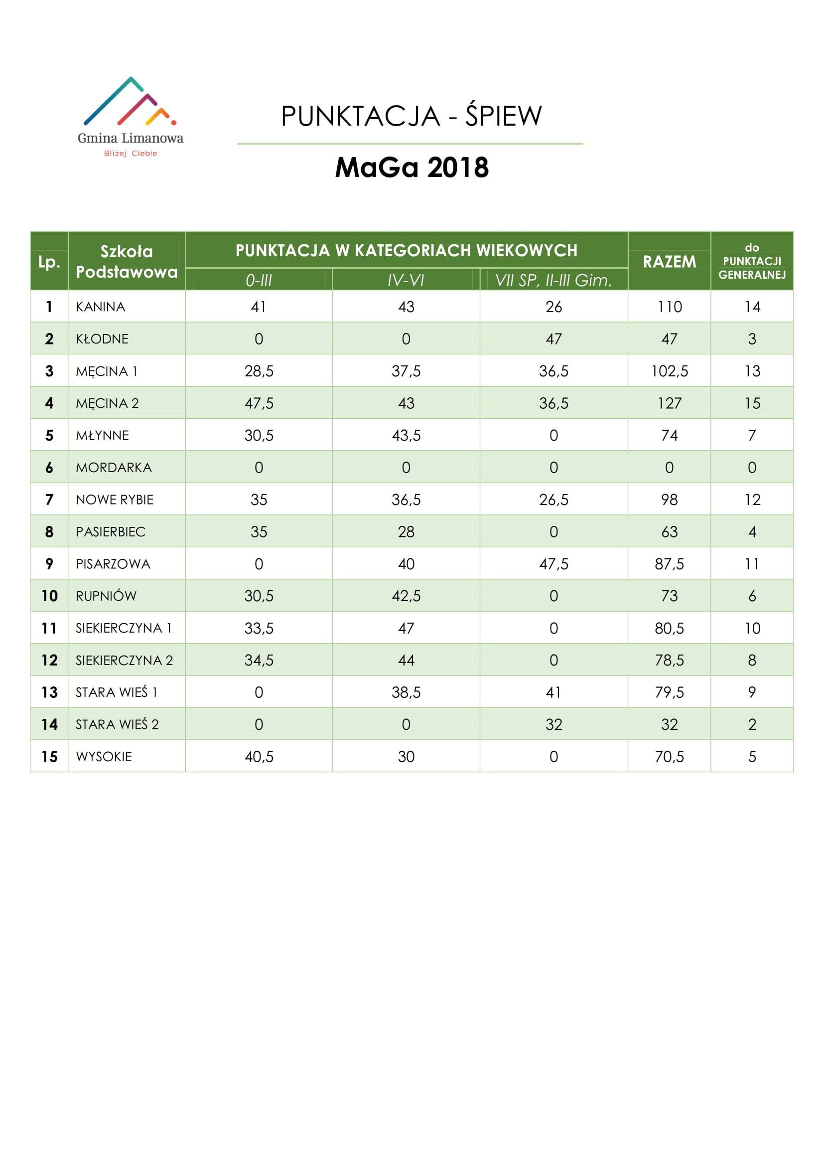 Pora również na podsumowanie konkursu śpiewu. Laureatów znamy a poniżej przedstawiamy tabele z poszczególnymi wynikami. Jurorzy mieli do rozdysponowania 12 pkt i taką maksymalną ilość mogł uzyskać uczesnik od każdego, tym samym szkoła mogła otrzymać 48 punktów (4 jurorów). w każdej kategorii wiekowej Po przeliczeniu wszystkich trzech kategorii placówka otrzymała określoną ilość punktów od miejsca pierwszego do piętnastego ( ilość placówek zgłoszonych do przeglądu). Analogicznie za otrzymane miejsce pierwsze w określonym konkursie ( śpiew , teatr, taniec) 15 punktów a za miejsce 15 ( jeżeli uczestniczy w konkursie 1 pkt jezeli nie 0). Dodatkowe trzy punkty otrzymuje placowka jeżeli zostanie przyznane Grand Prix konkursu.