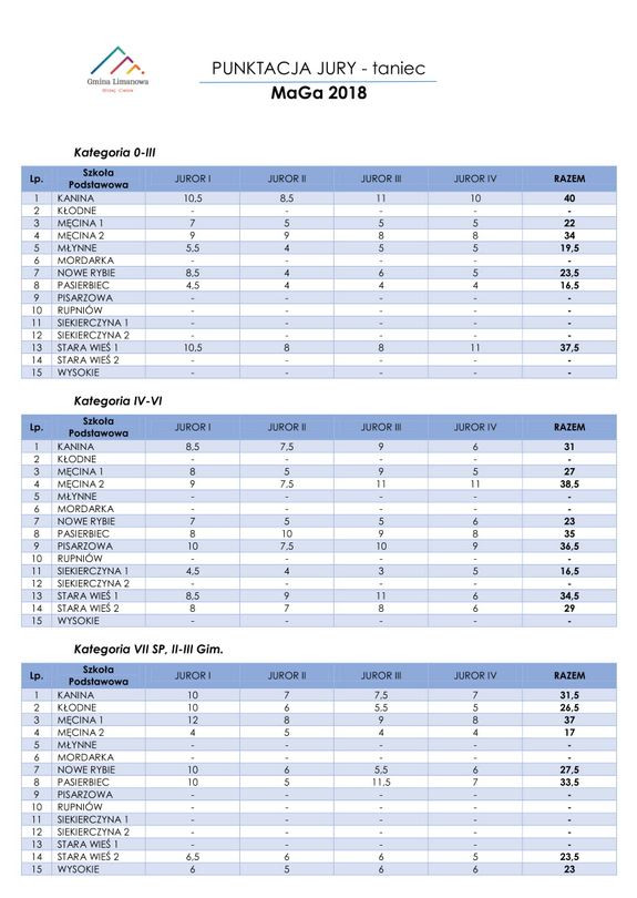 Tabele z punktacją po konkursie tańca: