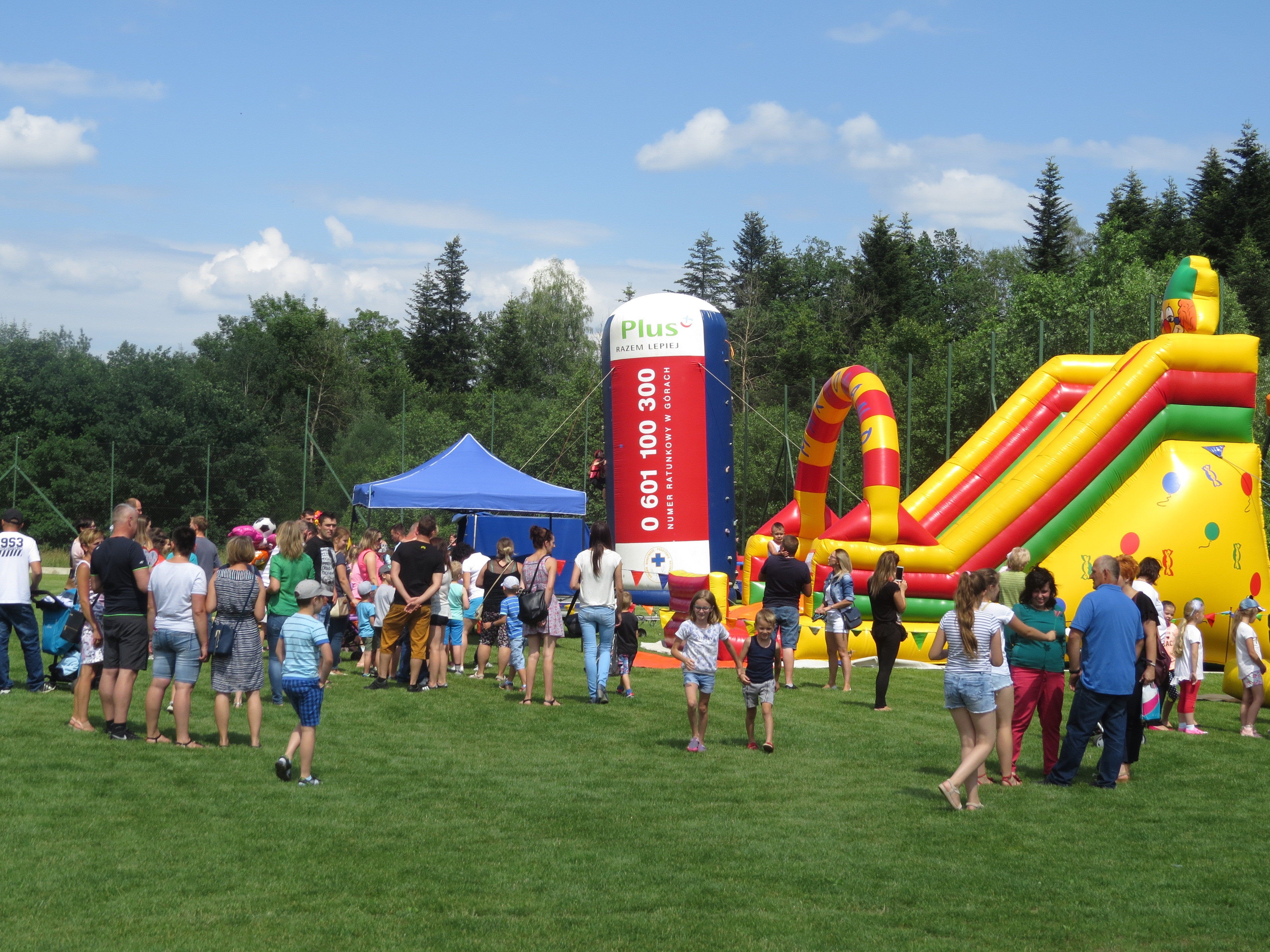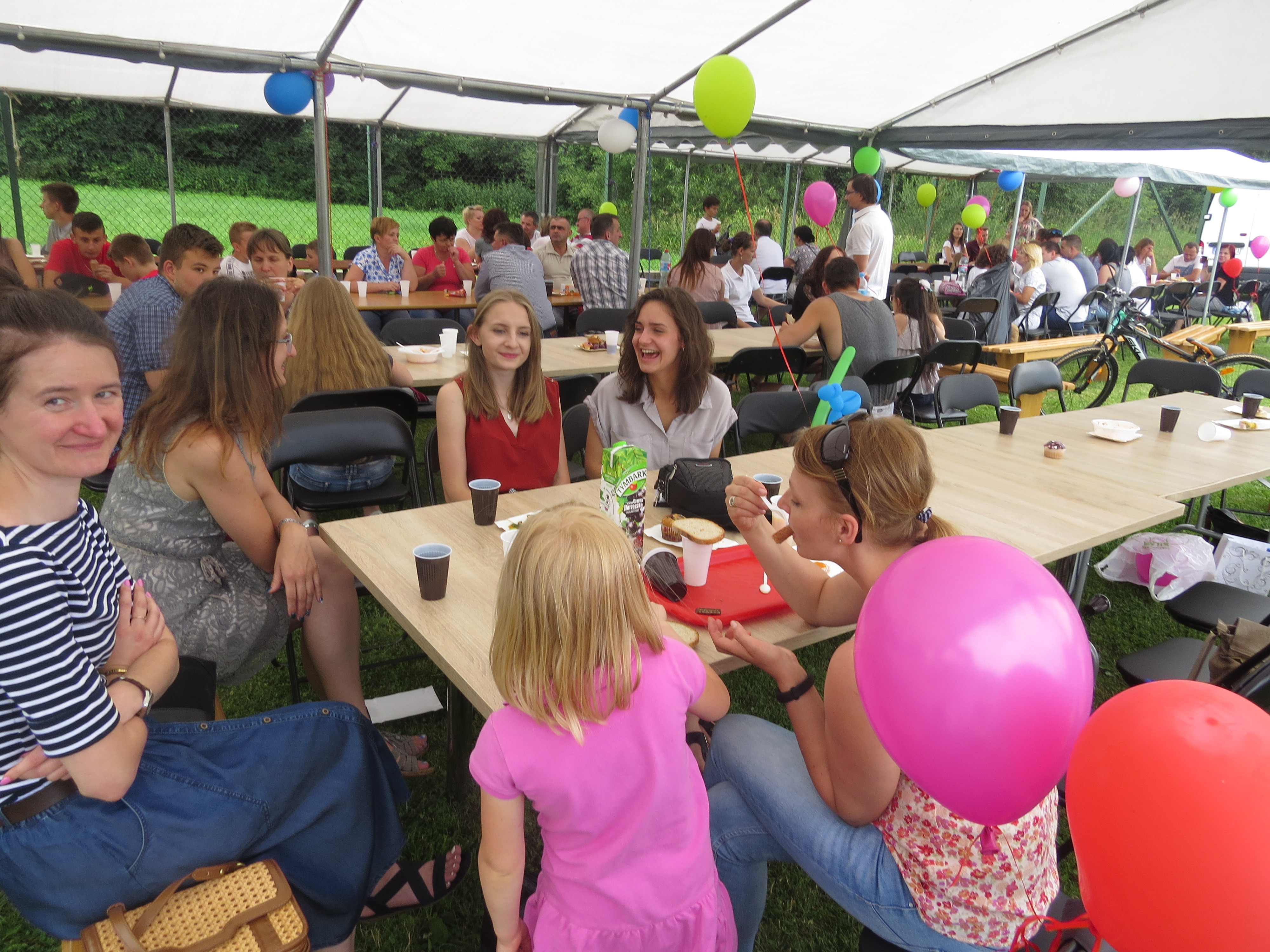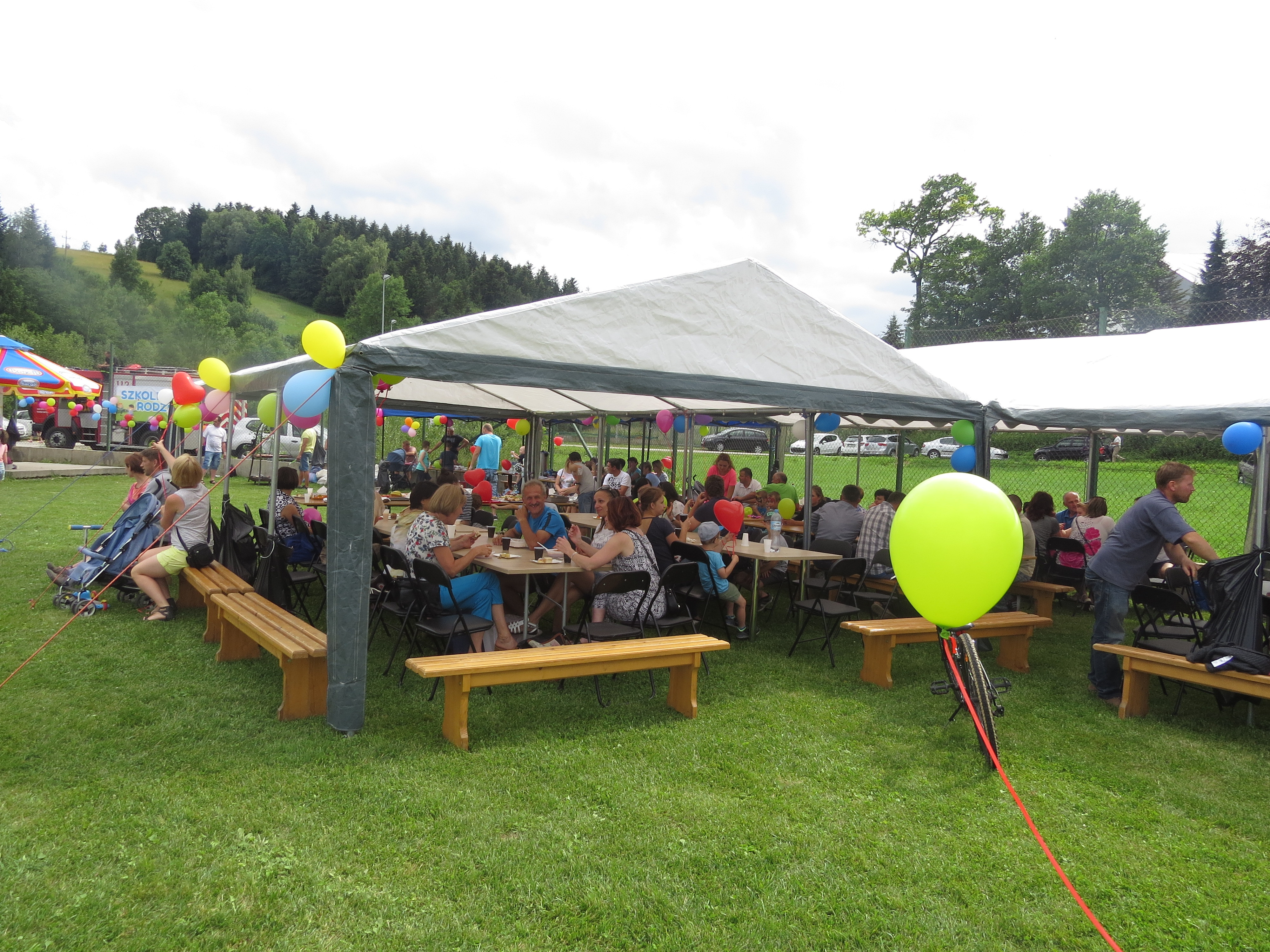 Następnie rozpoczęła się degustacja różnorodnych potraw. Pyszne przekąski i ciasteczka wszystkim przypadły do gustu. Dzieci chętnie brały udział w wielu atrakcjach i konkursach przygotowanych przez ubranych w barwne stroje animatorów. Najmłodsi mieli do dyspozycji również zjeżdżalnię, dmuchany zamek i ściankę wspinaczkową. Dużym zainteresowaniem cieszyło się stoisko, na którym sympatyczne panie wyczarowywały na buziach dziewczynek i chłopców postaci z różnych bajek. Dzieci z dużym zaangażowaniem tworzyły także figurki z masy solnej, które później z dumą prezentowały rodzicom. Bardzo interesujący był również pokaz przygotowany przez miejscowych strażaków. Wszyscy byli pod wrażeniem ich sprawności i precyzji. Na szczęście w tym roku pogoda sprzyjała i uczestnicy mogli przez kilka godzin cieszyć się swoim towarzystwem, spędzając ten czas na rozmowach i zabawie.