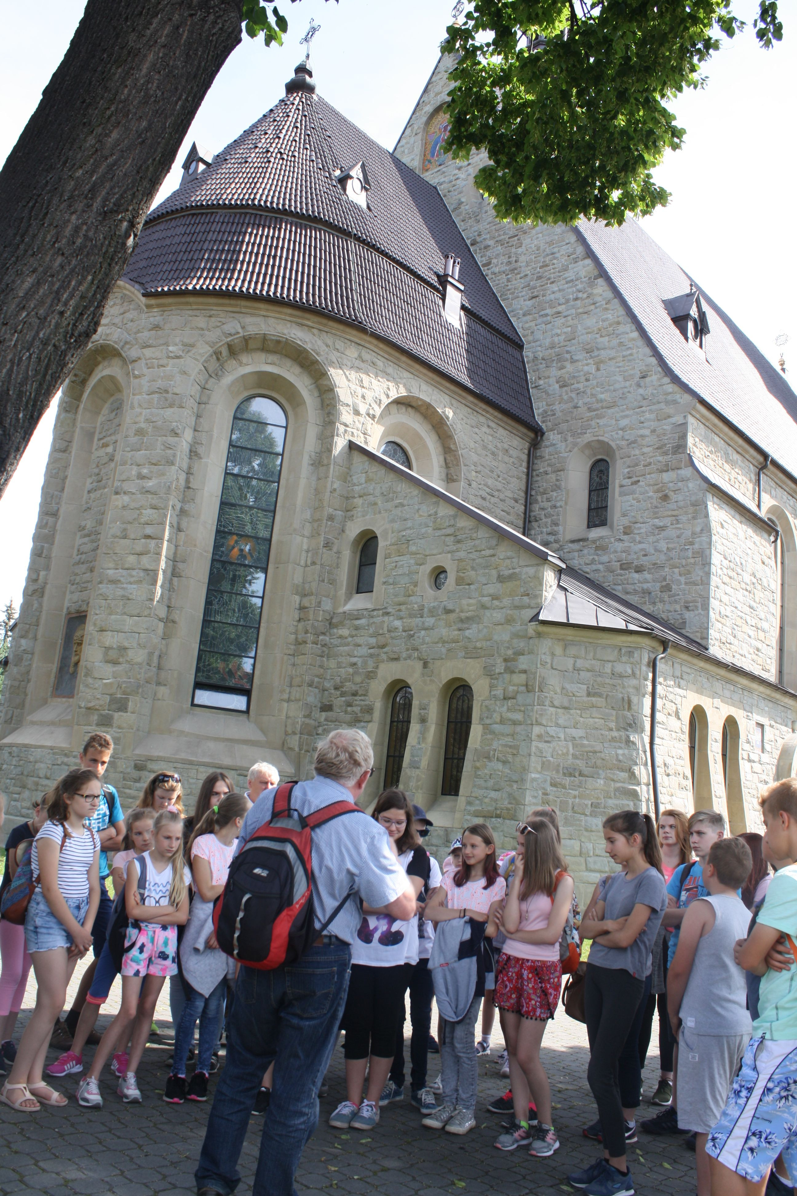 Śladami niepodległości po Ziemi Limanowskiej”. W wyjeździe wzięły udział dzieci i młodzież ze wszystkich bibliotek publicznych gminy Limanowa, dyrektor Jacenty Musiał oraz bibliotekarki. Wiedzą służył doświadczony przewodnik Stefan Bugajski. Uczestnicy zwiedzanie rozpoczęli od Bazyliki Matki Boskiej Bolesnej. Tu zobaczyli i dowiedzieli się więcej o elementach patriotycznych w architekturze tej świątyni.