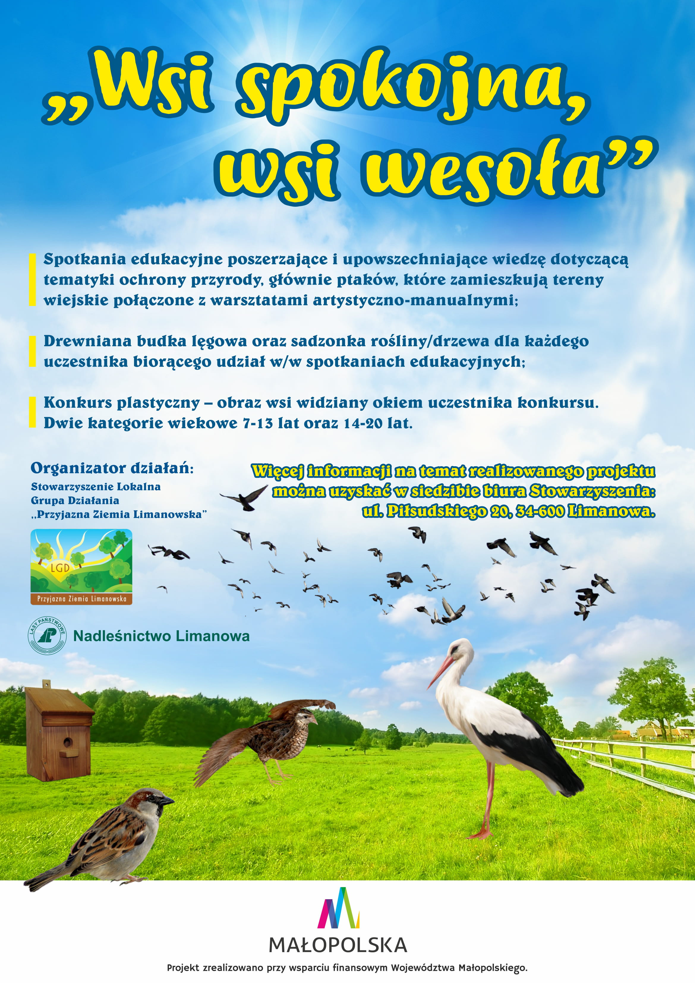 W ramach działań projektowych planuje się m.in. spotkania edukacyjne poszerzające i upowszechniające wiedzę dotyczącą tematyki ochrony przyrody, głównie ptaków, które zamieszkują tereny wiejskie połączone z warsztatami artystyczno-manualnymi; drewniana budka lęgowa oraz sadzonka rośliny/drzewa dla każdego uczestnika biorącego udział w/w spotkaniach edukacyjnych; konkurs plastyczny – obraz wsi widziany okiem uczestnika konkursu. Dwie kategorie wiekowe 7-13 lat oraz 14-20 lat.