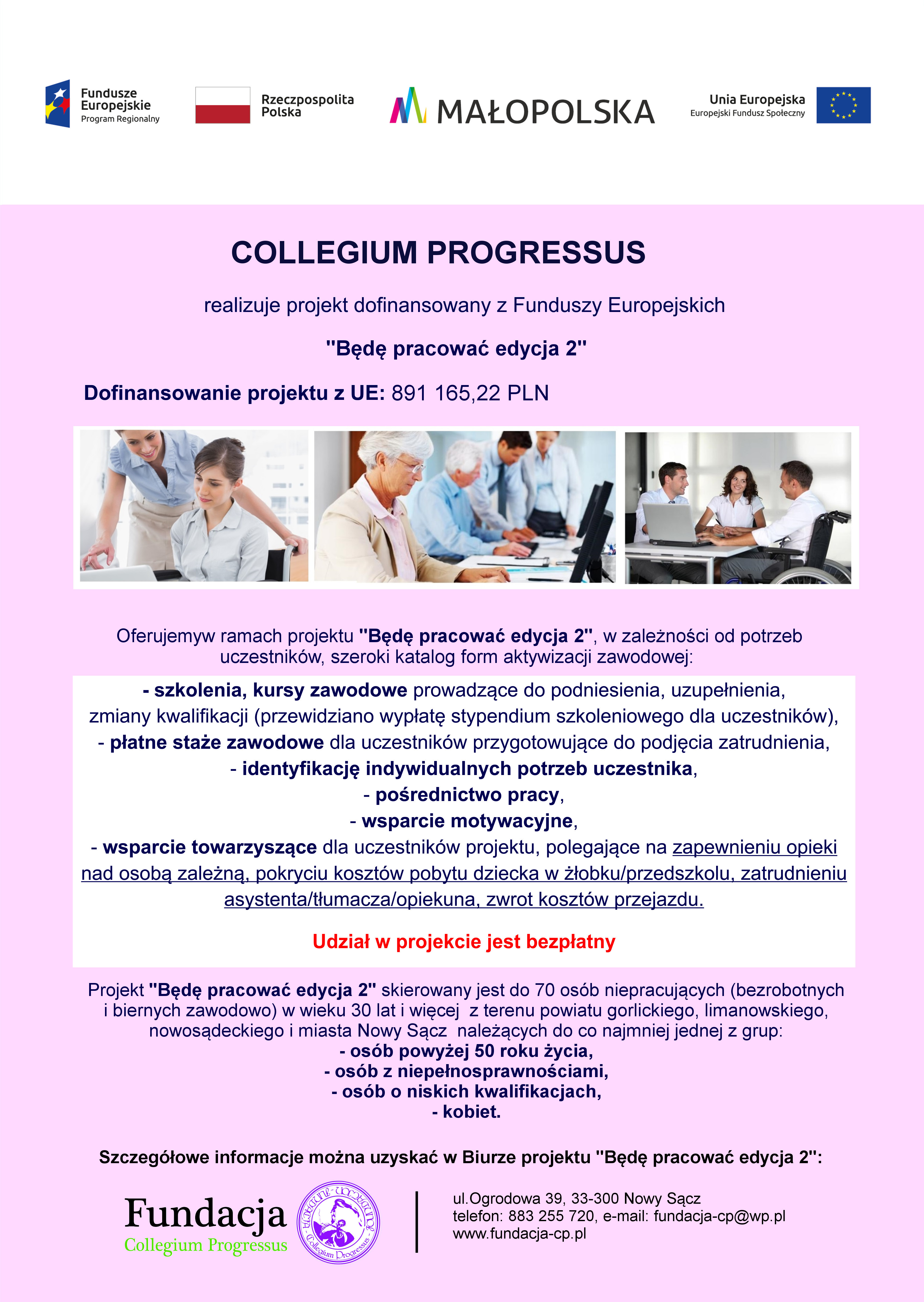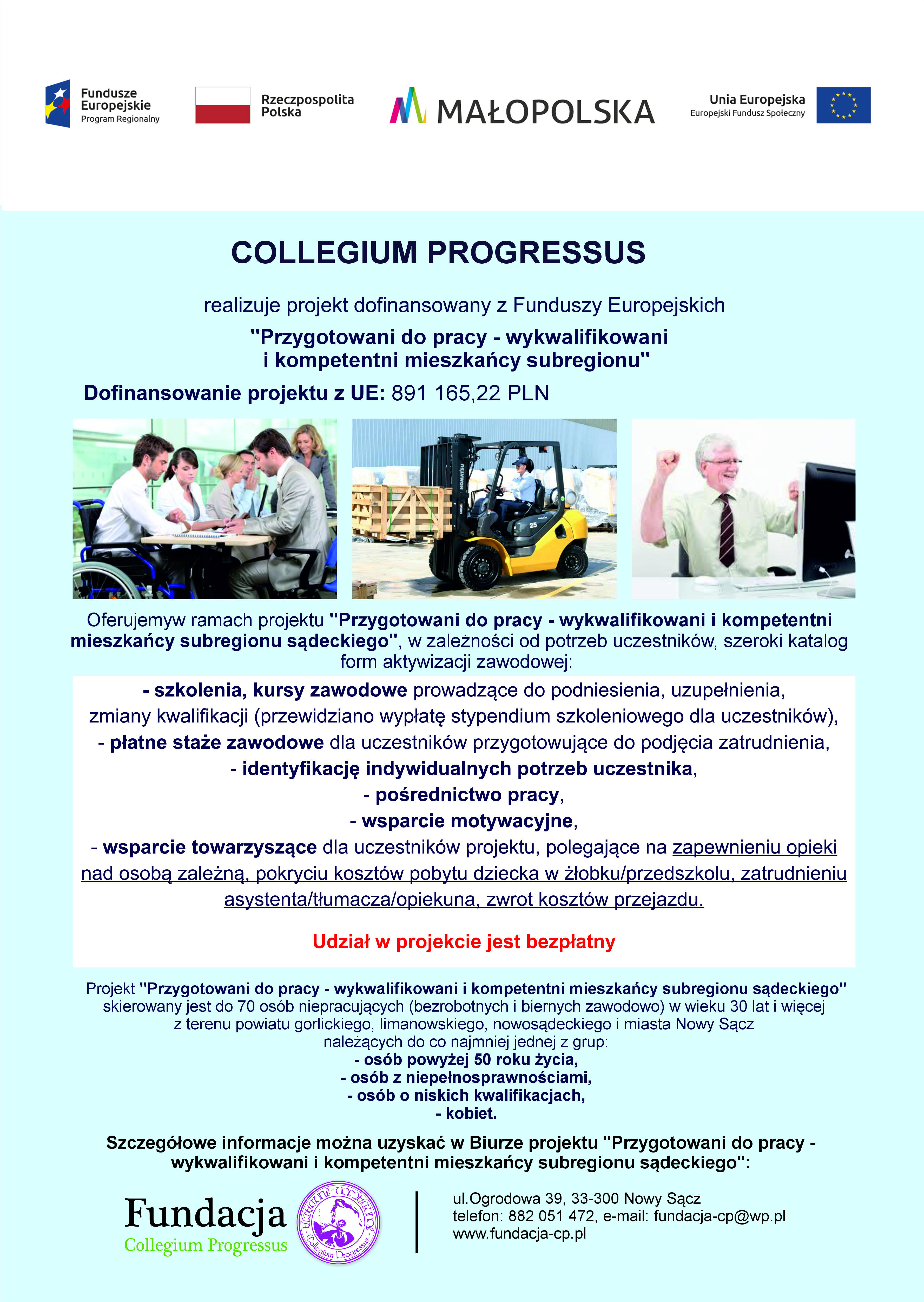 Fundacja Collegium Progressus od 01.08.2018 r. do 30.06.2020 r. na terenie powiatu gorlickiego, limanowskiego, nowosądeckiego oraz Miasta Nowy Sącz realizuje projekt pn. „Będę pracować edycja 2" oraz projekt pn. „Przygotowani do pracy - wykwalifikowani i kompetentni mieszkańcy subregionu sądeckiego" w ramach Regionalnego Programu Operacyjnego Województwa Małopolskiego na lata 2014-2020, 8 Oś Priorytetowa Rynek pracy, Działanie 8.2 Aktywizacja zawodowa.