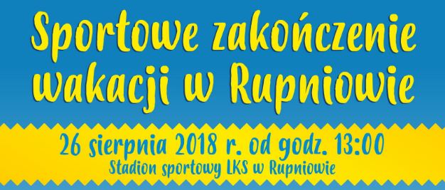 W dniu 26 sierpnia 2018 r. od godziny 13:00 na stadionie sportowym LKS Rupniów odbędzie się festyn sportowy pn. „SPORTOWE ZAKOŃCZENIE WAKACJI W RUPNIOWIE”. Impreza ma charakter ogólnodostępny i bezpłatny, a jej główny cel to integracja wewnątrz i między pokoleniowa poprzez udział we współzawodnictwie sportowym, które ma na celu popularyzowanie kultury fizycznej oraz promowanie aktywnych form spędzania wolnego czasu.
