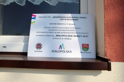 z programu „Małopolskie remizy” wykonano „Modernizację budynku remizy OSP w Wysokiem”, obejmującego m.in. wymianę okładziny schodów zewnętrznych, wymianę posadzki wejścia do budynku, wykonanie okładziny ścian w kotłowni i komunikacji do garażu oraz malowanie elewacji budynku. Całkowity koszt zadania to