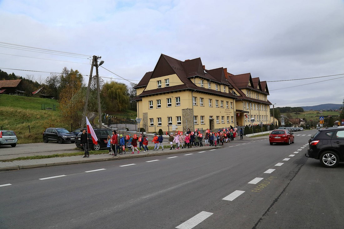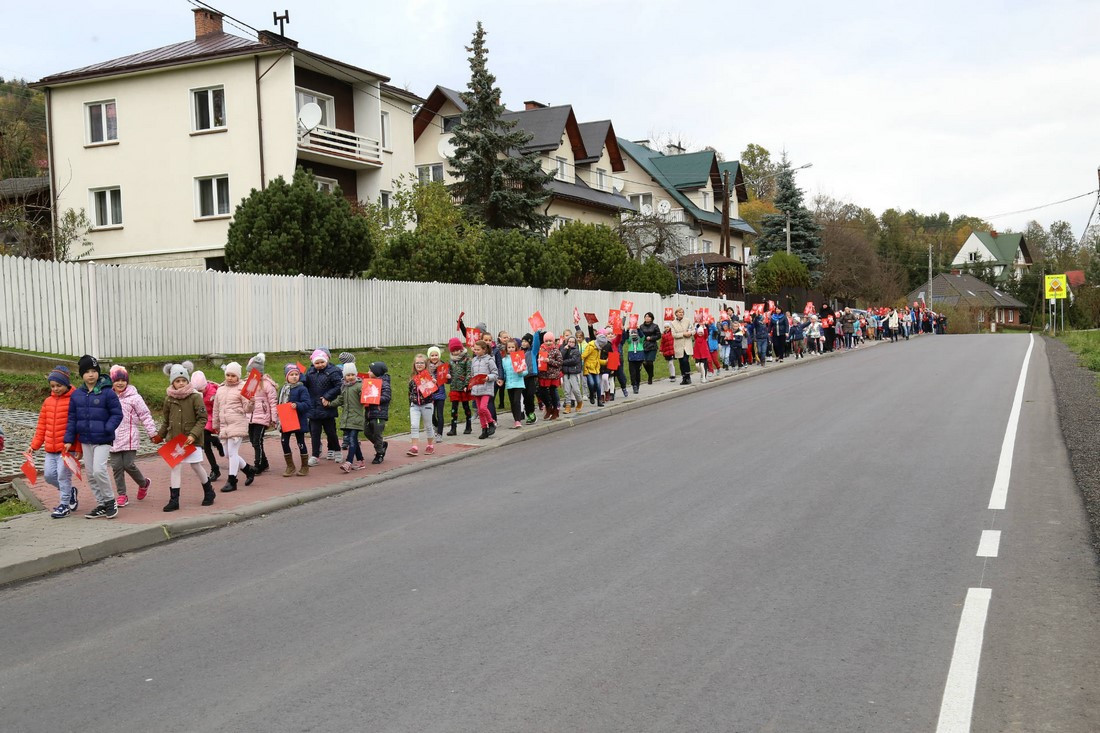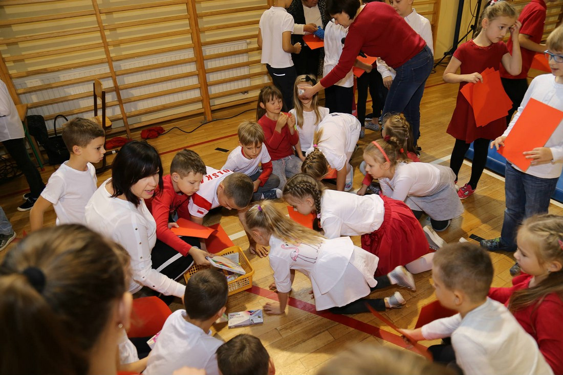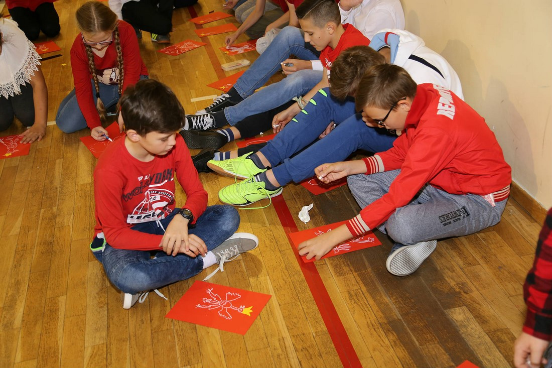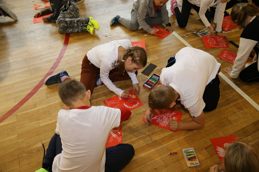 Po zakończeniu prezentacji każdy z uczniów otrzymał czerwoną kartkę, na której, miał namalować białego orła. Dzieci z zapałem przystąpiły do pracy. Efekt był imponujący: setki dumnych orłów w złotych koronach prezentowanych przez ich uśmiechniętych autorów. Uczestnicy happeningu pragnęli podzielić się swoją radością z innymi, dlatego opuścili mury szkoły i wyruszyli przez wieś w biało – czerwonym pochodzie.
