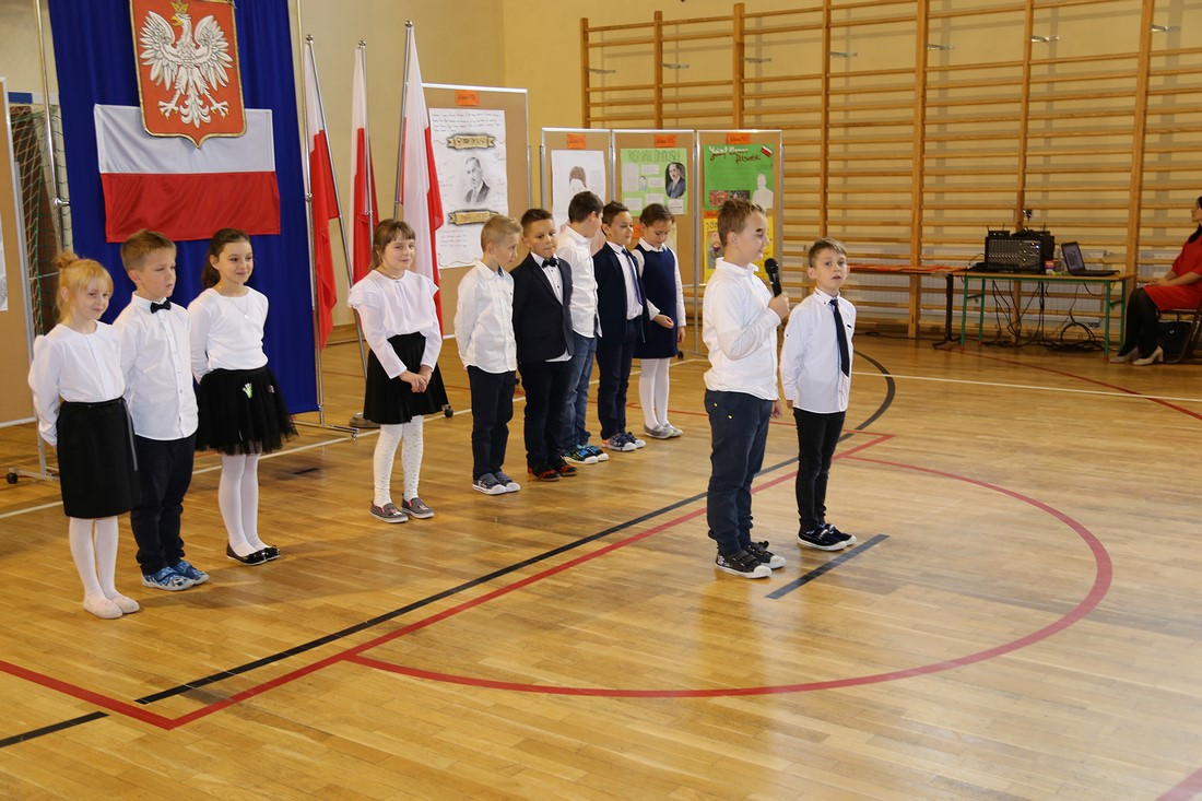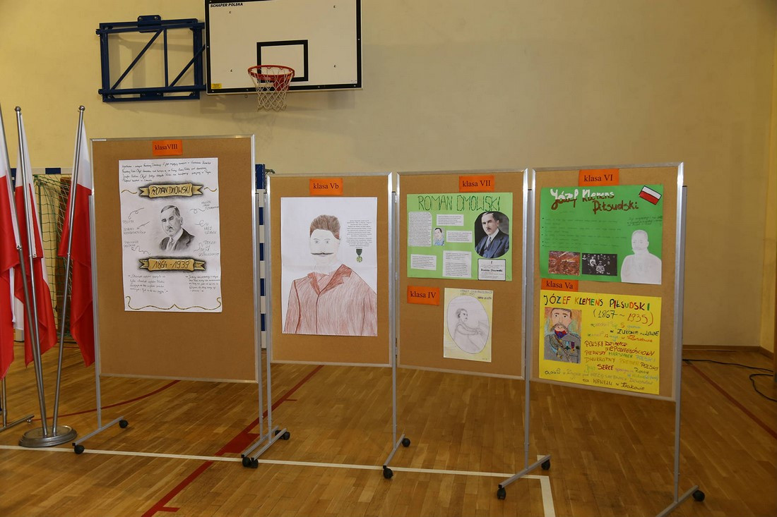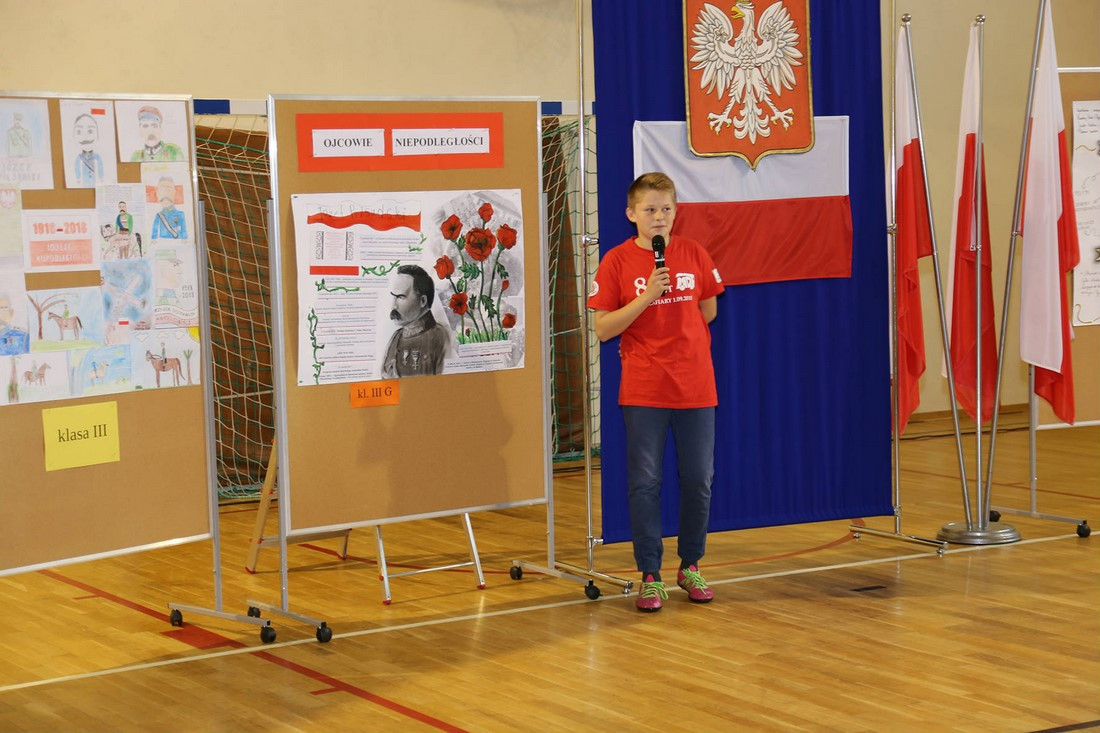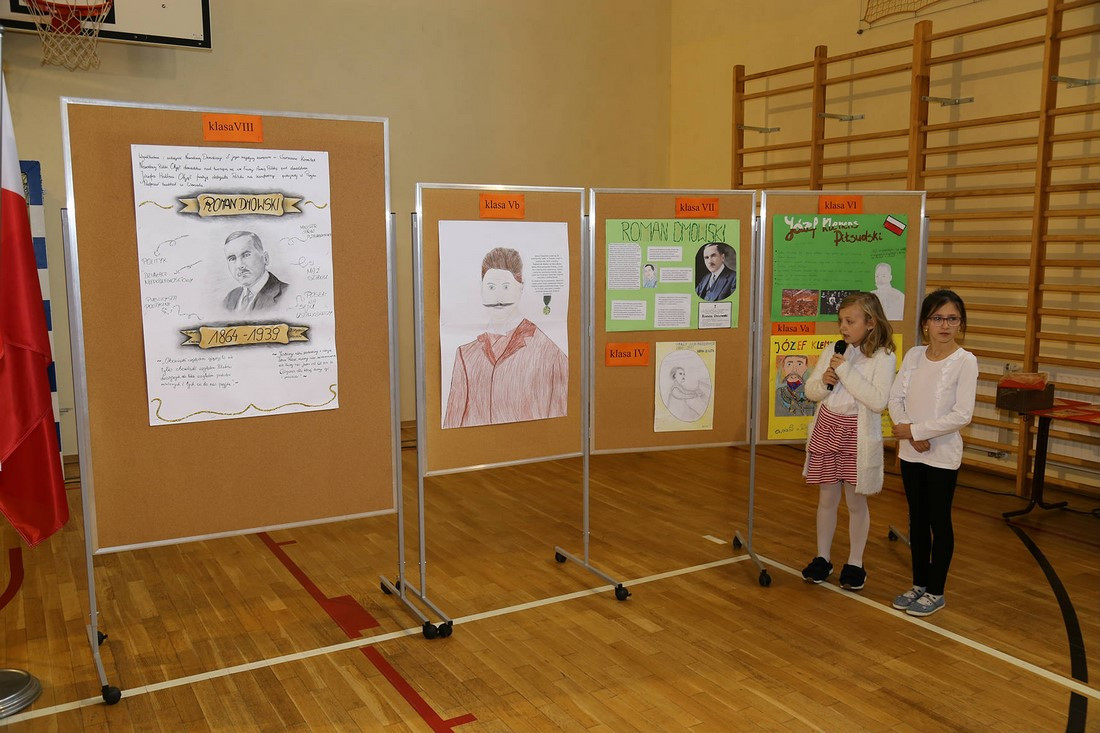 Tego dnia uczniowie wyrazili swoje przywiązanie do barw narodowych poprzez założenie biało - czerwonych strojów. O wyznaczonej porze wszyscy zgromadzili się na sali gimnastycznej, gdzie mogli podziwiać występ szkolnego kółka teatralnego. Uczniowie z wielkim przejęciem zaprezentowali montaż słowno – muzyczny o tematyce patriotycznej. Następnie przedstawiciele klas zaprezentowali wykonane przez nie plakaty poświęcone jednemu z Ojców Niepodległości. Przygotowane prace zachwycały starannością wykonania i wysokim poziomem artystycznym.