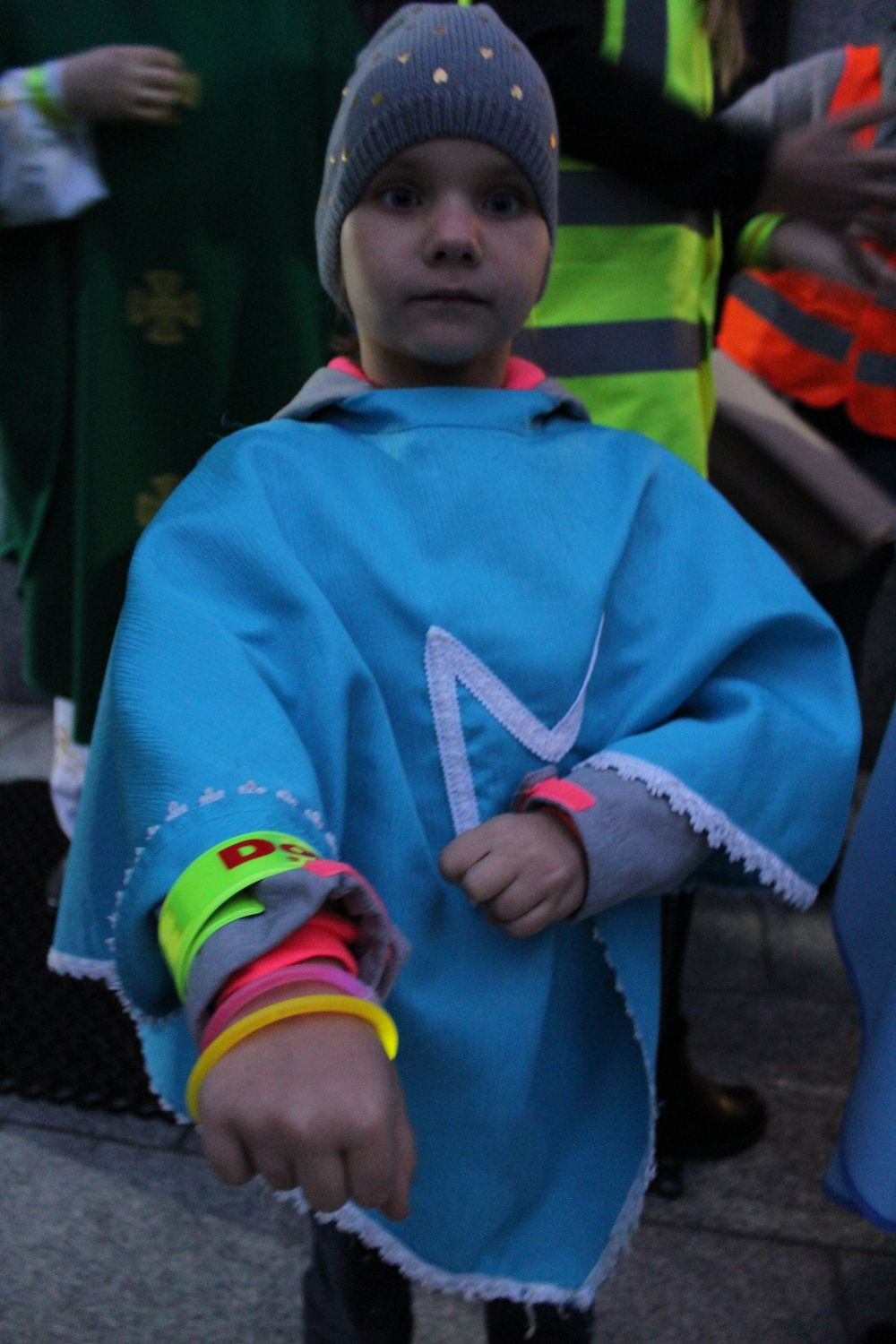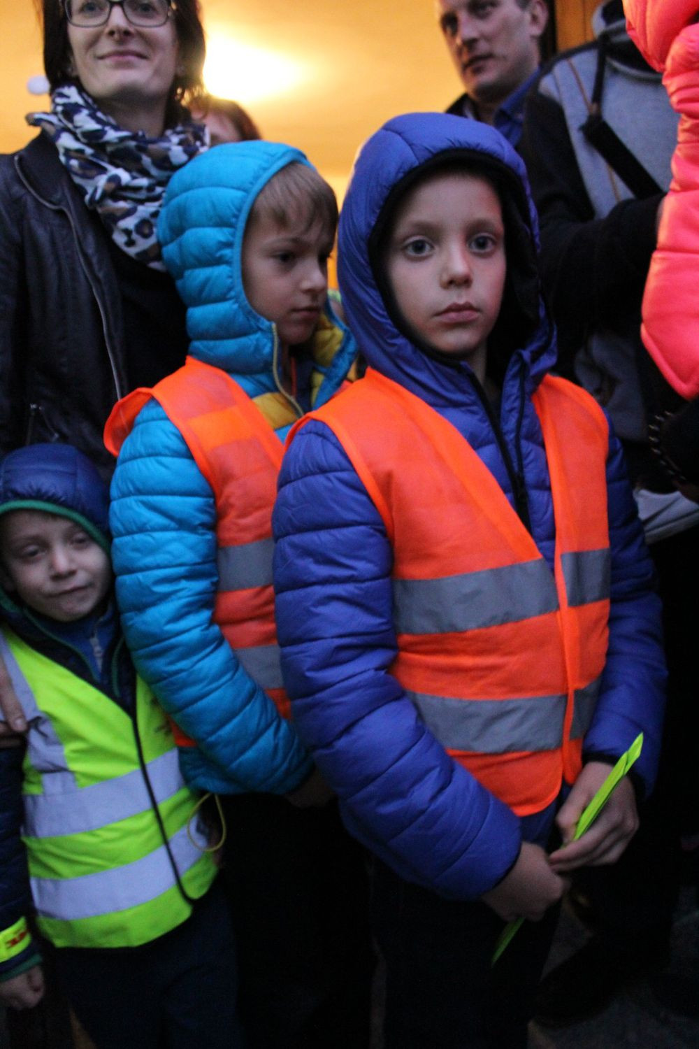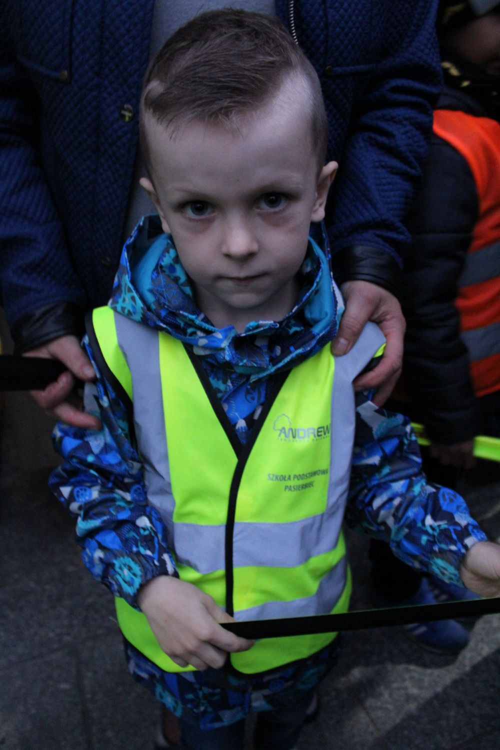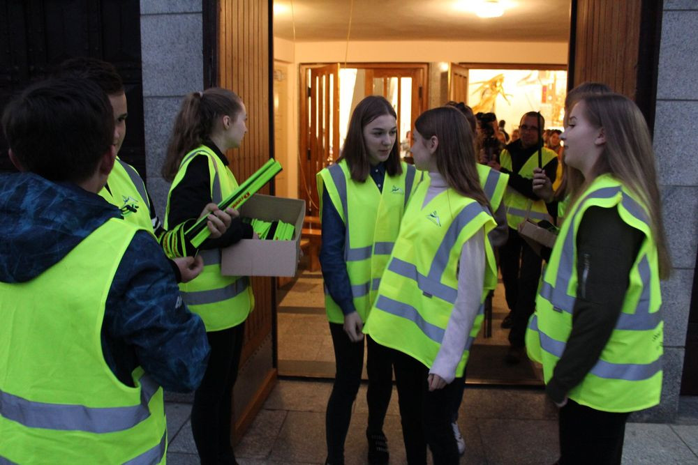 W trosce o bezpieczeństwo uczestników tego wyjątkowego różańca, uczniowie wręczali opaski odblaskowe, poprawiające ich widoczność na drodze.