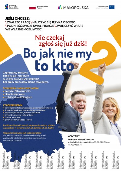 Firma ProBiznes z siedzibą w Olkuszu od czerwca 2018 r. rozpoczęła realizację projektu "Bo jak nie my to kto II". Projekt jest współfinansowany z Europejskiego Funduszu Społecznego w ramach Działania 8.2 Regionalnego Programu Operacyjnego Województwa Małopolskiego 2014-2020 r.