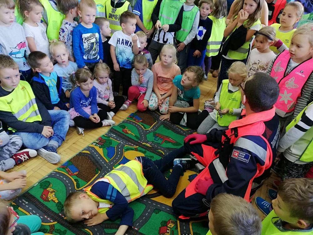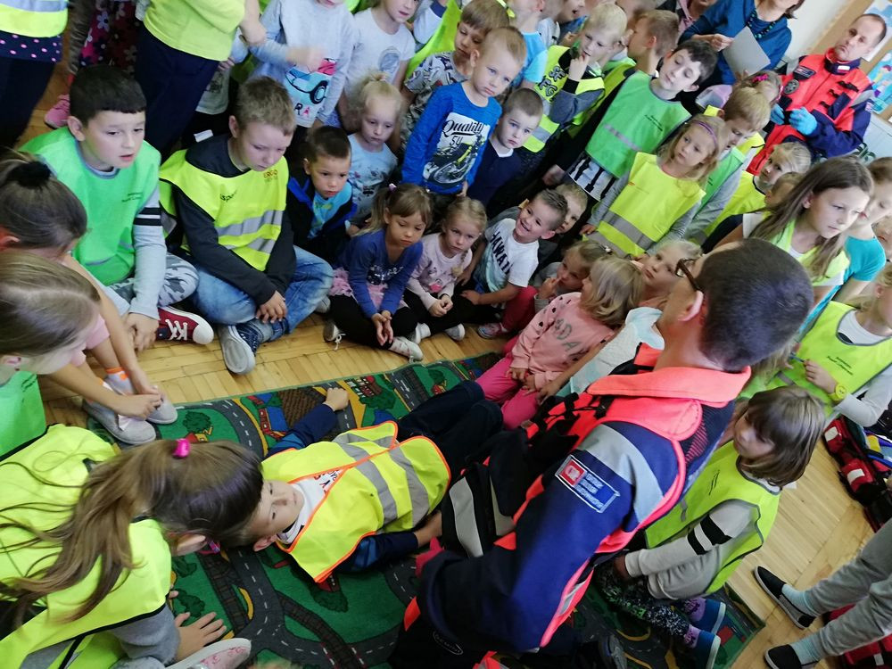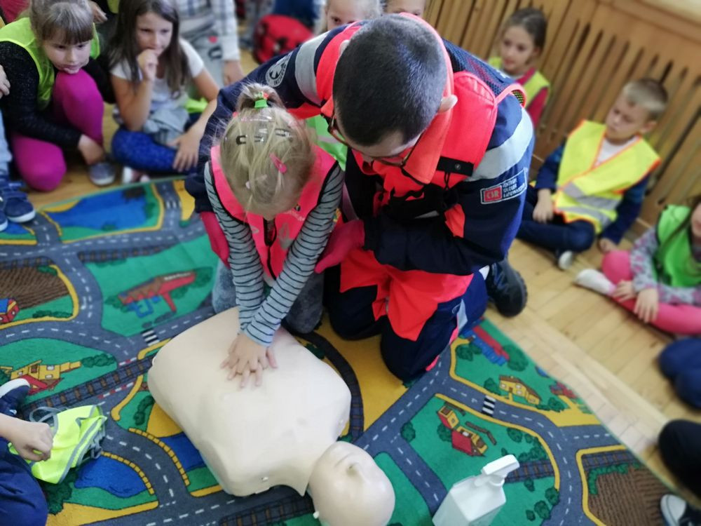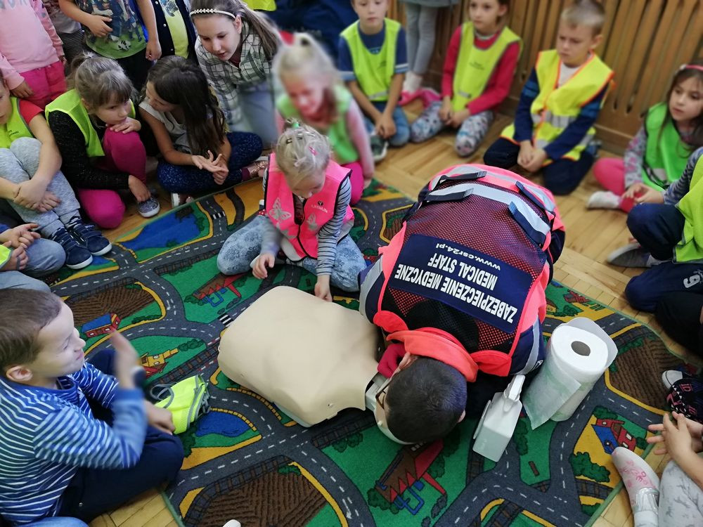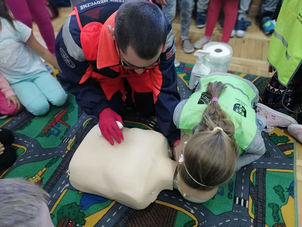 udzielania pierwszej pomocy. Uczyli się w jaki sposób można komuś pomóc zanim przyjedzie pogotowie ratunkowe, jak należy sprawdzić przytomność osoby poszkodowanej oraz jak rozmawiać z dyspozytorem. Następnie z wielką uwagą przyglądali się jak ratownik demonstrował sztuczne oddychanie i masaż serca na fantomie. W ramach ćwiczeń praktycznych chętne dzieci próbowały same udzielać pierwszej pomocy oczywiście pod bacznym okiem instruktora. Ważnym elementem spotkania była także nauka ułożenia osoby poszkodowanej w pozycji bocznej, którą dzieci przećwiczyły razem z ratownikiem.