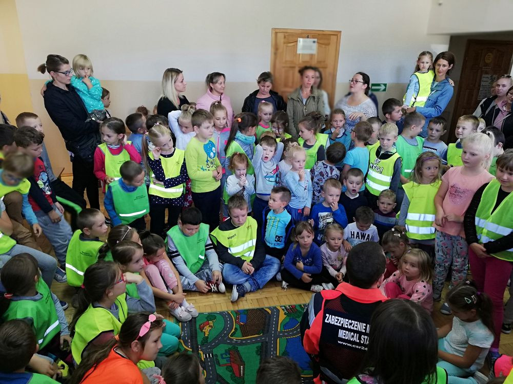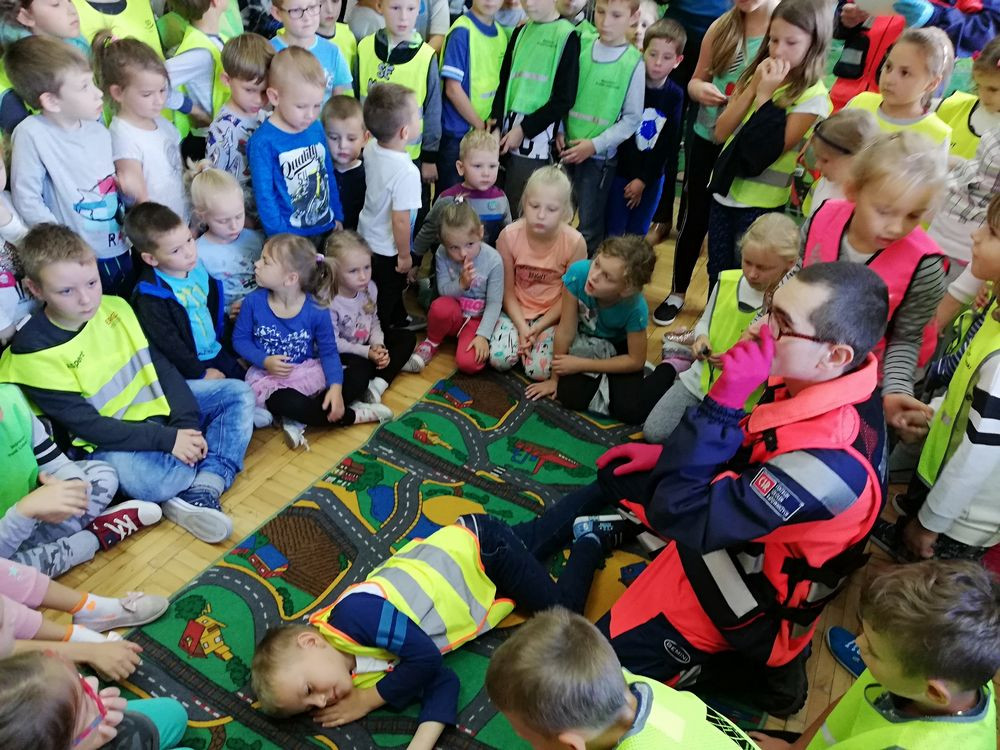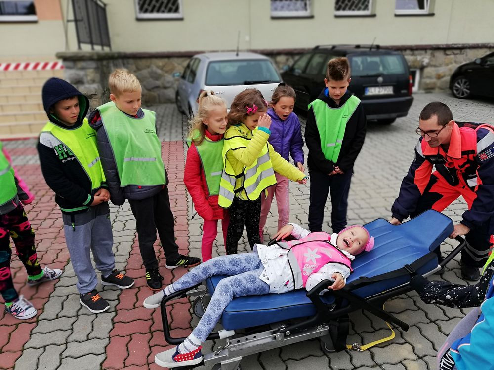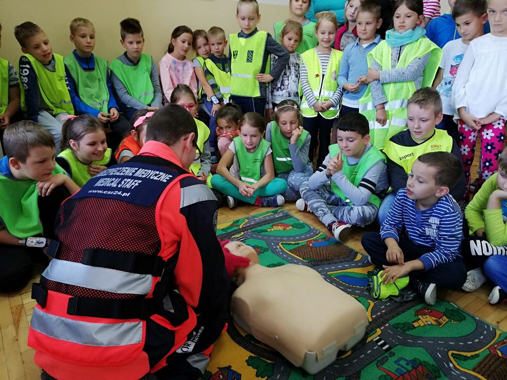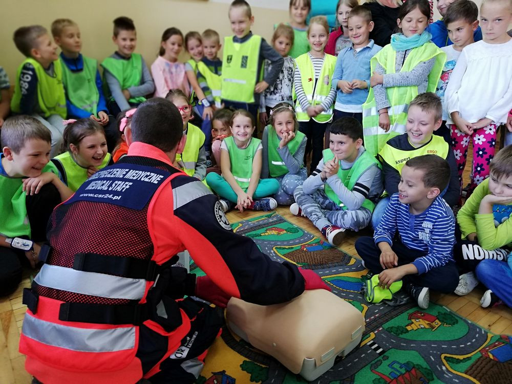 udzielania pierwszej pomocy. Uczyli się w jaki sposób można komuś pomóc zanim przyjedzie pogotowie ratunkowe, jak należy sprawdzić przytomność osoby poszkodowanej oraz jak rozmawiać z dyspozytorem. Następnie z wielką uwagą przyglądali się jak ratownik demonstrował sztuczne oddychanie i masaż serca na fantomie. W ramach ćwiczeń praktycznych chętne dzieci próbowały same udzielać pierwszej pomocy oczywiście pod bacznym okiem instruktora. Ważnym elementem spotkania była także nauka ułożenia osoby poszkodowanej w pozycji bocznej, którą dzieci przećwiczyły razem z ratownikiem.