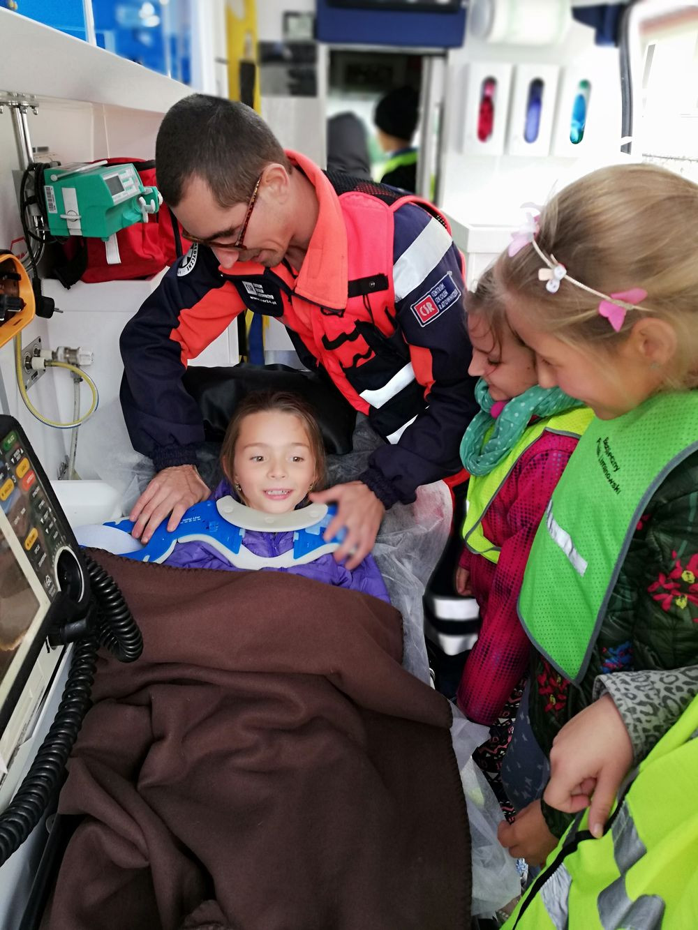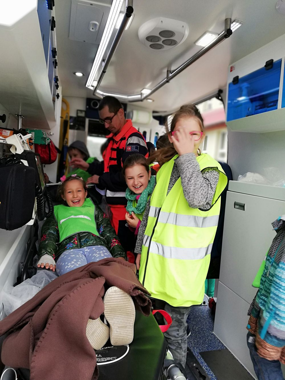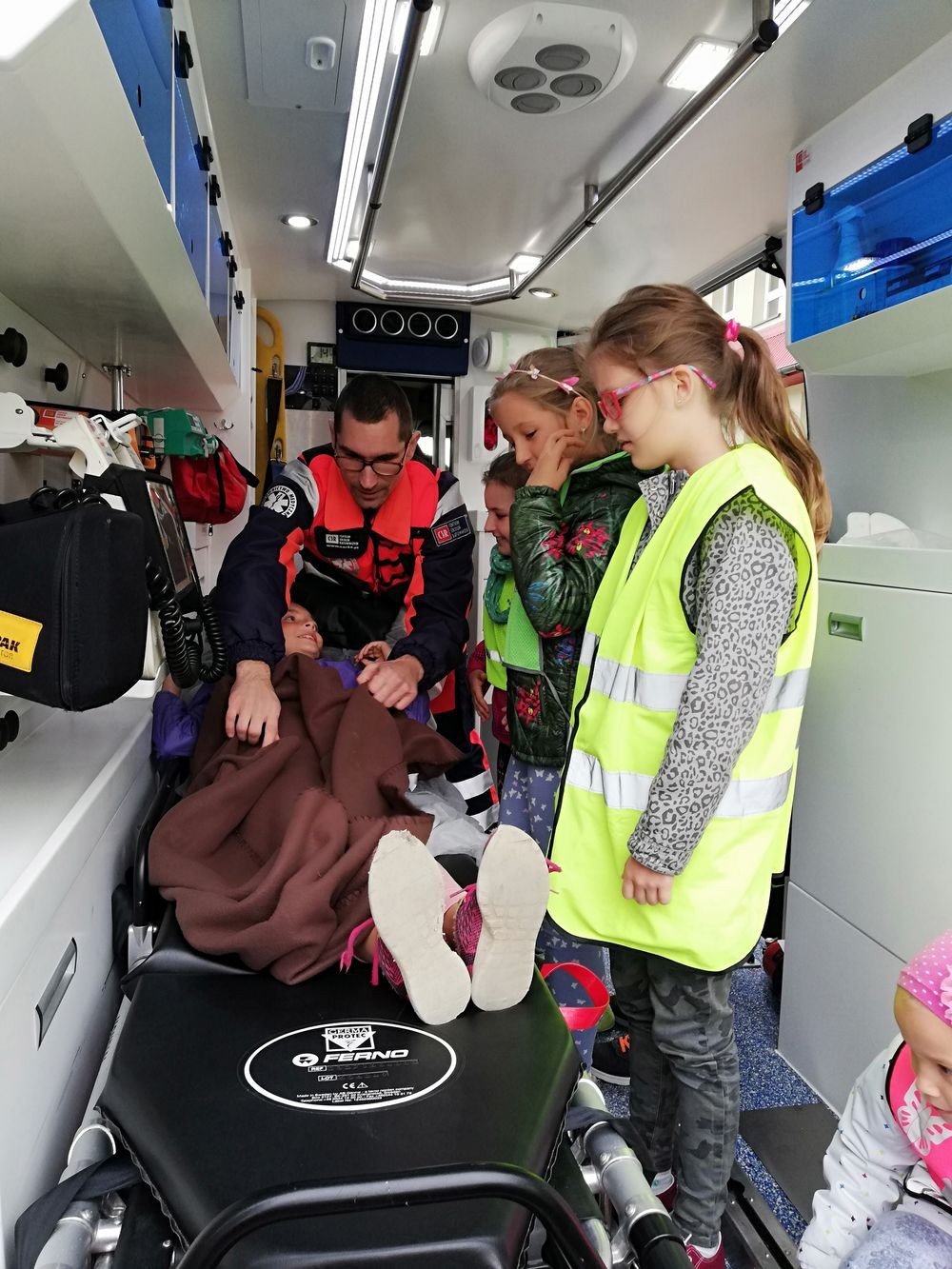 112, 999, 998, 997. Następnie obejrzały wnętrze karetki i zapoznały się z jej wyposażeniem. Mogły również wypróbować jak działają sygnały dźwiękowe, co sprawiło im ogromną radość.