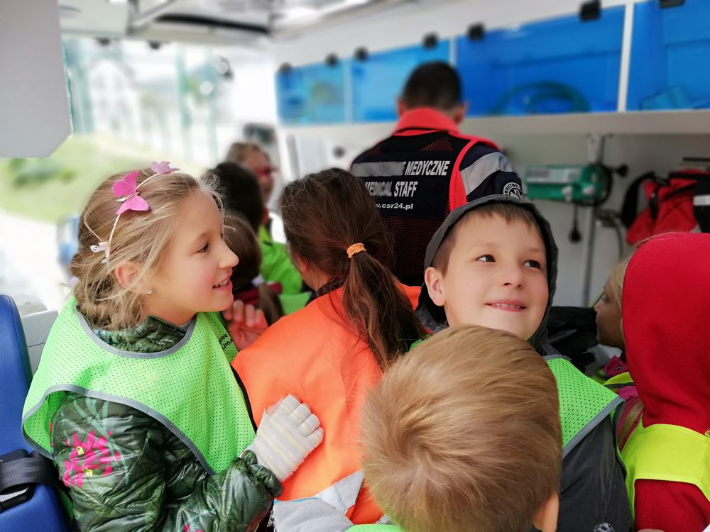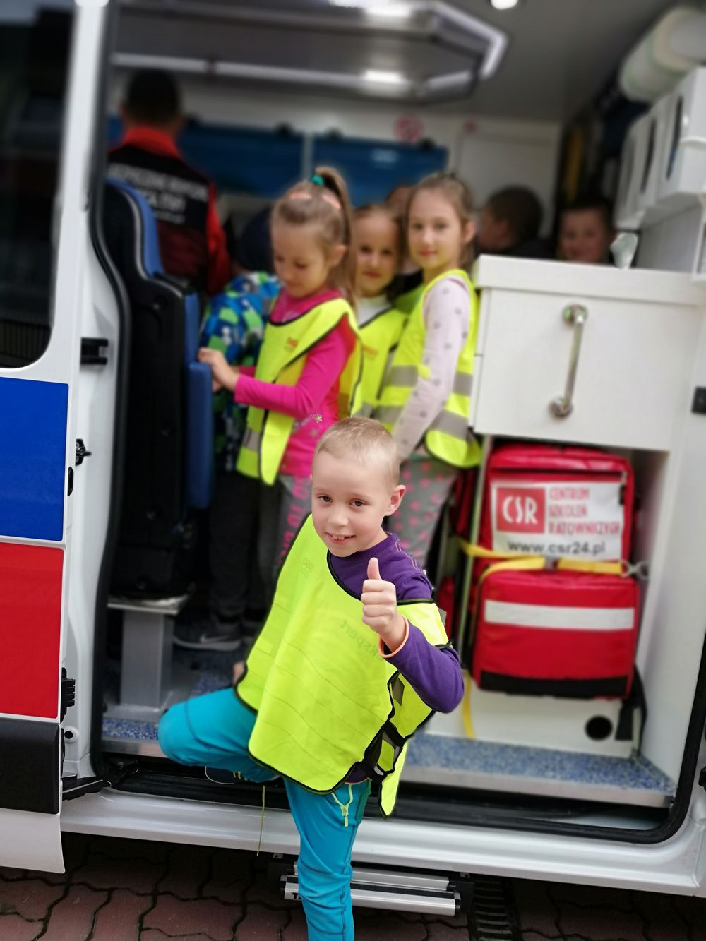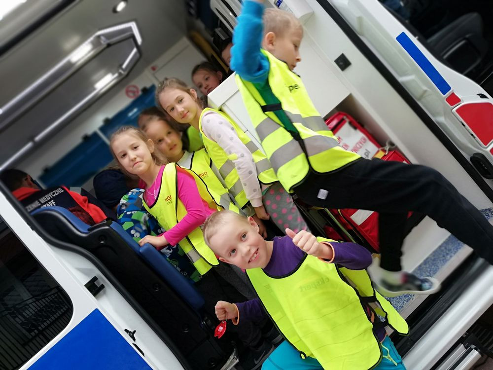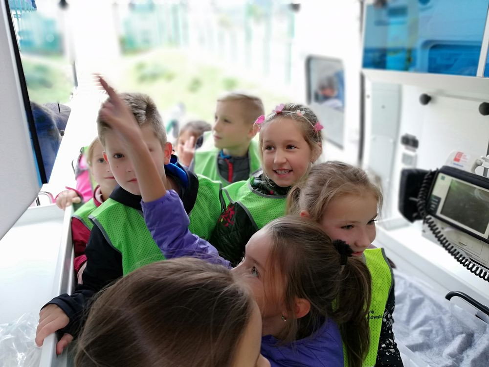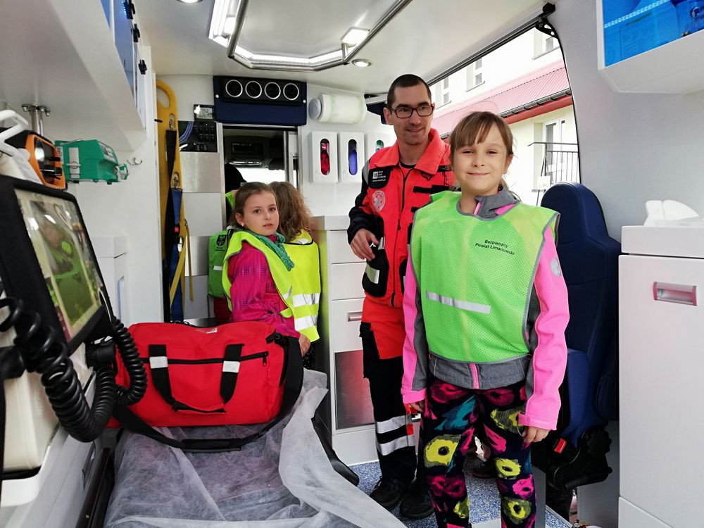 112, 999, 998, 997. Następnie obejrzały wnętrze karetki i zapoznały się z jej wyposażeniem. Mogły również wypróbować jak działają sygnały dźwiękowe, co sprawiło im ogromną radość.