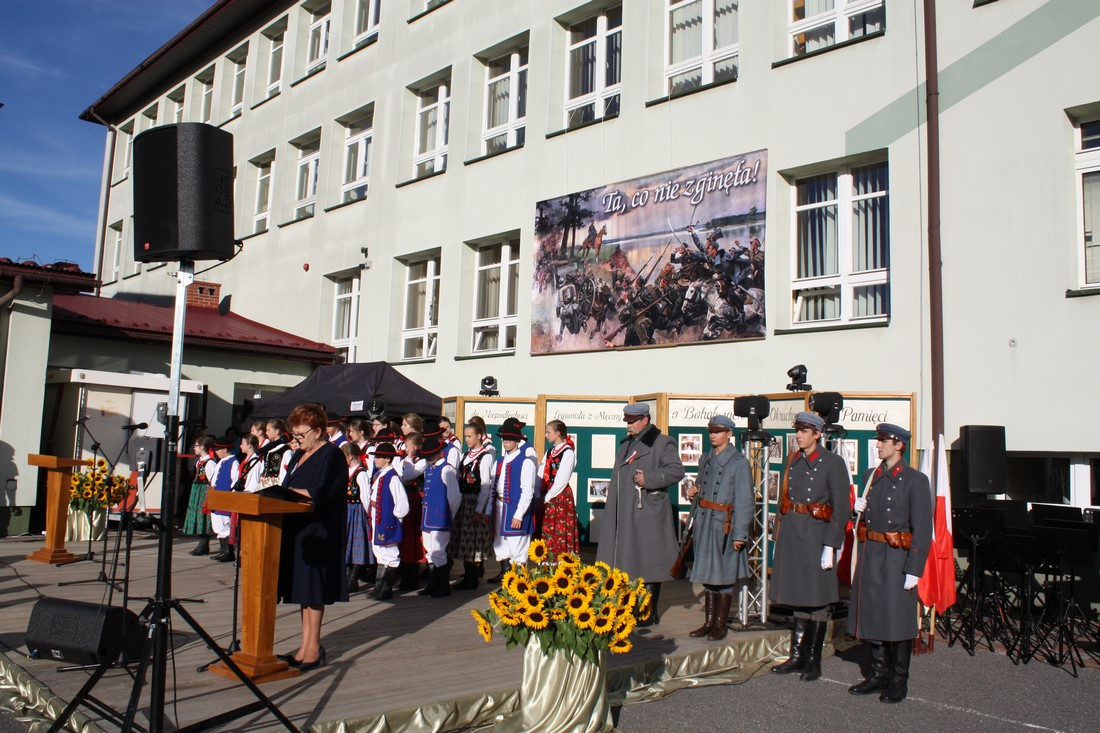 Kolejnym punktem uroczystości był przemarsz do Szkoły Podstawowej nr 1. W barwnym korowodzie, który przeszedł ulicami Męciny, pojawili się również przedstawiciele Limanowskiego Stowarzyszenia Historii Ożywionej Jabłoniec 1914. Dzięki nim mogliśmy zobaczyć samego Marszałka Józefa Piłsudskiego w bryczce wraz z towarzyszącymi mu konno legionistami. Po dotarciu na szkolne obiekty sportowe nastąpiło uroczyste wciągnięcie flagi na maszt oraz odśpiewanie hymnu narodowego. Następnie głos zabrała Dyrektor Szkoły Podstawowej nr 1 w Męcinie Maria Lupa, która powitała przybyłych na uroczystość zaproszonych gości i mieszkańców Męciny. W krótkim słowie skierowanym do audytorium podkreśliła doniosłość wydarzenia jednoczącego lokalną społeczność w duchu patriotyzmu. Po części oficjalnej nadszedł czas na występy artystyczne. Jako pierwszy na scenie zaprezentował się zespół regionalny „Mali Męcinianie”. W repertuarze młodych artystów znalazły się pieśni patriotyczne, których publiczność wysłuchała z wielkim wzruszeniem.