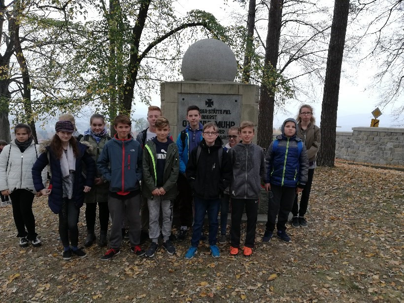 Następnie uczniowie udali się na Jabłoniec, gdzie mieści się cmentarz wojskowy z czasów I wojny światowej. W pięknej jesiennej scenerii młodzież z zainteresowaniem wysłuchała historii dzielnego austro – węgierskiego pułkownika Othmara Muhra, który poległ w czasie zaciętej bitwy z armią rosyjską. Spacer po wojennej nekropolii był także dla młodzieży czasem zadumy nad ofiarnością i determinacją poległych tu żołnierzy.