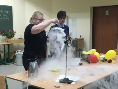 Na początku uczniowie wzięli udział w widowiskowym pokazie związanym z ciekłym azotem. Każdy z uczestników mógł zobaczyć, jak ekstremalnie niskie temperatury wpływają na otoczenie, jak zmieniają właściwości fizycznych przedmiotów np. gumowej rurki czy balonów. Uczniowie byli zachwyceni, gdy kapusta i róża były rozbijane jak szkło.