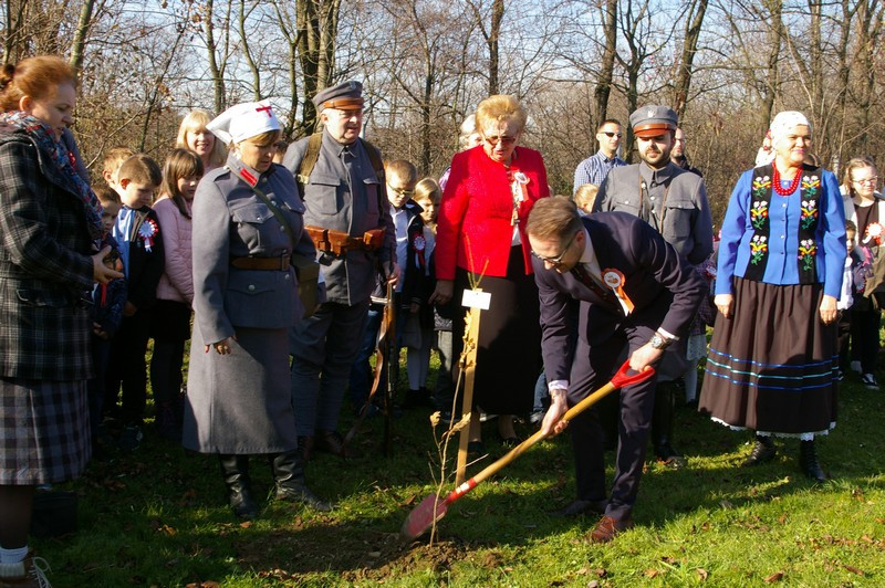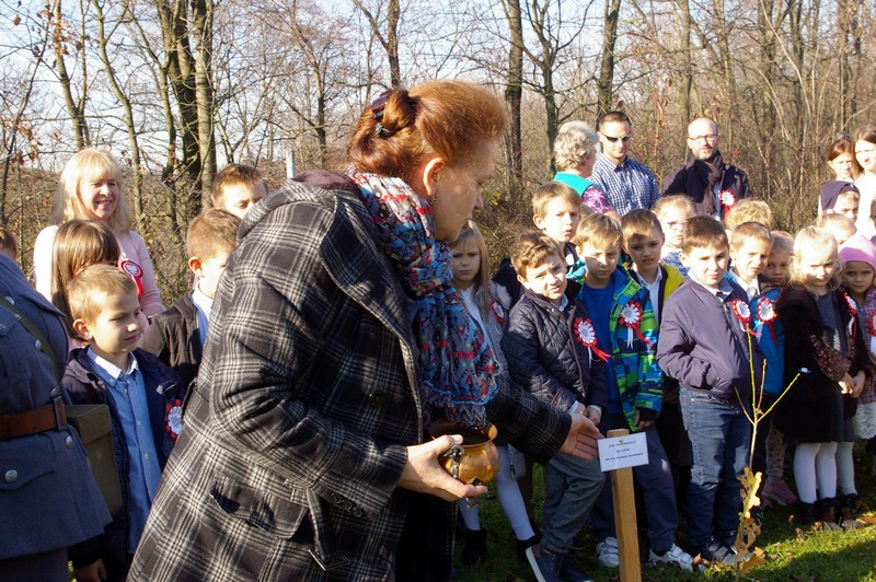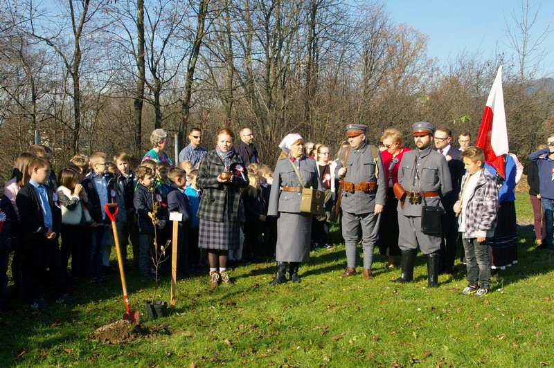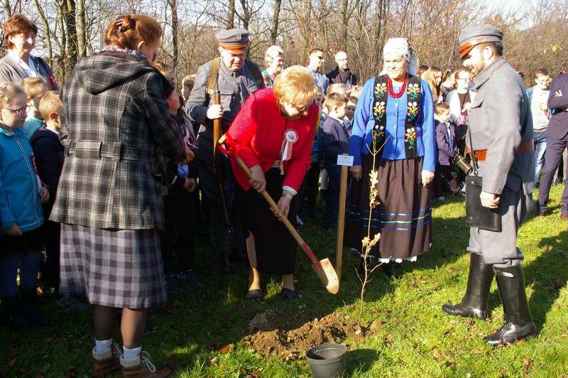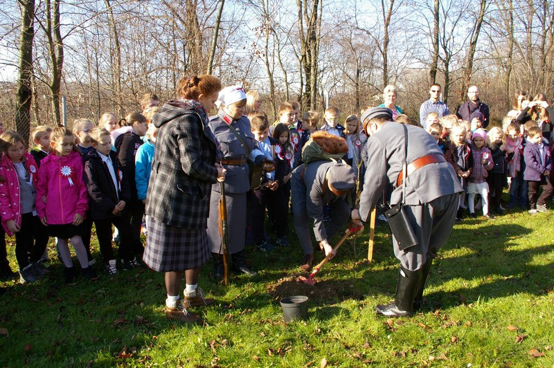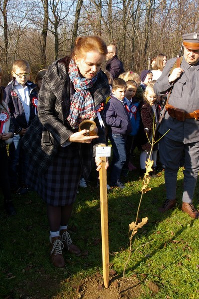 Podniosłym momentem uroczystości było przekazanie przez przedstawicieli zespołu „Kijom Worci” ziemi przywiezionej z Zułowa na Litwie – miejsca urodzin Józefa Piłsudskiego. Na zakończenie, przy akompaniamencie akordeonisty i wspólnym śpiewie pieśni legionowych, uczestnicy spotkania zostali poczęstowani żołnierską grochówką z podpłomykami. Z gościnnej Górkówki wszyscy razem udali się do szkoły, gdzie odbyła się ceremonia posadzenia Dębu Niepodległej w ziemi z miejsca narodzin Józefa Piłsudskiego. Nie sposób opisać szczególnej atmosfery, która panowała w trakcie tego wyjątkowego wydarzenia. Uczniowie przeżyli wspaniałą, wzruszającą i żywą lekcję historii.