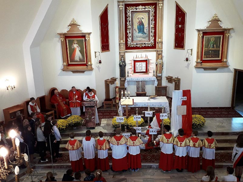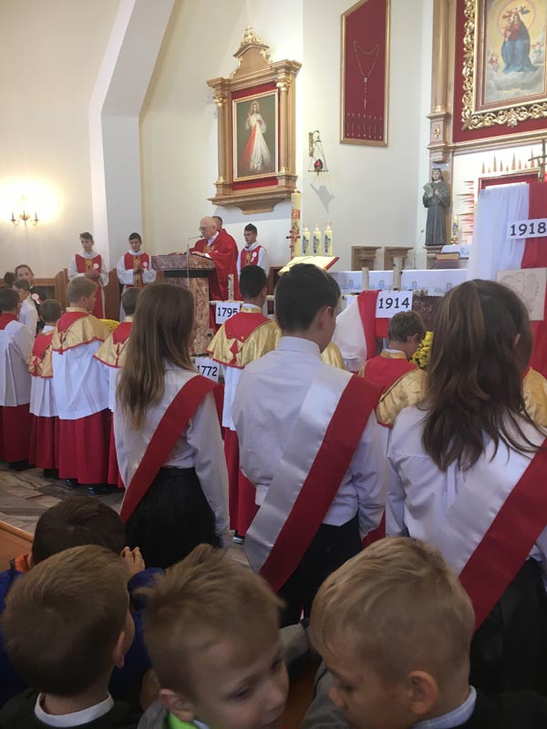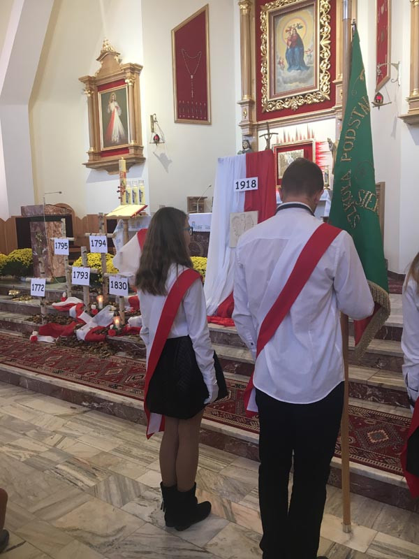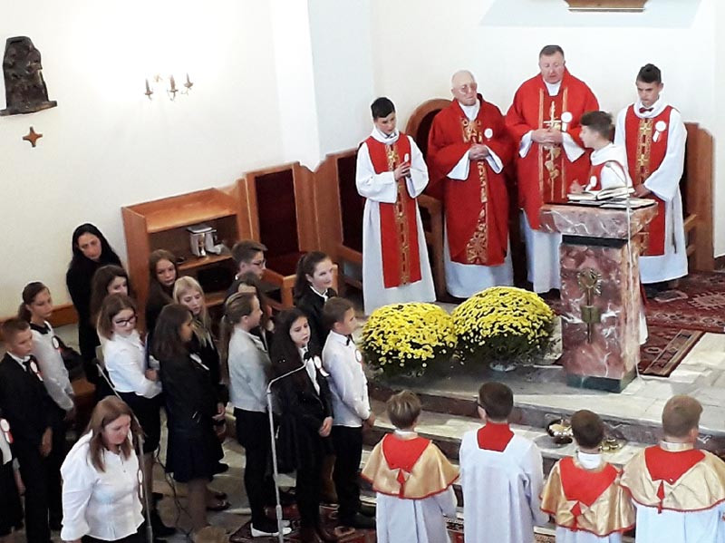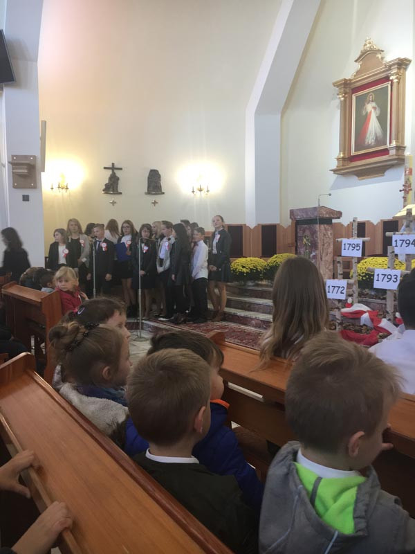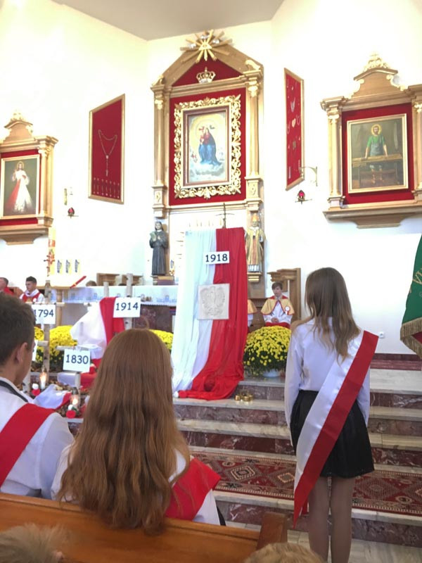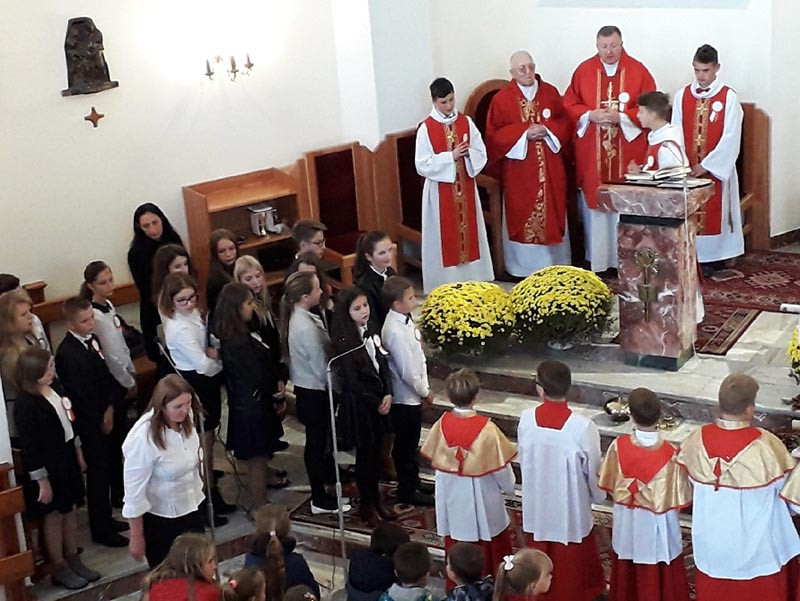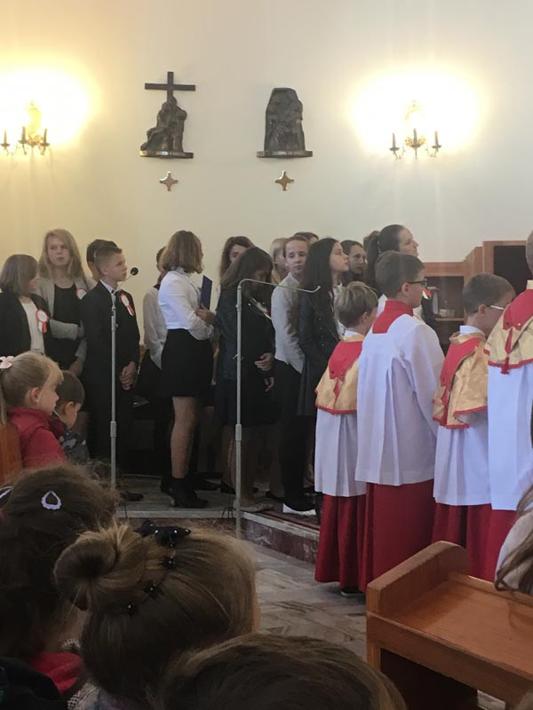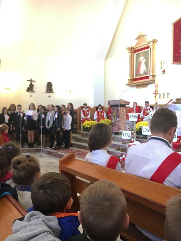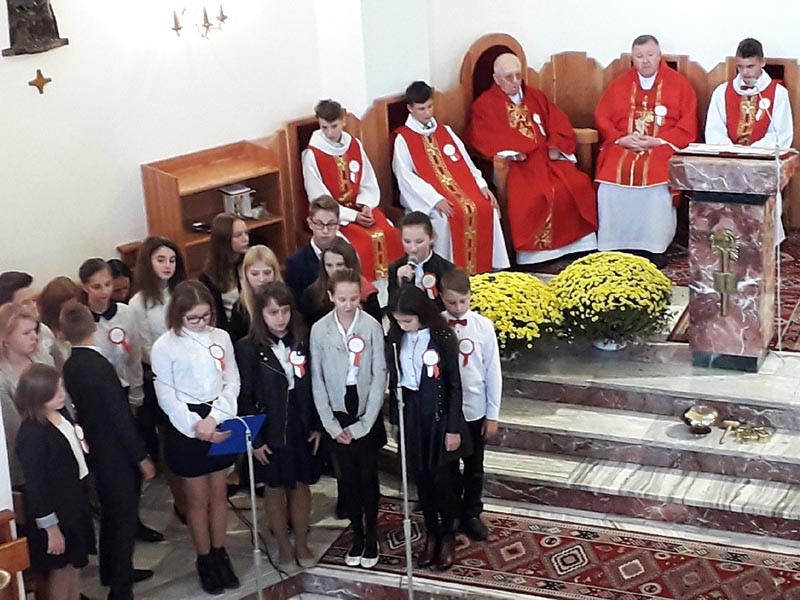 Również w niedzielę 11 listopada na uroczystej mszy św. młodzież szkoły wystąpiła ponownie ze swoim programem artystycznym, gdzie wspólnie z wiernymi zgromadzonymi na mszy św. odśpiewano Mazurka Dąbrowskiego i minutą ciszy uczczono pamięć poległych za wolność naszej Ojczyzny. Po tych nabożeństwach każdy mógł sobie uświadomić, jaką wartością dla Polaków jest wolna Polska i jakie to dla nas dobrodziejstwo, pamiętając jednocześnie słowa Cypriana Kamila Norwida: „Ojczyzna to wielki zbiorowy obowiązek”.