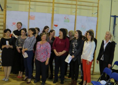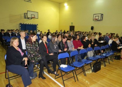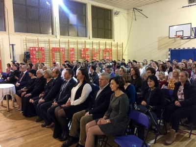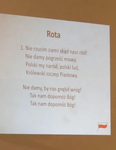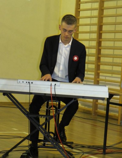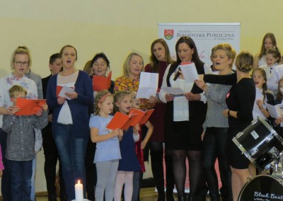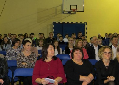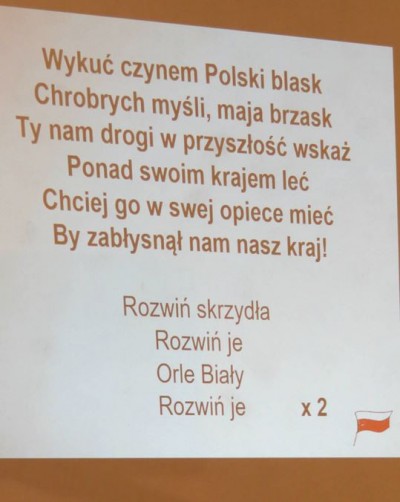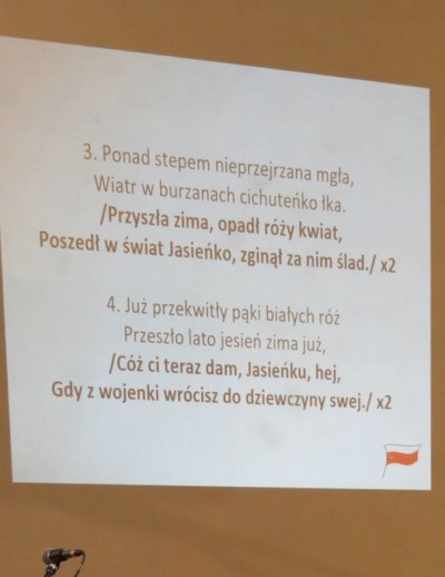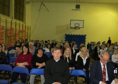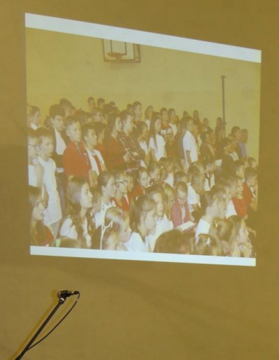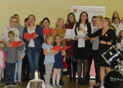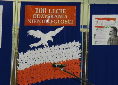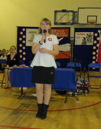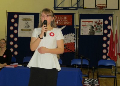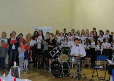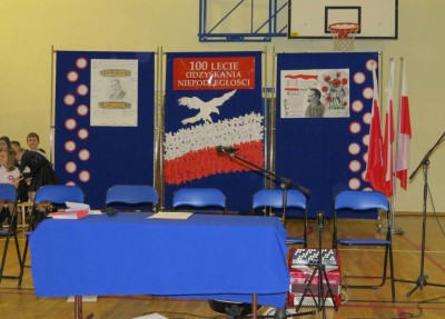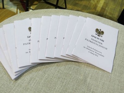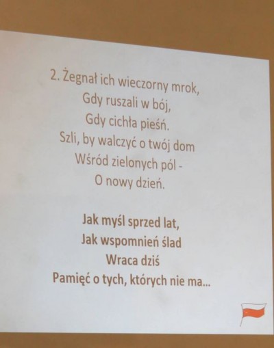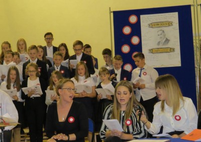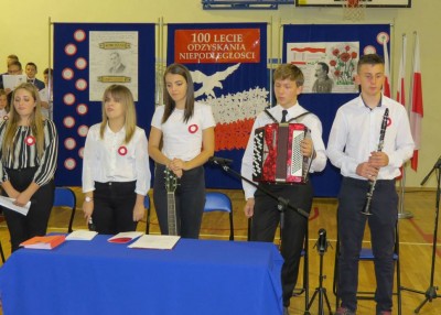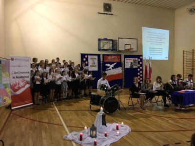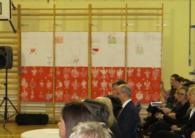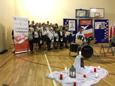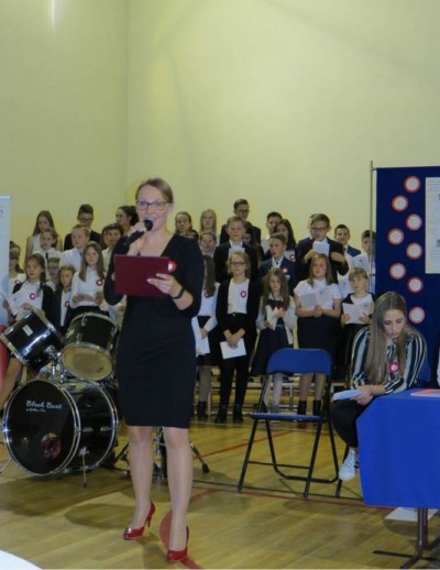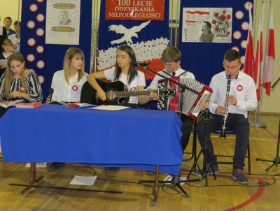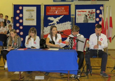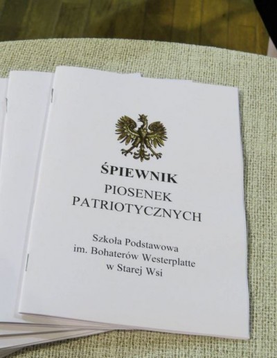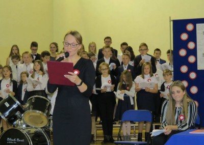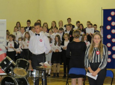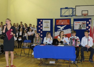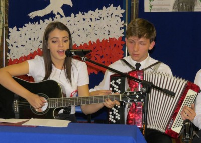 Potem rozpoczęło się wspólne śpiewanie, któremu przewodniczył szkolny chór oraz zespół muzyczny złożony z uczniów i absolwentów szkoły pod przewodnictwem Pani Iwony Koczanowicz. Wykonano wiele utworów pochodzących z czasów walk (m.in. Wojenko, wojenko; Przybyli ułani pod okienko; Rota) i tych nowszych, upamiętniających ofiarną walkę o Ojczyznę (m.in. Biały krzyż; Niepodległa, niepokorna; Żeby Polska była Polską). Wszyscy zgromadzeni byli pod wrażeniem talentów wokalnych i instrumentalnych młodzieży oraz panującej atmosfery – poczucia wspólnoty, wzajemnej życzliwości i radości. Uczczono także pamięć ks. Ignacego Zonia – kapłana niezłomnego ze Starej Wsi. Przedstawiono poświęconą mu prezentację. Zgromadzeni poznali również wyniki sondażu przeprowadzanego wśród uczniów, dotyczącego odpowiedzi na pytanie: Kto to jest patriota? Udzielone przez dzieci odpowiedzi pozwalają ze spokojem patrzeć w przyszłość i zapewne napawały dumą zgromadzonych rodziców i dziadków. Na zakończenie Pani Dyrektor Halina Mąka podziękowała wszystkim uczestnikom i organizatorom za ich zaangażowanie i entuzjazm. Podkreśliła także ogrom pracy, jaką uczniowie włożyli w to, aby całość uroczystości wypadła tak imponująco.