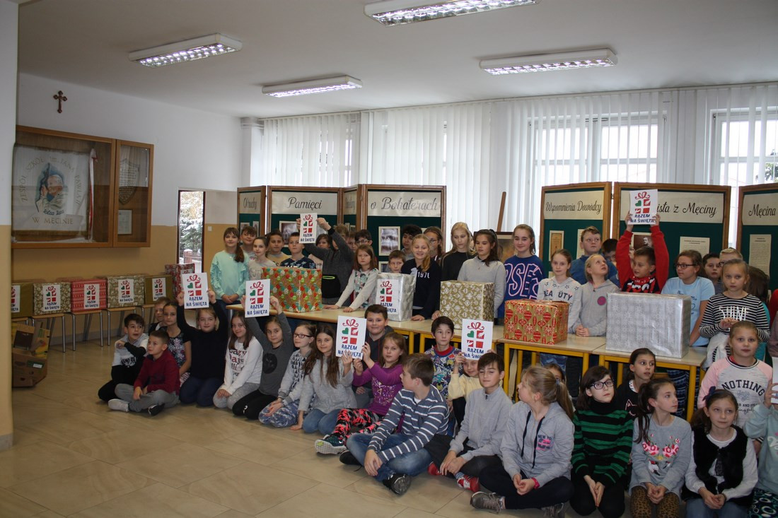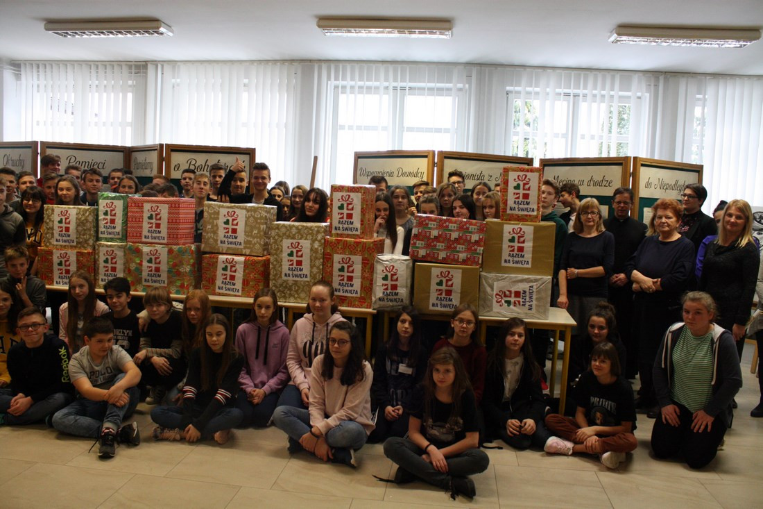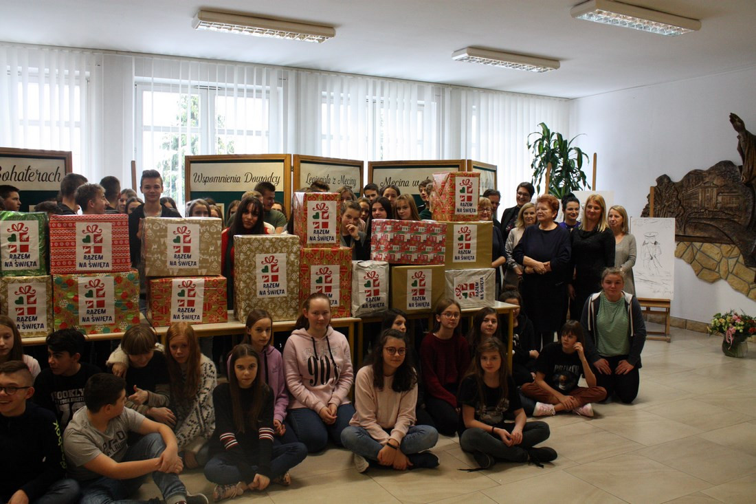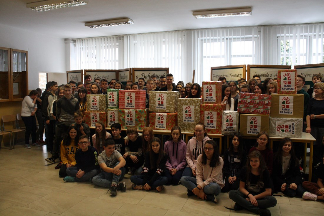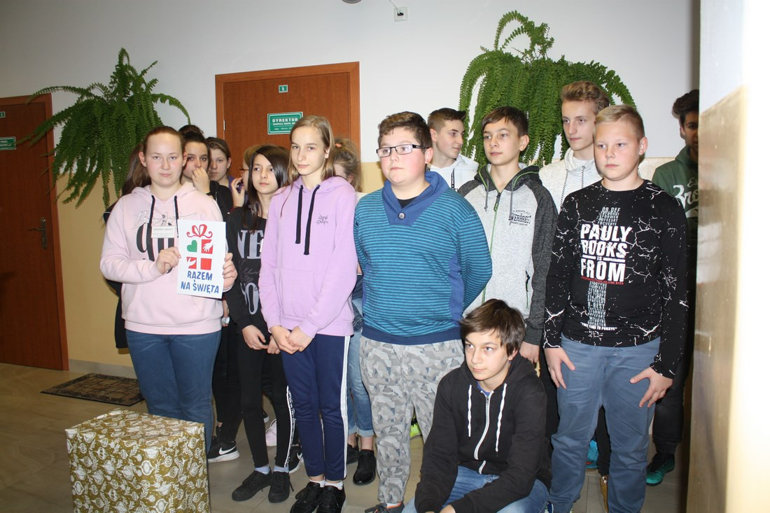 W bieżącym roku szkoła postanowiła włączyć się w ogólnopolską akcję pod hasłem „Razem na Święta”, której celem jest podjęcie działań związanych z przedświątecznym wolontariatem. Jak co roku, dzieci i młodzież ochoczo odpowiedzieli na apel – każdej klasie udało się zgromadzić liczne artykuły spożywcze o długim terminie ważności oraz, niezbędne w każdym domu, ręczniki. Wszystkie produkty uczniowie zapakowali w ozdobne pudełka, dołączając ręcznie wykonane kartki z życzeniami. Paczki trafią do osób najbardziej potrzebujących w naszej miejscowości.
