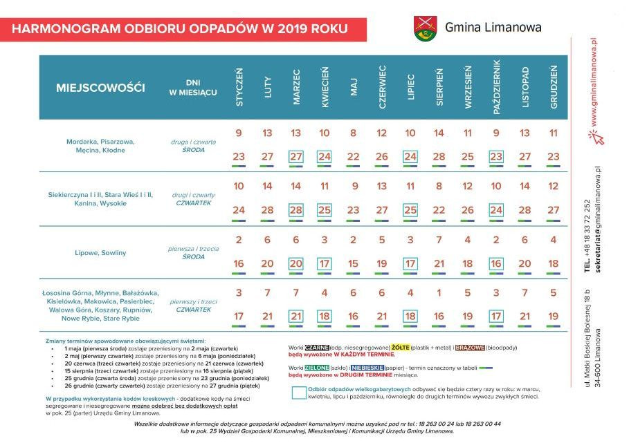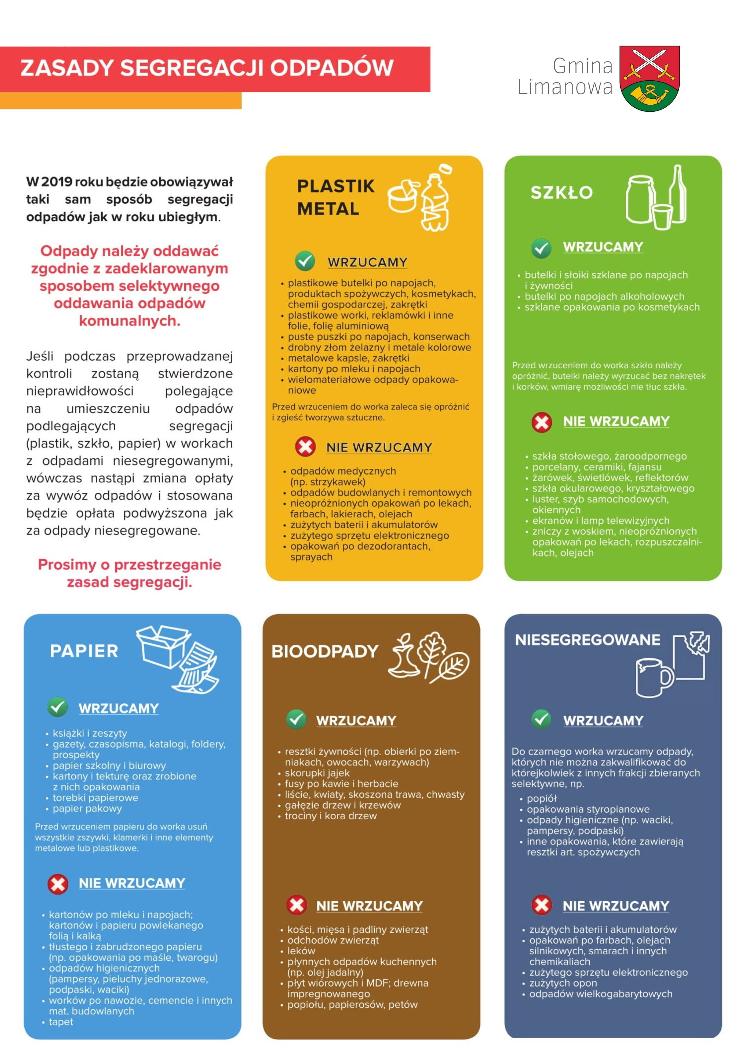 Od 1 stycznia 2019 r. mieszkańców Gminy Limanowa obowiązywać będzie taki sam jak dotychczas sposób segregacji opadów, natomiast opłaty za wywóz śmieci wynosić będą :