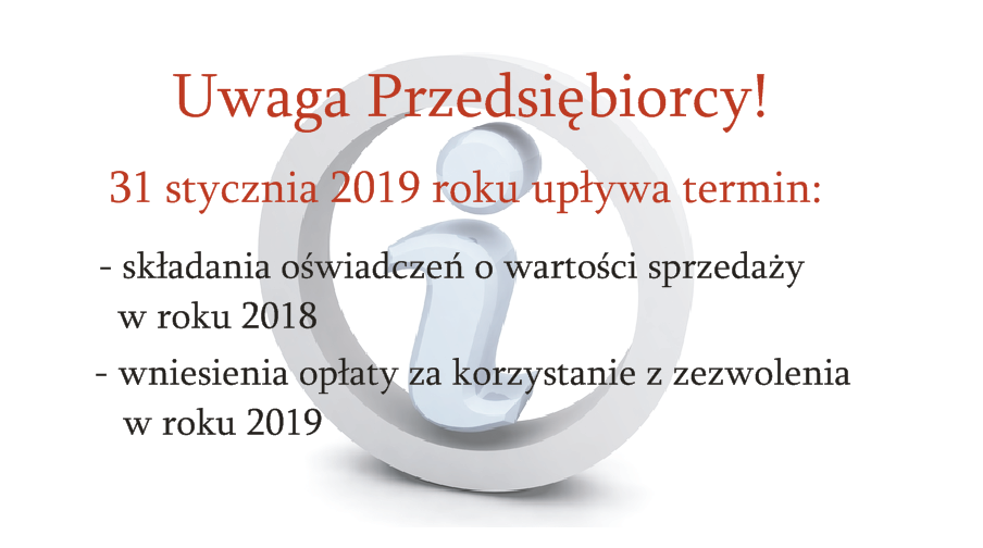 Na podstawie art.18 ust. 12 a ustawy o wychowaniu w trzeźwości i przeciwdziałaniu alkoholizmowi (Dz. U. z 2018 r. poz. 2137 ze zm.), w przypadku nie złożenia oświadczenia w terminie tj. do dnia 31 stycznia 2019 r. przedsiębiorca może jeszcze dopełnić tej czynności w terminie 30 kolejnych dni, przy czym jest wówczas zobowiązany do dokonania opłaty dodatkowej w wysokości 30% opłaty za korzystanie z zezwolenia na sprzedaż napojów alkoholowych określonej w art.11 ¹ ust.2. Na podstawie art. 18 ust. 12 b wskazanej wyżej ustawy, w przypadku niedokonania opłaty w ustawowej wysokości i w terminie do dnia 31 stycznia 2019 r. przedsiębiorca może jeszcze dopełnić tej czynności w terminie 30 kolejnych dni, przy czym kwota do zapłaty zostaje powiększona o 30% opłaty należnej za korzystanie z zezwoleń w danym roku kalendarzowym określonej w art.11 ¹ ust.2 albo 5.