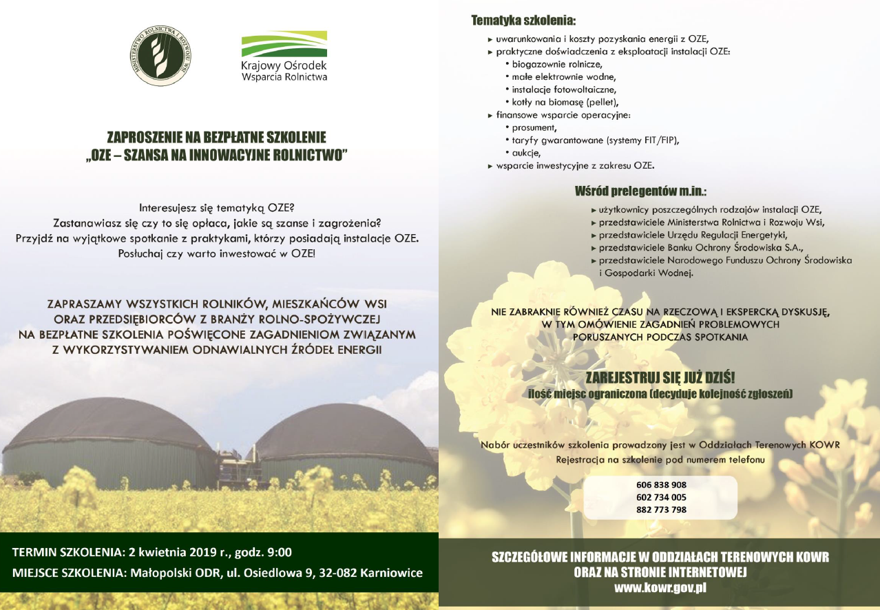 Bezpłatne szkolenie „OZE – Szansa na Innowacyjne Rolnictwo"