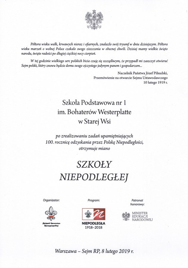 Otrzymanie przez Szkołę Podstawową Nr 1 im. Bohaterów Westerplatte w Starej Wsi certyfikatu „Szkoły Niepodległej” jest dla wszystkich uczniów, dyrekcji oraz grona pedagogicznego wspaniałym wyróżnieniem, powodem do dumy i wielkiej radości.