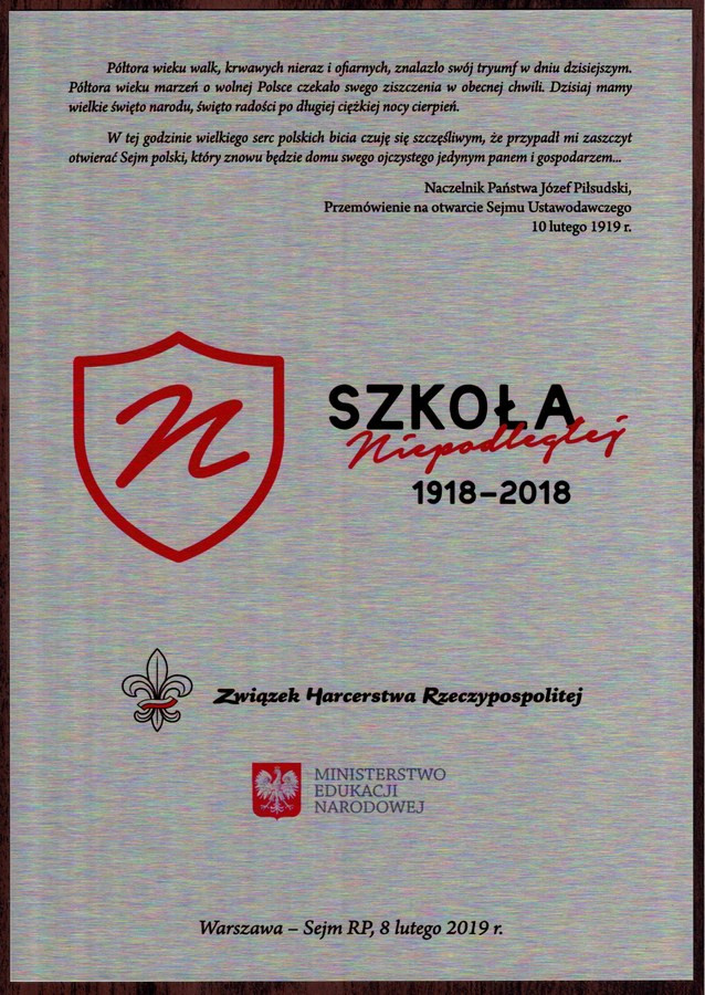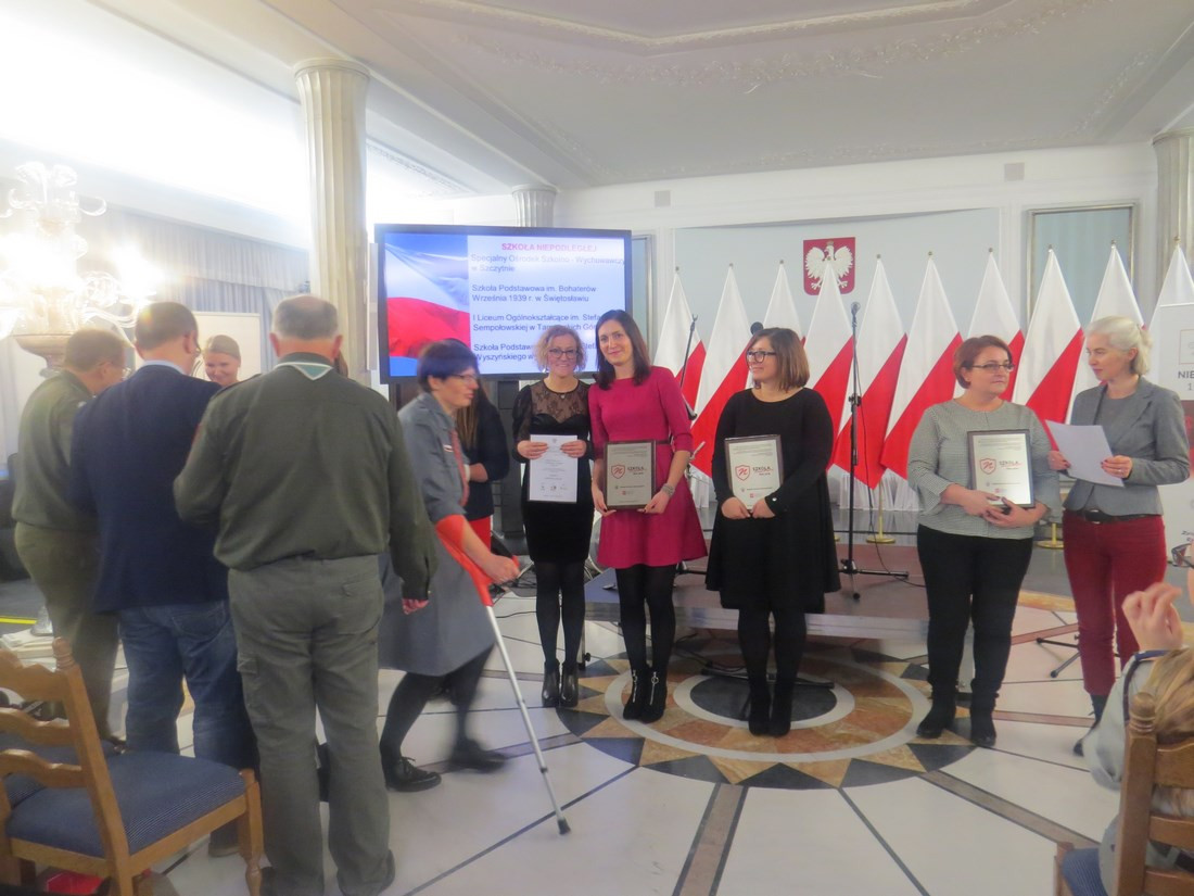 Uroczysta Gala „Szkoły Niepodległej” odbyła się w piątek 8 lutego 2019 r. w Sali Kolumnowej Sejmu RP w Warszawie. Na tej uroczystości szkołę reprezentowały panie: Magdalena Cepielik i Agnieszka Mamak.