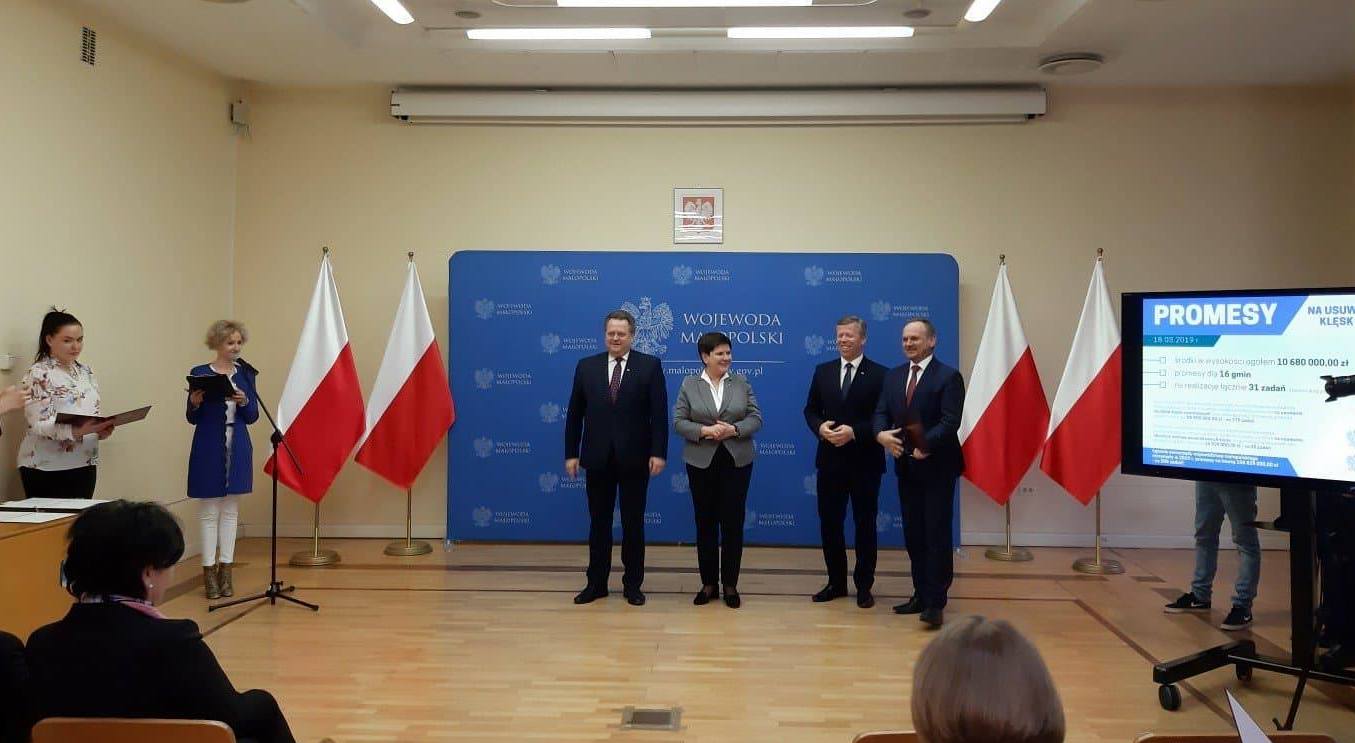 18 marca w Małopolskim Urzędzie Wojewódzkim w Krakowie miało miejsce wręczenie promes na usuwanie skutków klęsk żywiołowych dla samorządów w regionie. Premier Beata Szydło, wiceminister spraw wewnętrznych i administracji Jarosław Zieliński oraz wojewoda małopolski Piotr Ćwik przekazali wójtom i burmistrzom promesy na łączną kwotę niemal 10,7 mln zł. Jest to druga w tym roku transza środków dla Małopolski.