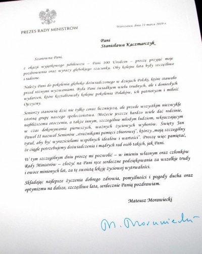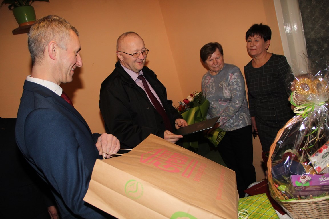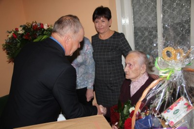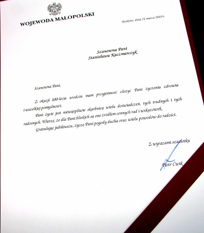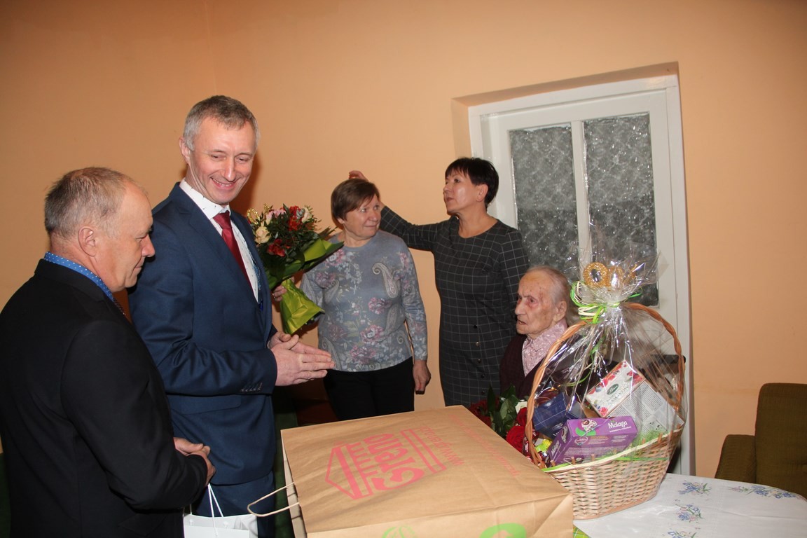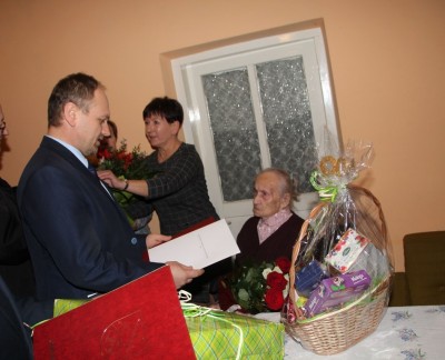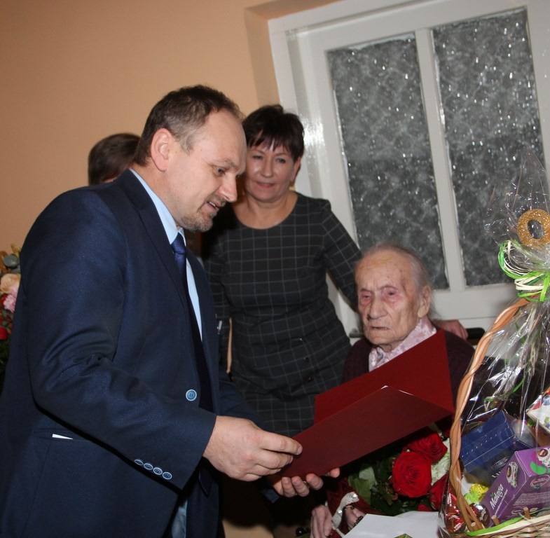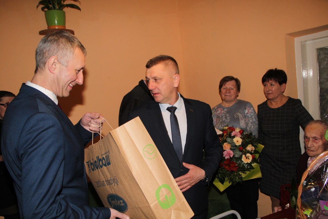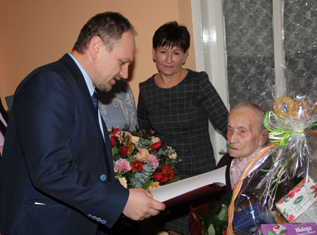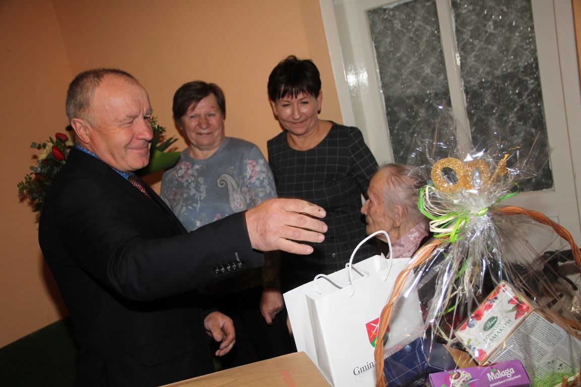 Wójt Gminy składając życzenia i gratulacje wręczył Jubilatce upominki, kwiaty oraz listy gratulacyjne od Prezesa Rady Ministrów Mateusza Morawieckiego oraz Wojewody Małopolskiego Piotra Ćwika.