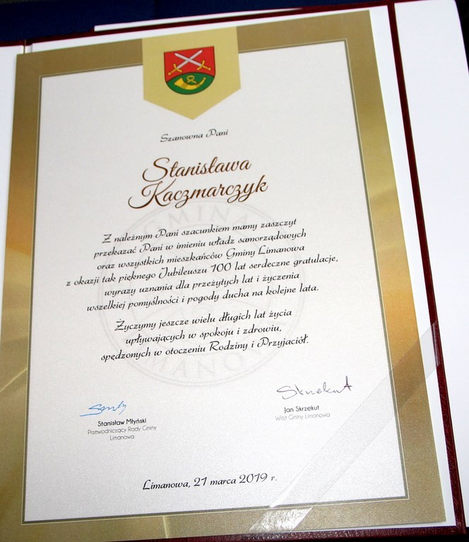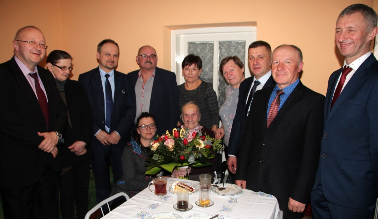 Szanując tak zacny jubileusz wizytę Pani Stanisławie złożyli wójt gminy Limanowa Jan Skrzekut, przewodniczący Rady Gminy Limanowa Stanisław Młyński, kierownik Urzędu Stanu Cywilnego Dariusz Dutka, sołtys wsi Stare Rybie Jerzy Kruczek oraz przedstawiciel Zus-u Limanowa.