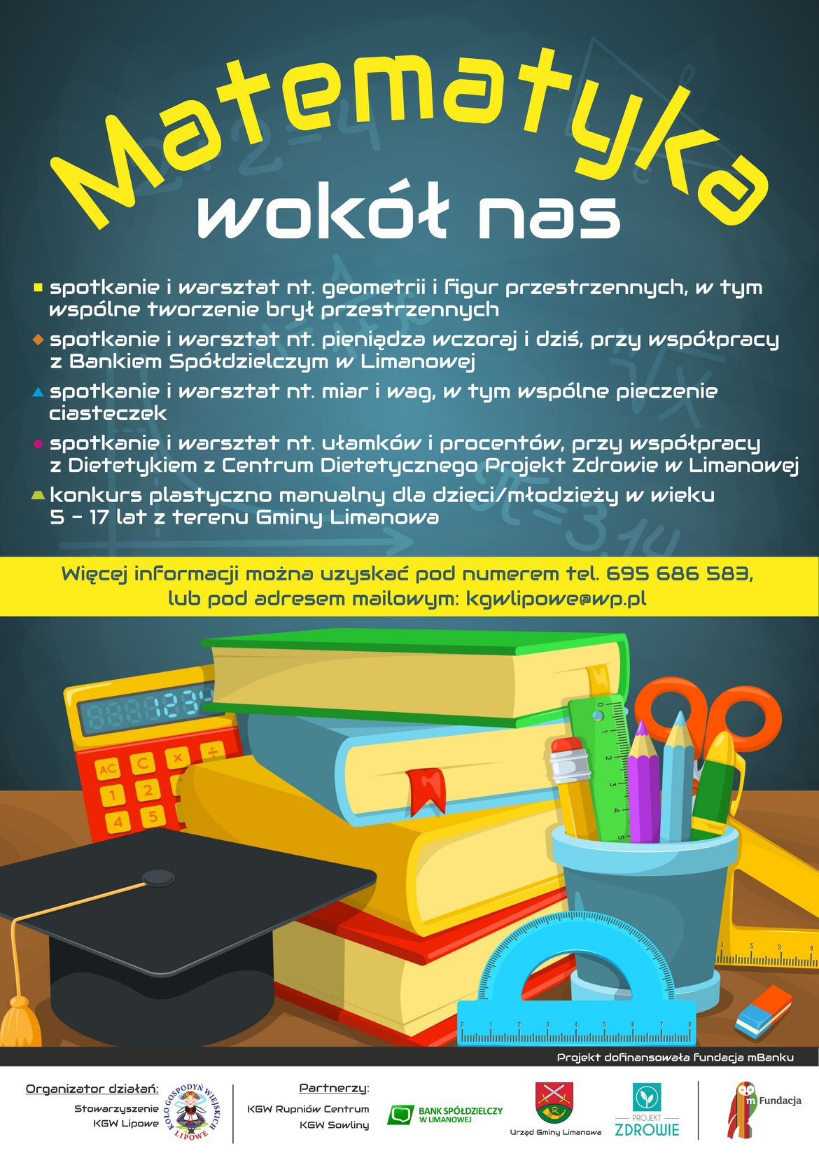 Stowarzyszenie KGW Lipowe otrzymało dofinansowanie z Fundacji mBanku na realizację projektu pn. ,,Matematyka wokół nas”. Projekt adresowany jest do dzieci zamieszkujących gminę Limanowa i zakłada zorganizowanie cyklu warsztatów matematycznych obejmujących różnorodne zagadnienia życia codziennego.
