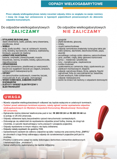 Przypominamy mieszkańcom o zbliżających się terminach wywozu odpadów wielkogabarytowych. Odbior będzie się odbywał równolegle do wywozu śmieci w terminach i miejscowościach określonych w terminarzu gminy Limanowa. Informujemy rownież , że  kolejne wywozy gabarytów planowane są w  lipcu oraz październiku.