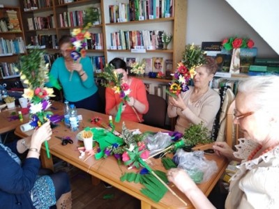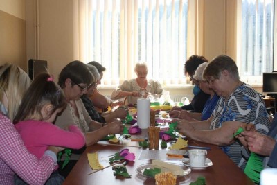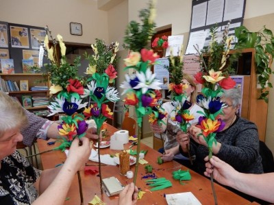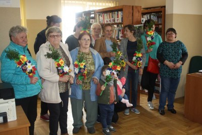Warsztaty cieszyły się dużym zainteresowaniem zarówno wśród dzieci, jak i seniorów, o czym świadczą załączone poniżej zdjęcia. Uczestnicy dzielnie przez około trzy godziny robili kwiaty z bibuły, które następnie stały się ozdobą palm. Nie mogło zabraknąć także, gałązek wierzbowych i bukszpanu, które są podstawą każdej tradycyjnej palmy. I tak rdzeniem palmy był prosty patyk, kijek i gałązki wierzby z rozwiniętymi kotkami. Palma wielkanocna ma być kolorowa jak wiosna, ma dawać nadzieję, bo nadzieja rodzi się wiosną, jak przyroda budzi się do życia. Toteż palmy mieniły się wieloma kolorami tęczy i zostały przyozdobione bukszpanem oraz bibułkowymi kwiatami: żonkilami, krokusami, makami. Trzeba przyznać, że końcowy efekt zachwycił wszystkich. Wszyscy solidarnie podkreślali także terapeutyczną wartość spotkań. Był to czas, kiedy można było się na chwilę oderwać od codziennych spraw. Tworzenie rękodzieła działa relaksująco, kiedy po ciężkim i stresującym dniu zasiadamy do pracy, nad której detalami musimy skupić się na tyle, by móc tym samy zapomnieć o trudach minionego dnia. Zajmowanie się rękodziełem niewątpliwie przynosi każdemu twórcy wiele korzyści. Dostarcza satysfakcji z ręcznie wykonanego dzieła i daje przyjemności tworzenia. Czyż to nie wystarczająca zachęta, by zagłębić się w świat ręcznie wykonywanych cudów? Może jednak warto wrócić do korzeni i spróbować taką palmę wykonać samemu?