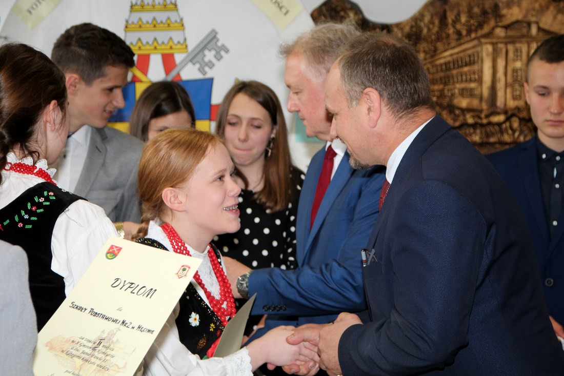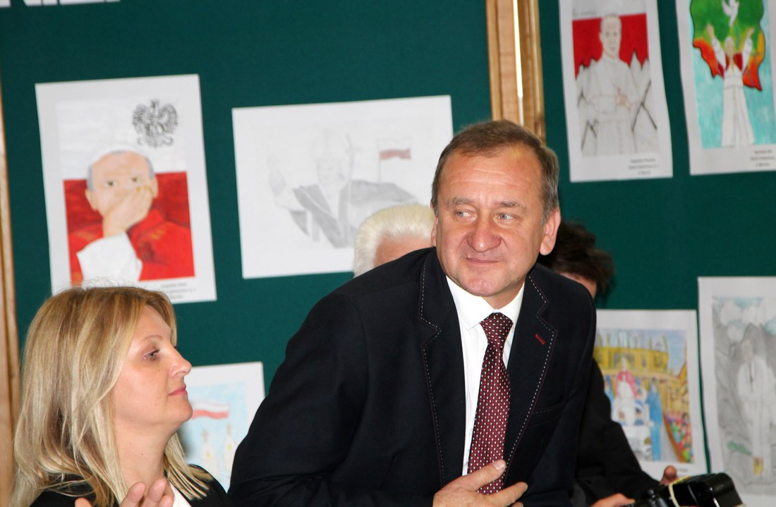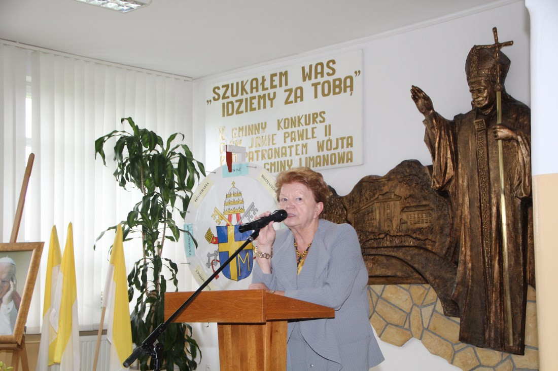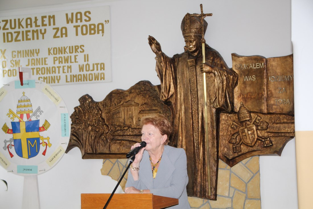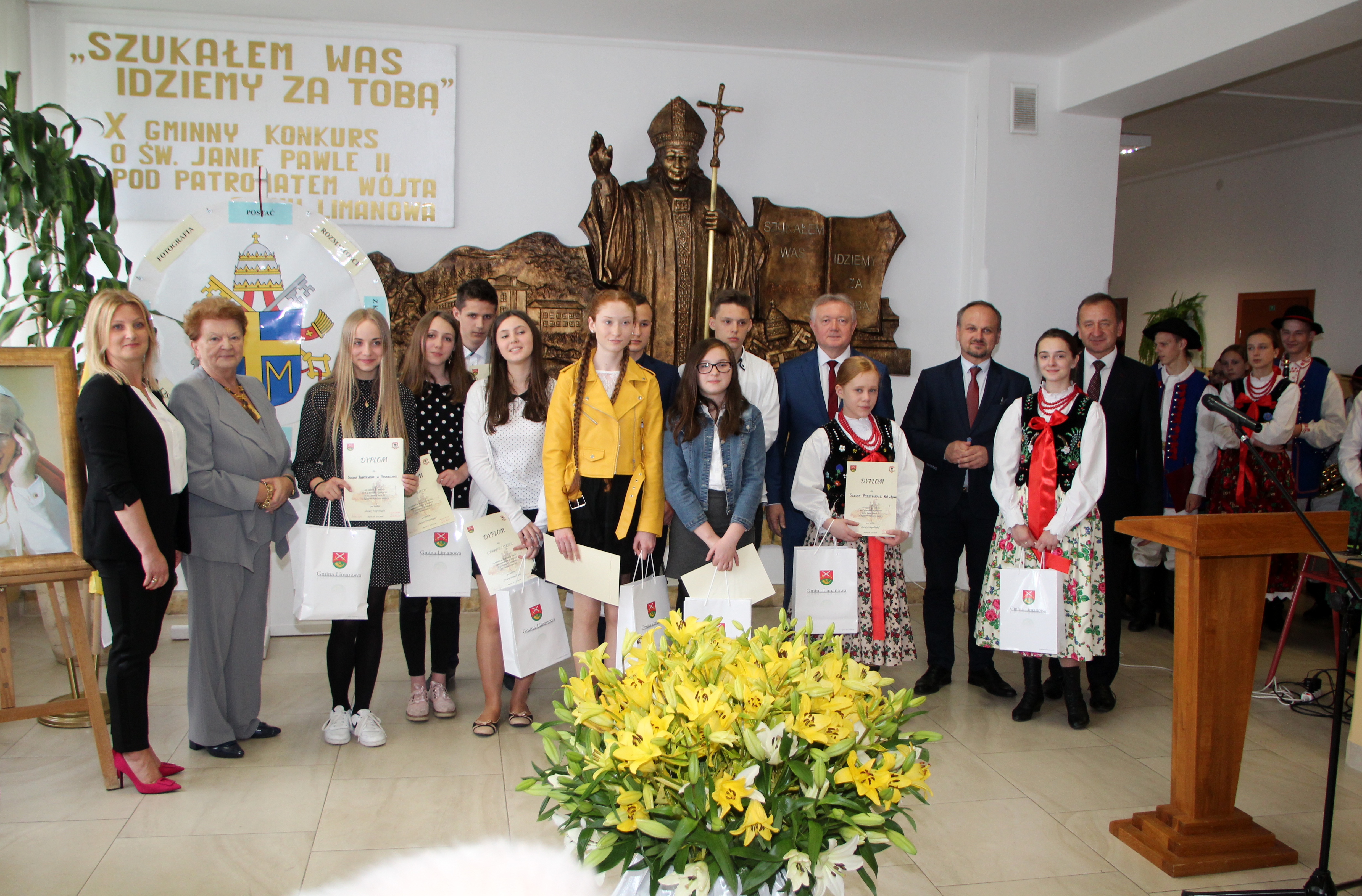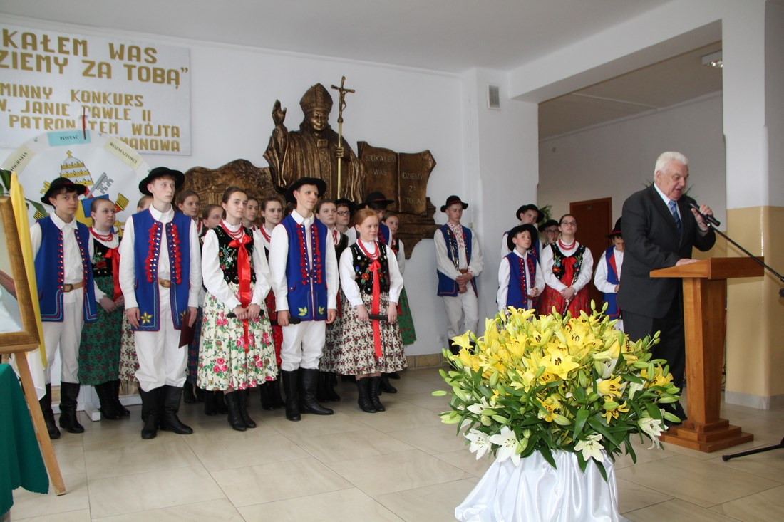 Konkurs przeznaczony dla klas VII, VIII i III gimnazjum przybrał formę teleturnieju, na który złożyły się cztery rundy pytań, przeplatane między innymi zadaniem muzycznym i poetyckim. Dwuosobowe drużyny musiały wykazać się dobrą znajomością źródeł podanych w regulaminie, a przede wszystkim znakomitą orientacją dotyczącą informacji i zdjęć zawartych w albumie pt. „Święty Niepodległej” oraz utworów muzycznych poświęconych osobie Jana Pawła II. W trakcie konkursowej rywalizacji uczestnicy bardzo dobrze poradzili sobie z dokończeniem limeryku, układaniem puzzli oraz uzupełnianiem tekstu z lukami, gdzie wykorzystano słowa piosenki „Moje miasto Wadowice”, w związku z czym ten etap konkursu został zwieńczony wspólnym odśpiewaniem tegoż utworu z udziałem publiczności. W wyniku zmagań konkursowych zwycięską okazała się drużyna ze Szkoły Podstawowej nr 1 w Męcinie. Drugie miejsce zajęli przedstawiciele Szkoły Podstawowej nr 2 w Męcinie, a na III miejscu uplasowała się drużyna reprezentująca Szkołę Podstawową z Pisarzowej.