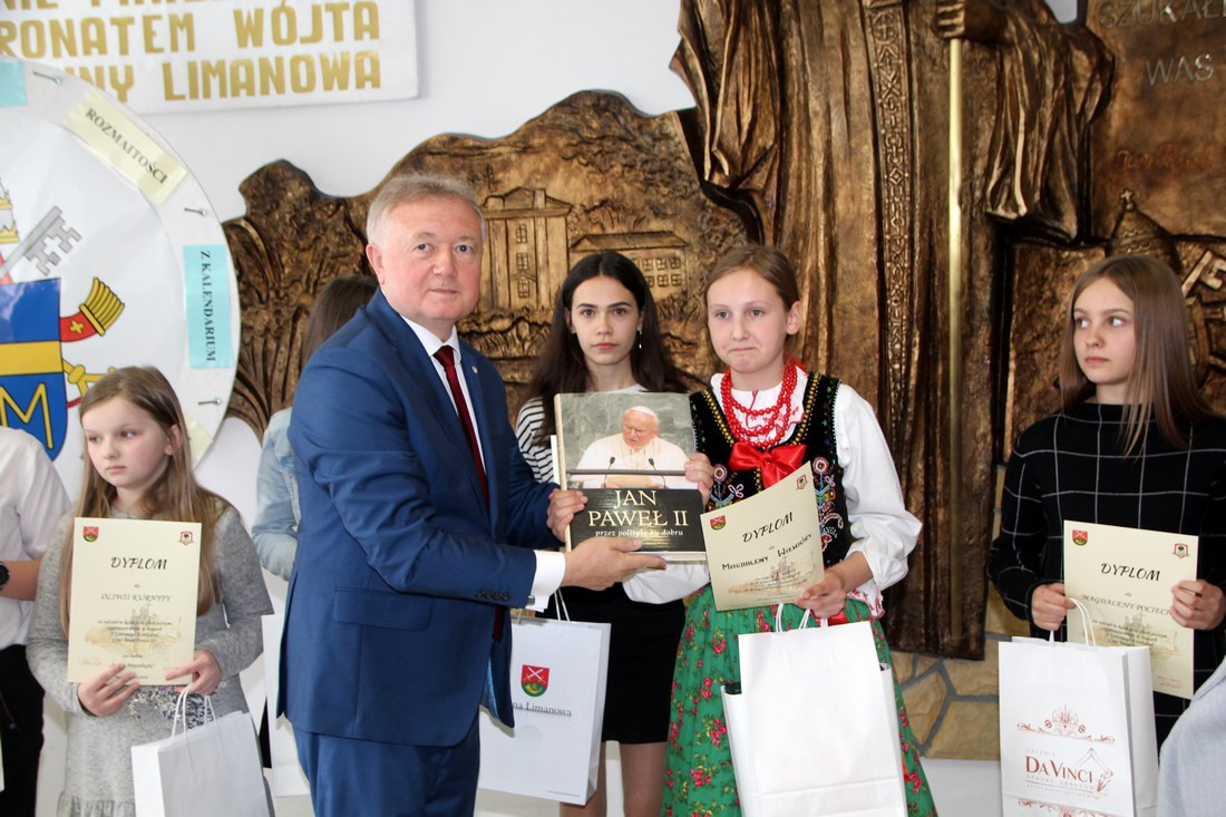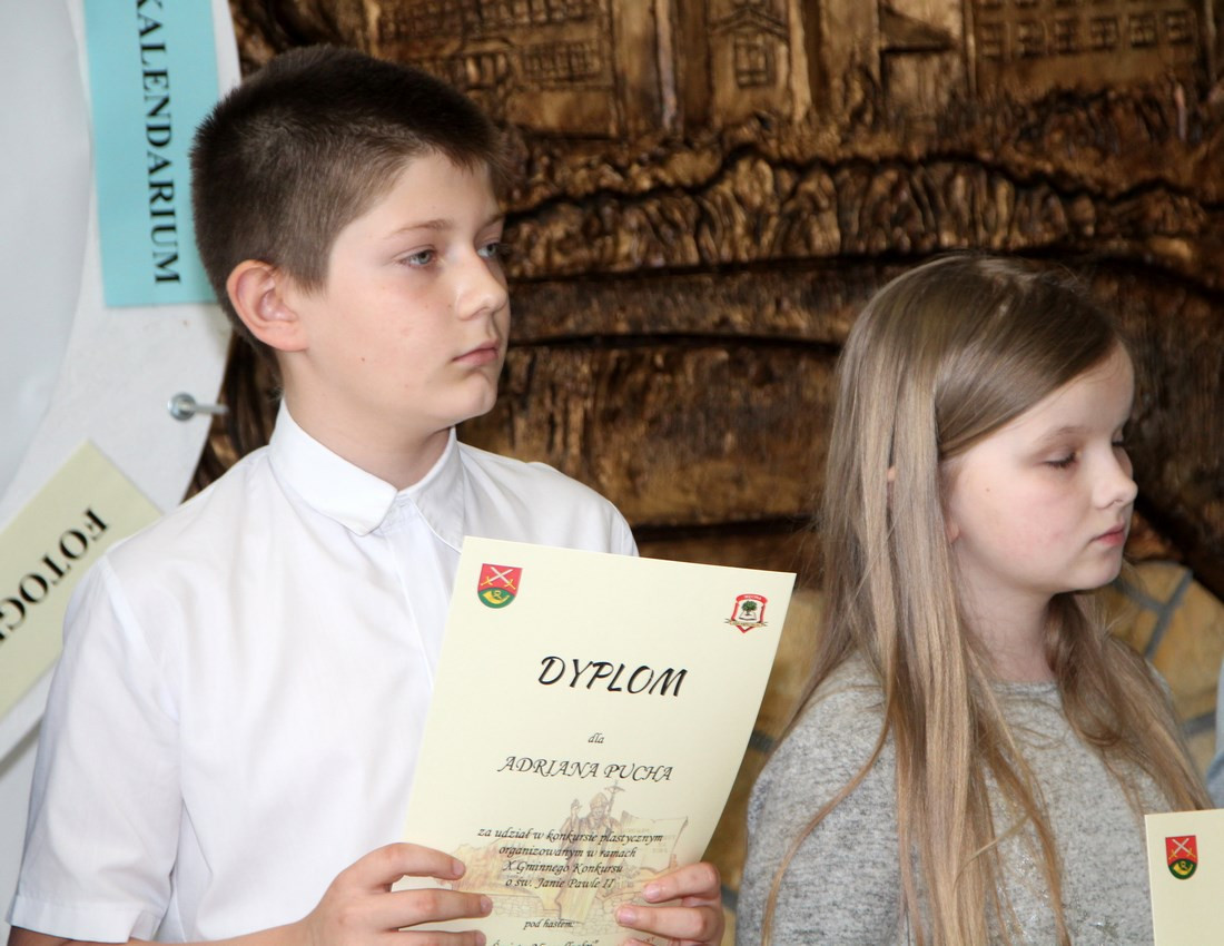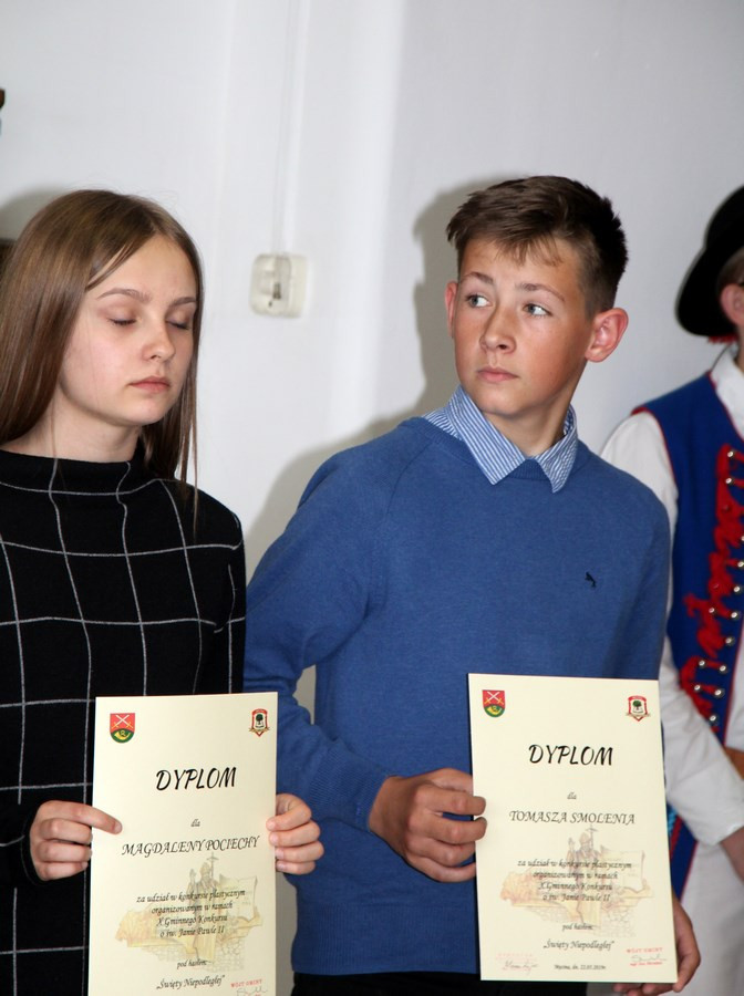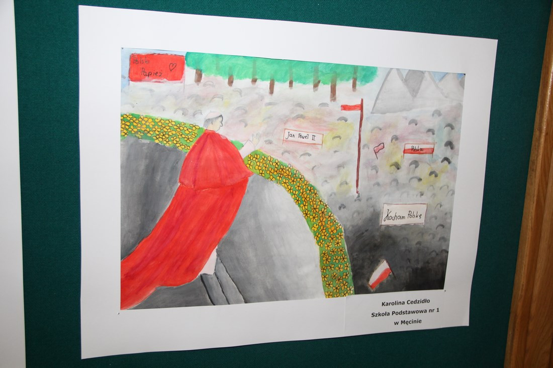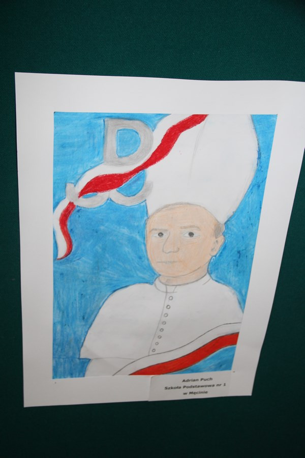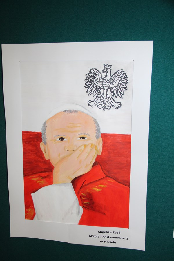 Z kolei konkurs plastyczny, którego motywem przewodnim było również hasło „Święty Niepodległej”, został rozstrzygnięty w wyniku obrad komisji powołanej przez dyrektora szkoły. W związku z tematyką prace plastyczne, których bohaterem był Jan Paweł II, zawierały różnorakie symbole nawiązujące do odzyskanej wolności. W kategorii najwyżej oceniono pracę Magdaleny Wiewióry (SP nr 1 w Męcinie), na II miejscu uplasowała się Angelika Zboś ( SP nr 1 w Męcinie), natomiast III miejsce przypadło w udziale Agnieszce Kicie (SP w Młynnem). Laureaci i uczestnicy konkursu otrzymali pamiątkowe dyplomy oraz nagrody rzeczowe, na które złożyły się: sprzęt multimedialny (tablety, słuchawki), przybory plastyczne w postaci profesjonalnego zestawu akcesoriów malarskich oraz słodycze. Nagrody ufundowali: Wójt Gminy Limanowa, Dyrekcja i Rada Rodziców Szkoły Podstawowej nr 1 w Męcinie oraz Poseł na Sejm RP.