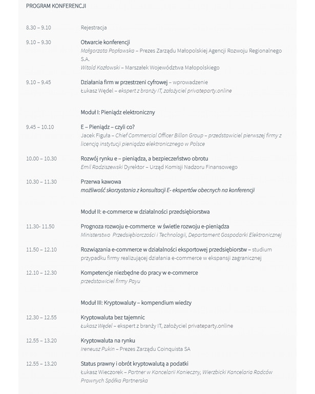 E-commerce jest obecnie jednym z najszybciej rozwijających się kanałów sprzedażowych. Rozmawiać będziemy więc o trendach i prognozach rozwoju rynku e-commerce, zasadach funkcjonowania e-pieniądza, fenomenie kryptowalut,   a wszystko po to, aby budować przewagę konkurencyjną małopolskich firm aktywnie działających w przestrzeni cyfrowej oraz tych, którzy swoją wktywność w tej przestrzeni chcieliby wzmocnić.